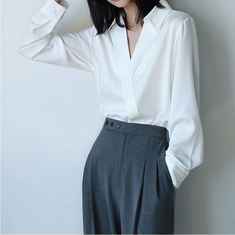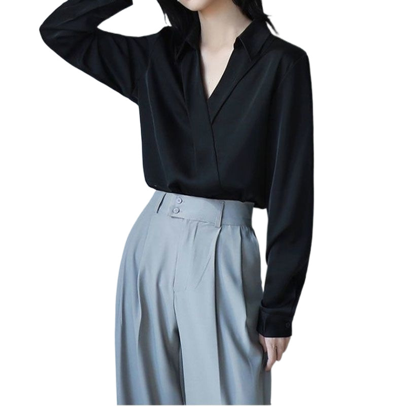 法式雪纺V领黑色衬衫女设计感小心机春秋季宽松显瘦气质长袖衬衣
