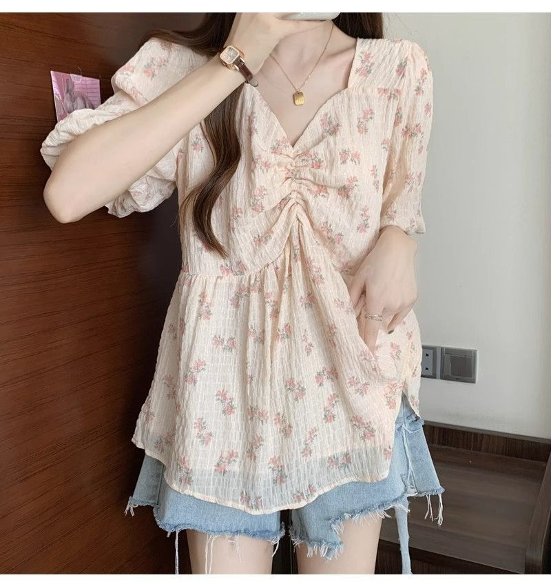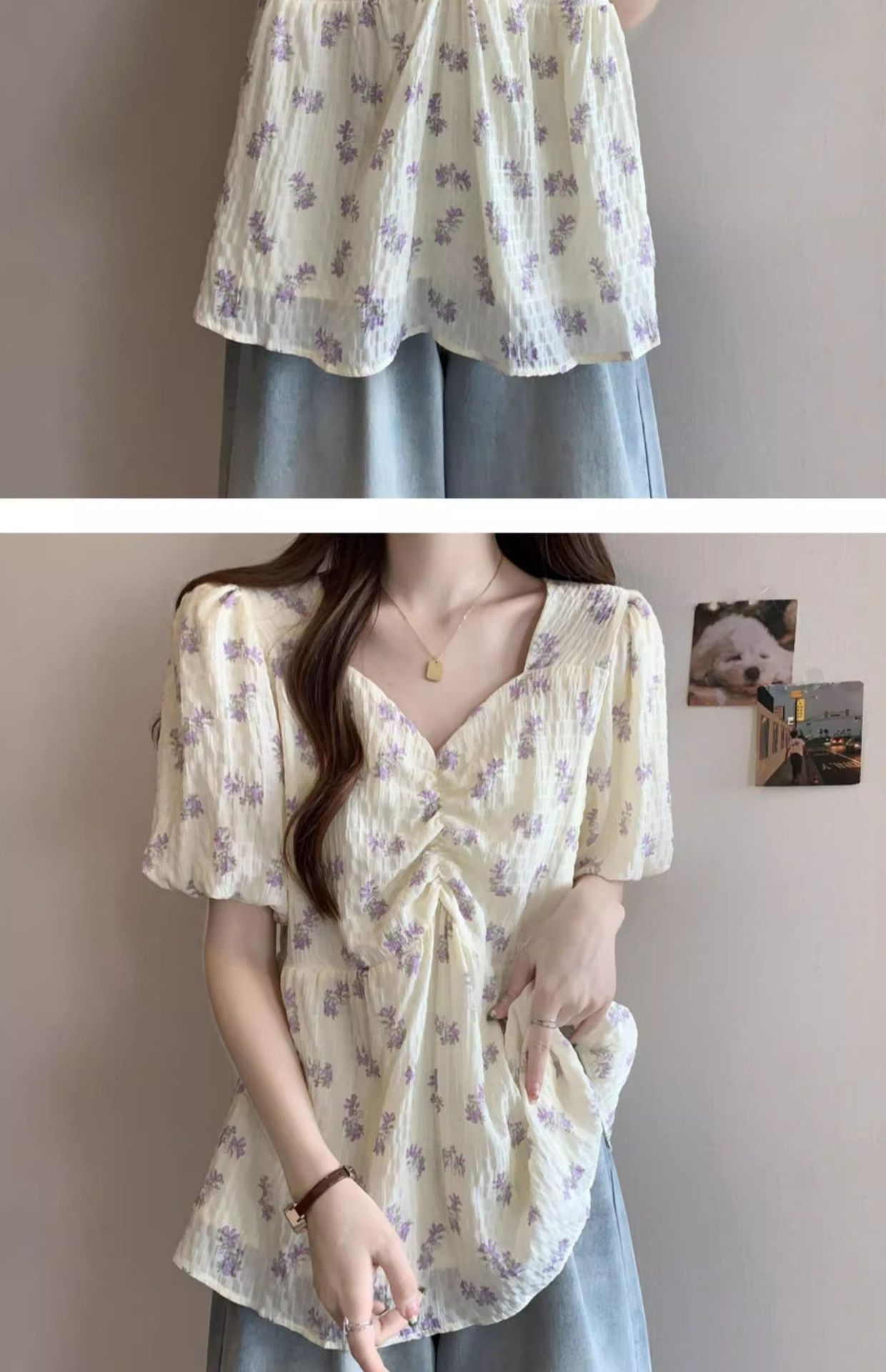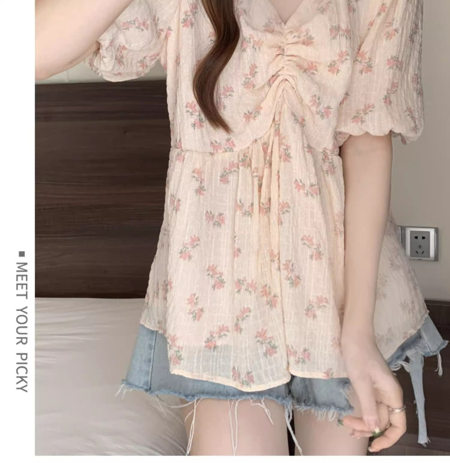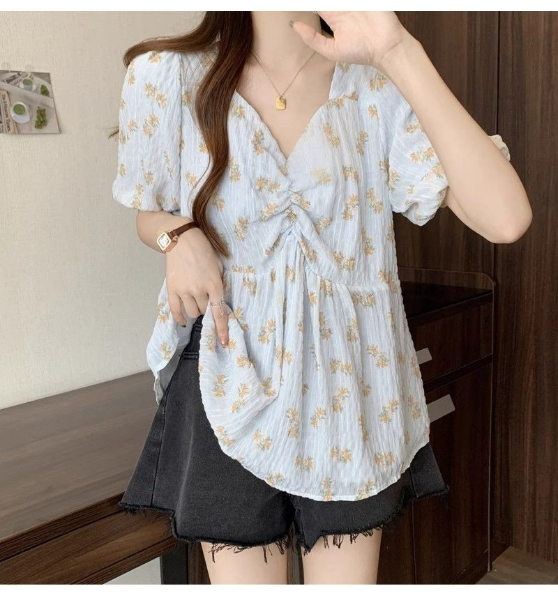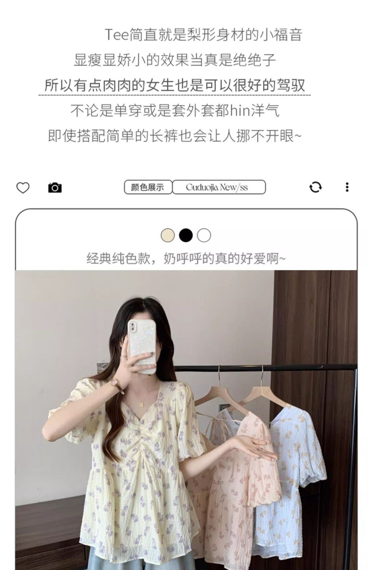 프렌치 브이넥 꽃무늬 쉬폰 반팔 셔츠 여름 플러스 사이즈 여성용 뚱뚱한 mm 루즈 슬리밍 살 커버 셔츠 탑