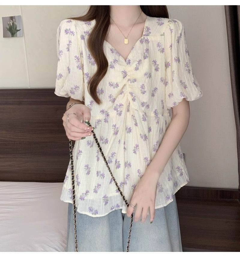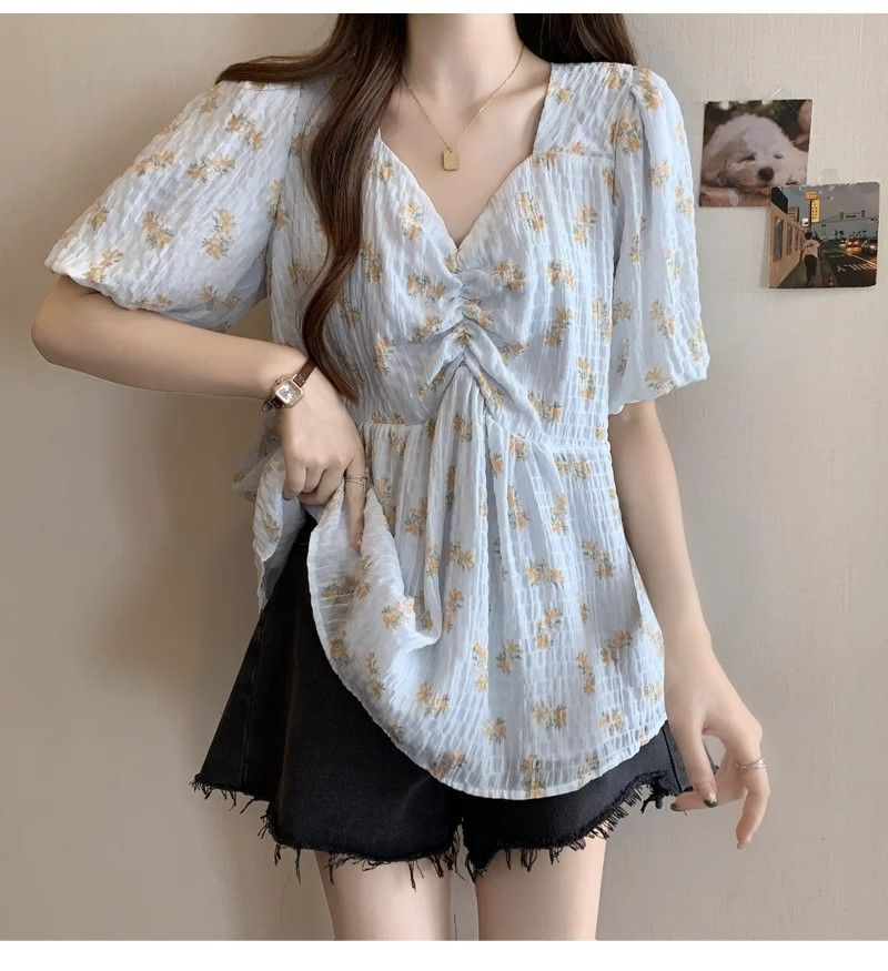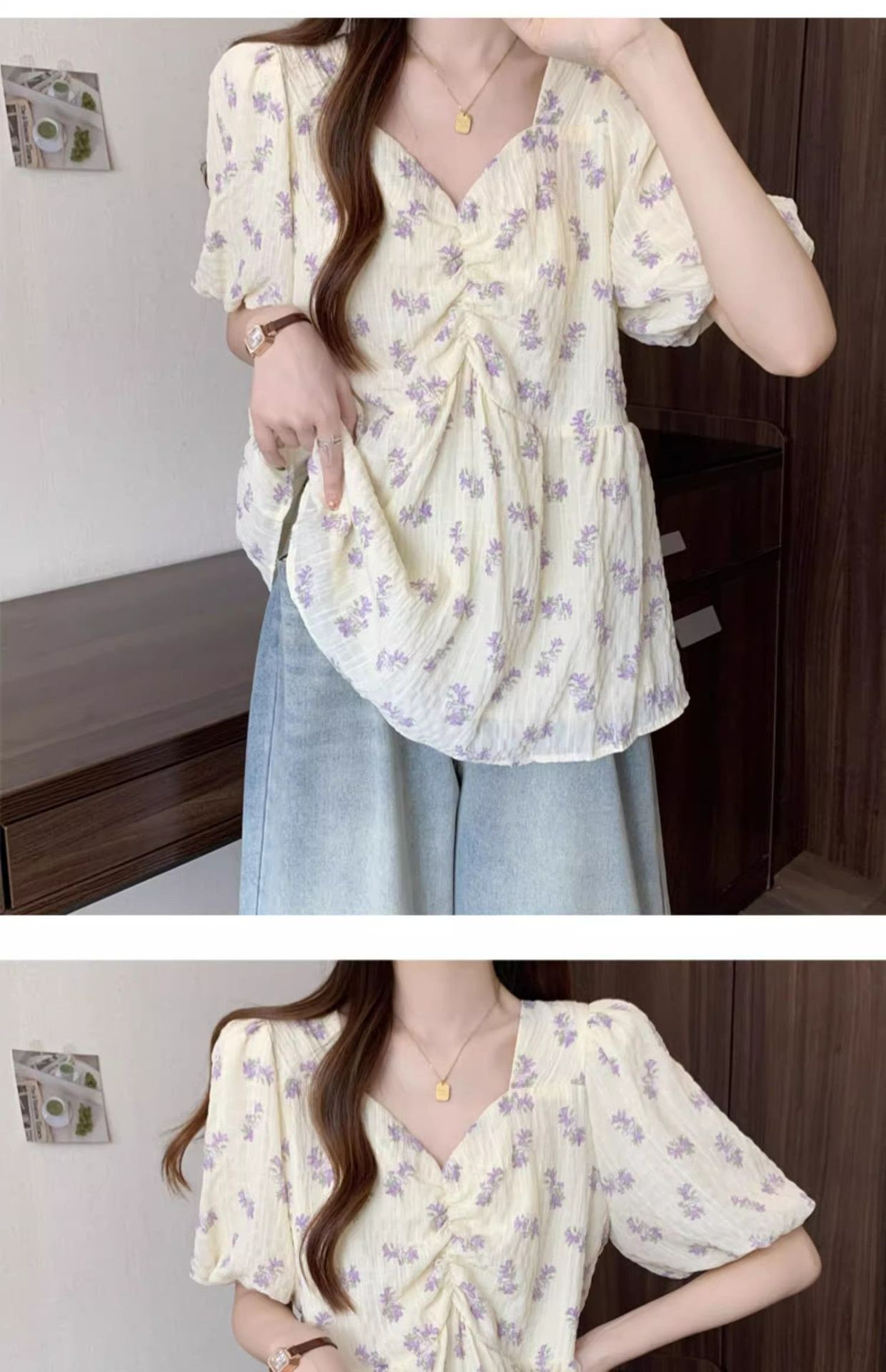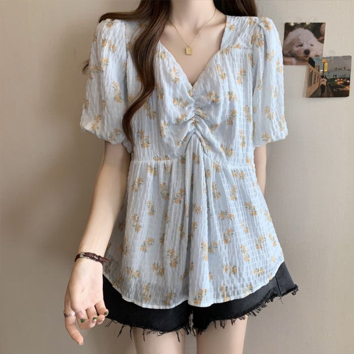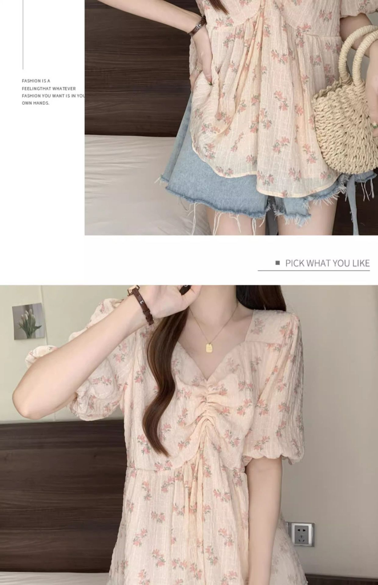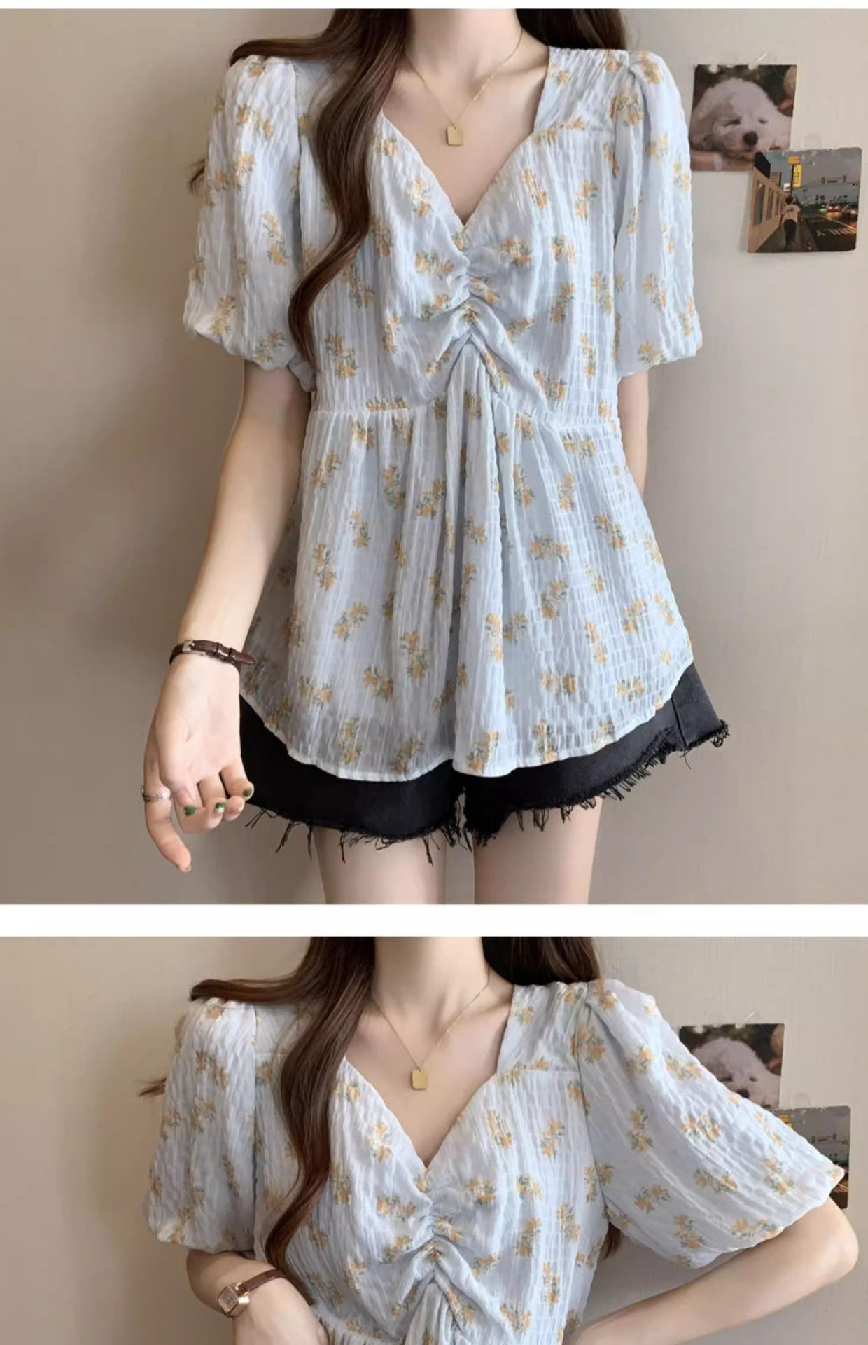 프렌치 브이넥 꽃무늬 쉬폰 반팔 셔츠 여름 플러스 사이즈 여성용 뚱뚱한 mm 루즈 슬리밍 살 커버 셔츠 탑