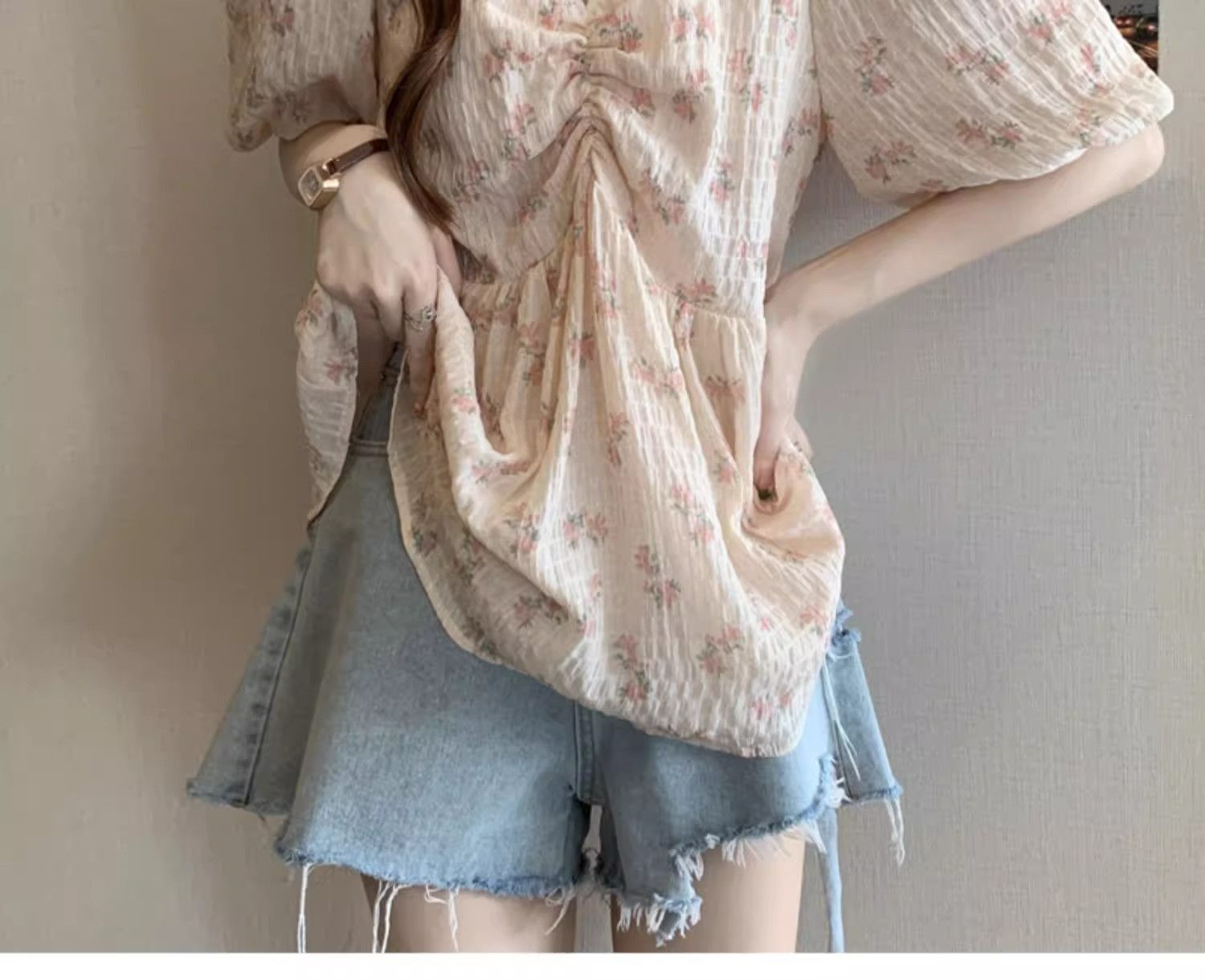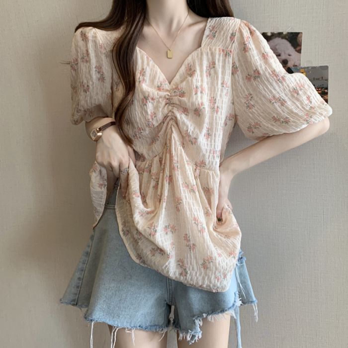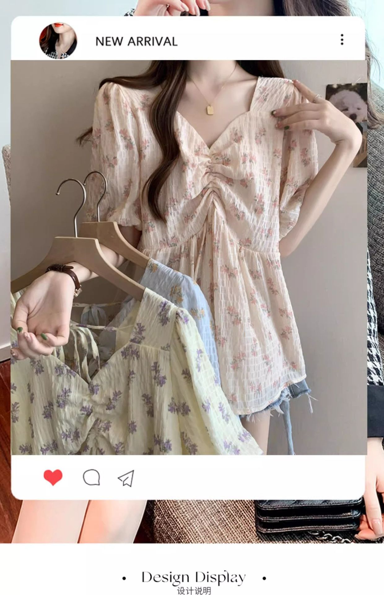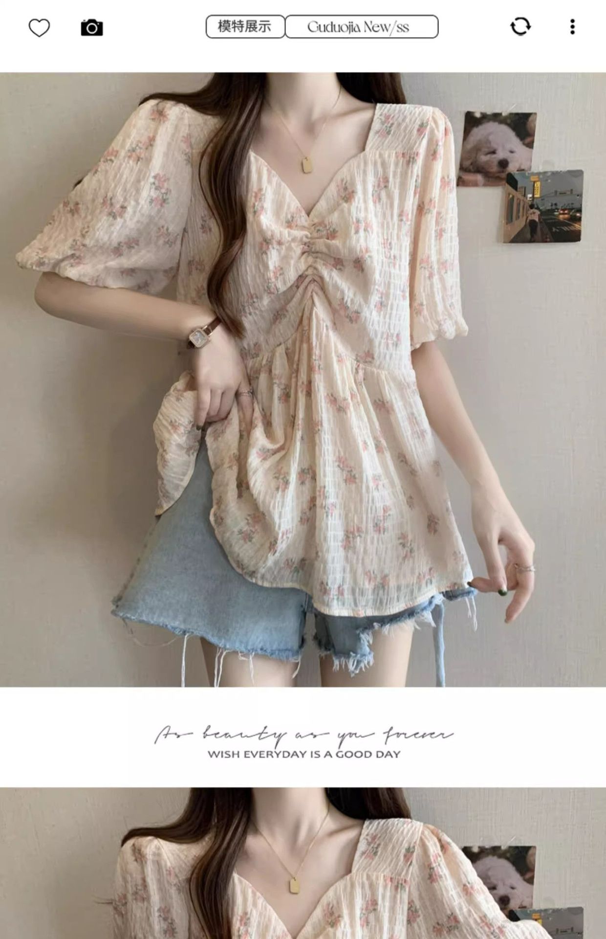 프렌치 브이넥 꽃무늬 쉬폰 반팔 셔츠 여름 플러스 사이즈 여성용 뚱뚱한 mm 루즈 슬리밍 살 커버 셔츠 탑스토어 가기