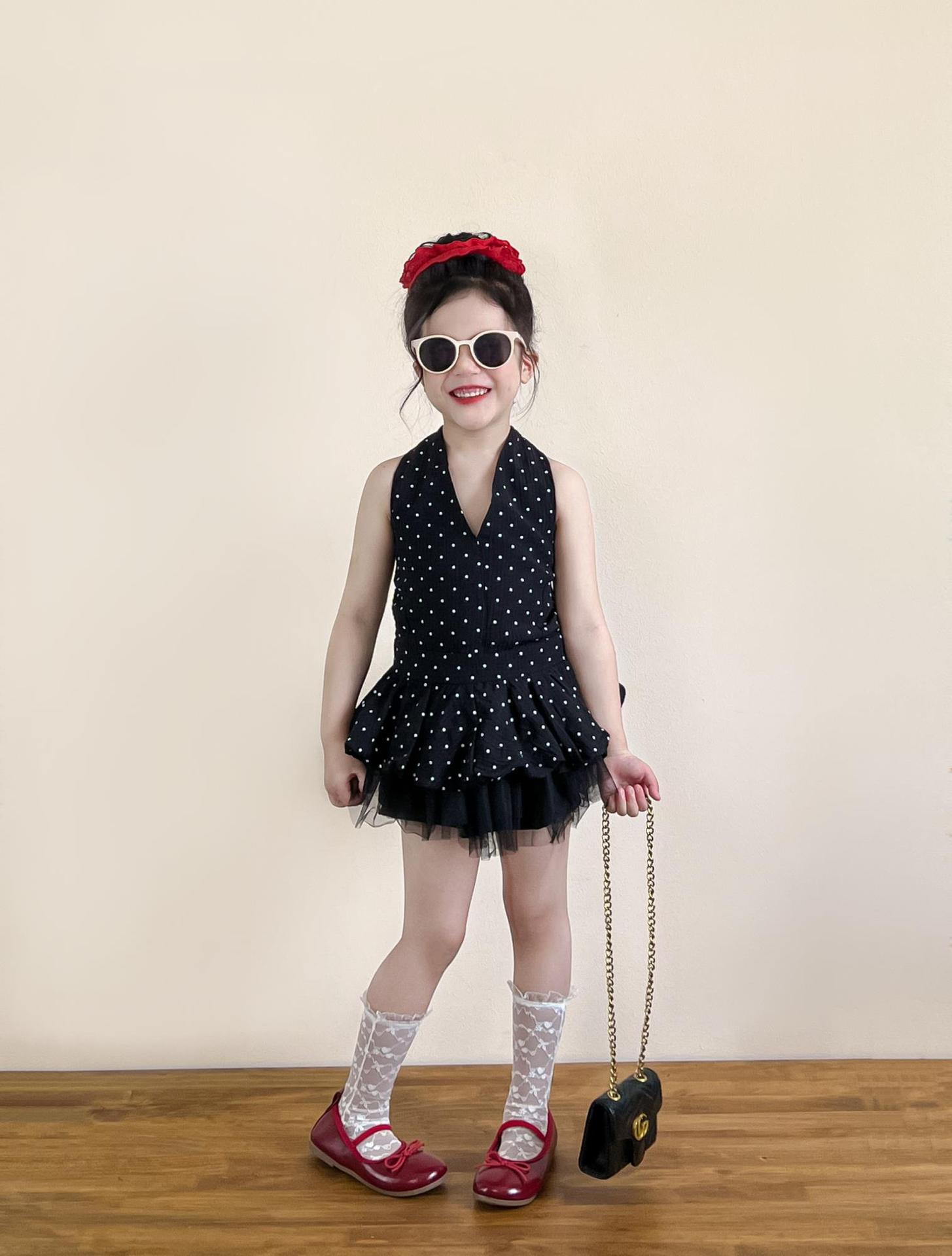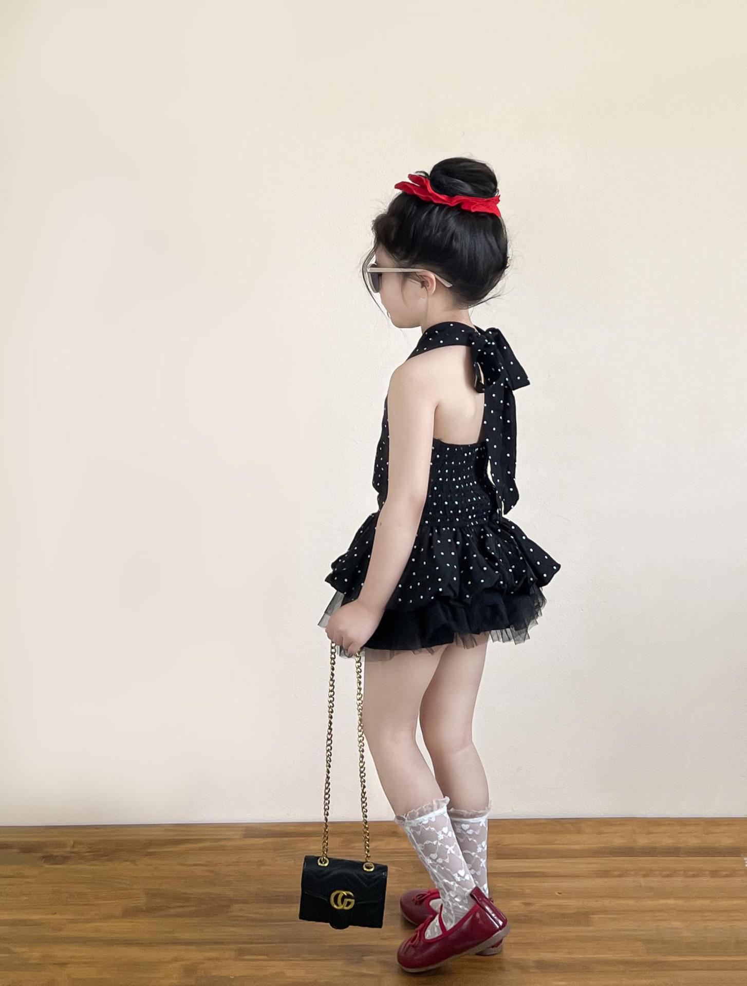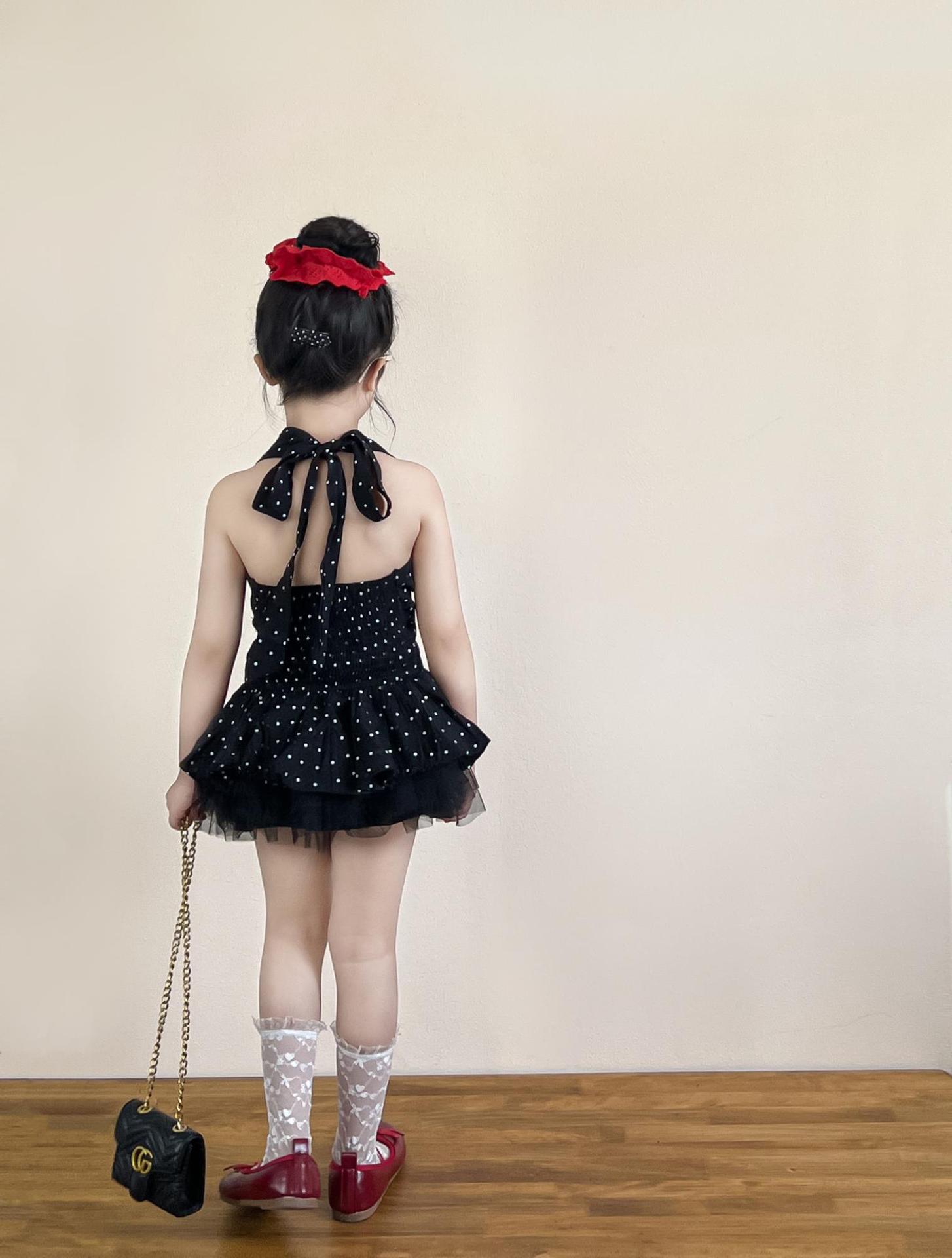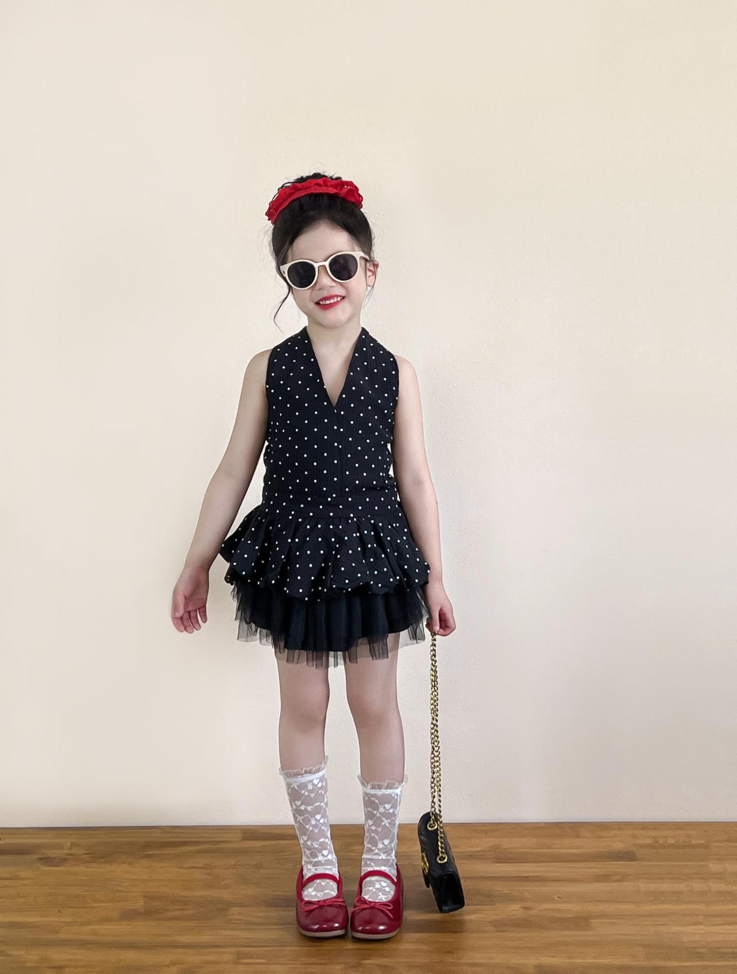 여아 여름 코디 백리스 홀터넥 튜브탑 레이스업 도트무늬 캐미솔 탑 + 블랙 하프 스커트 별도로 촬영