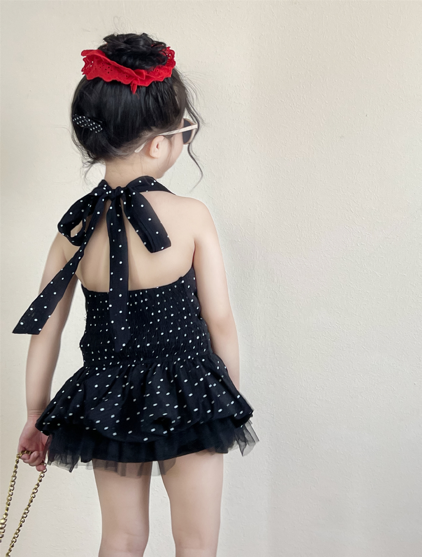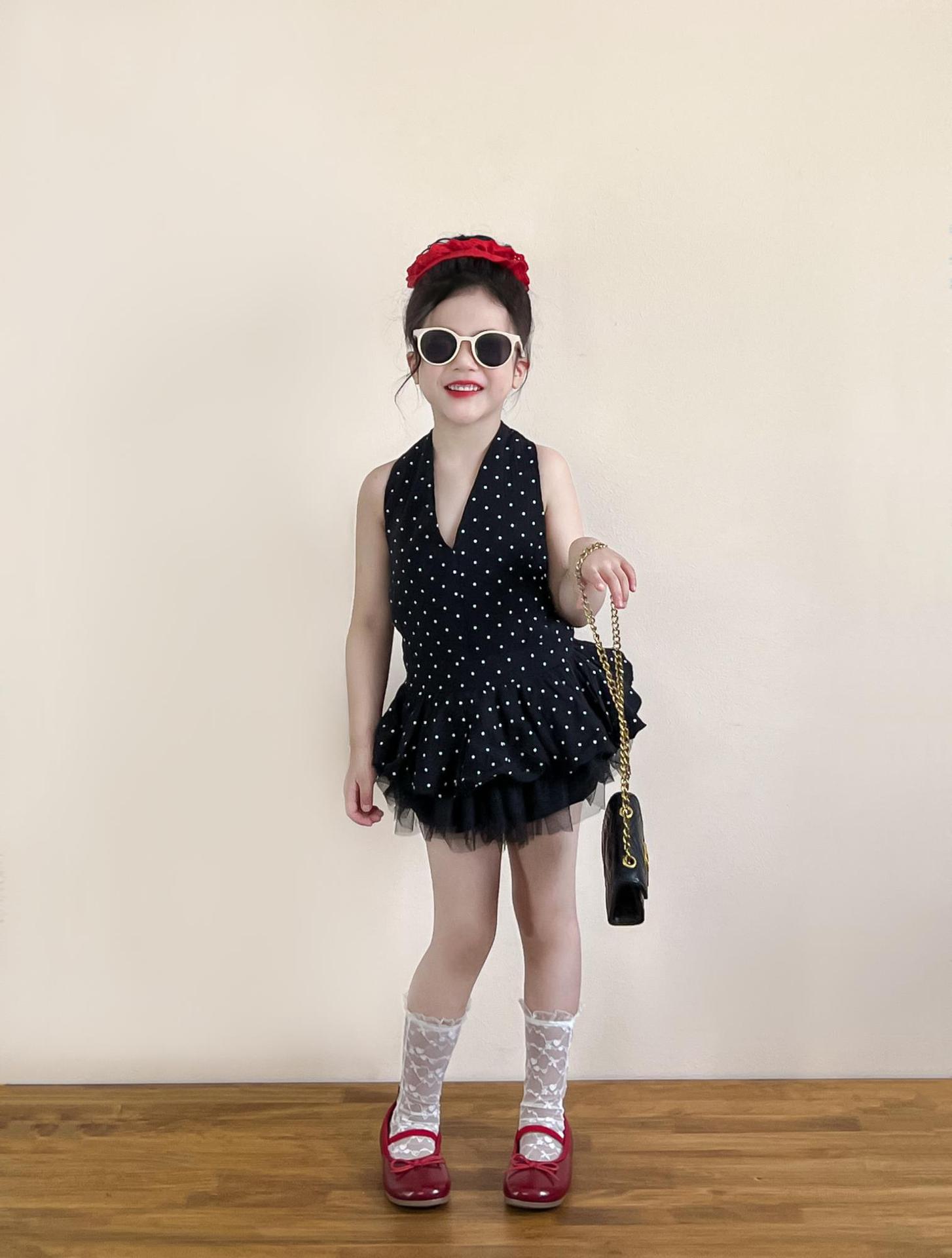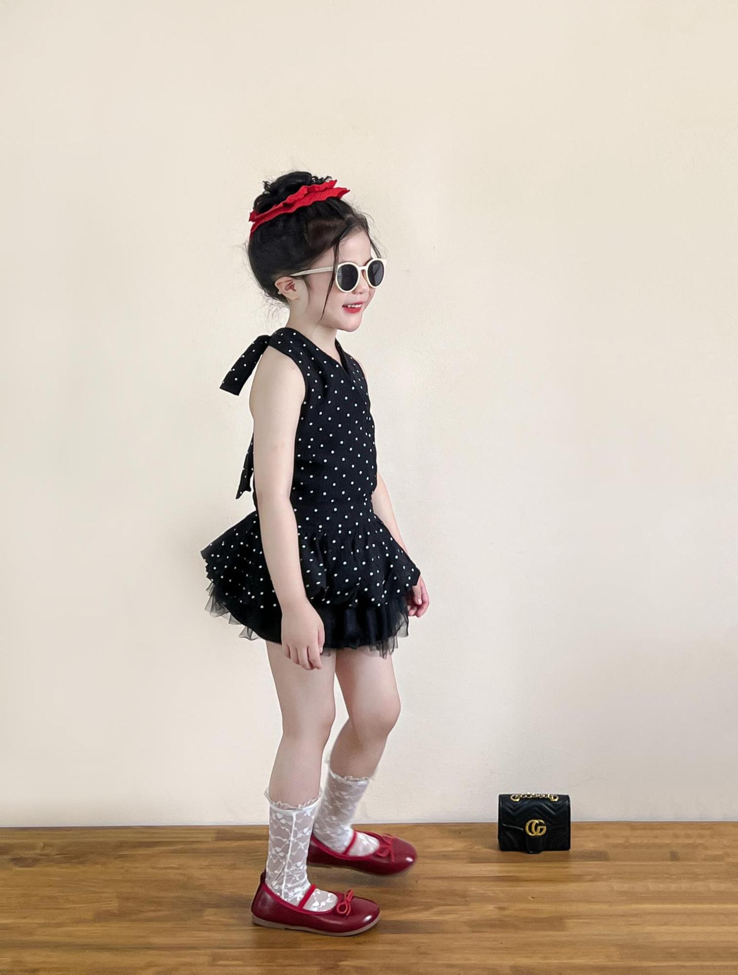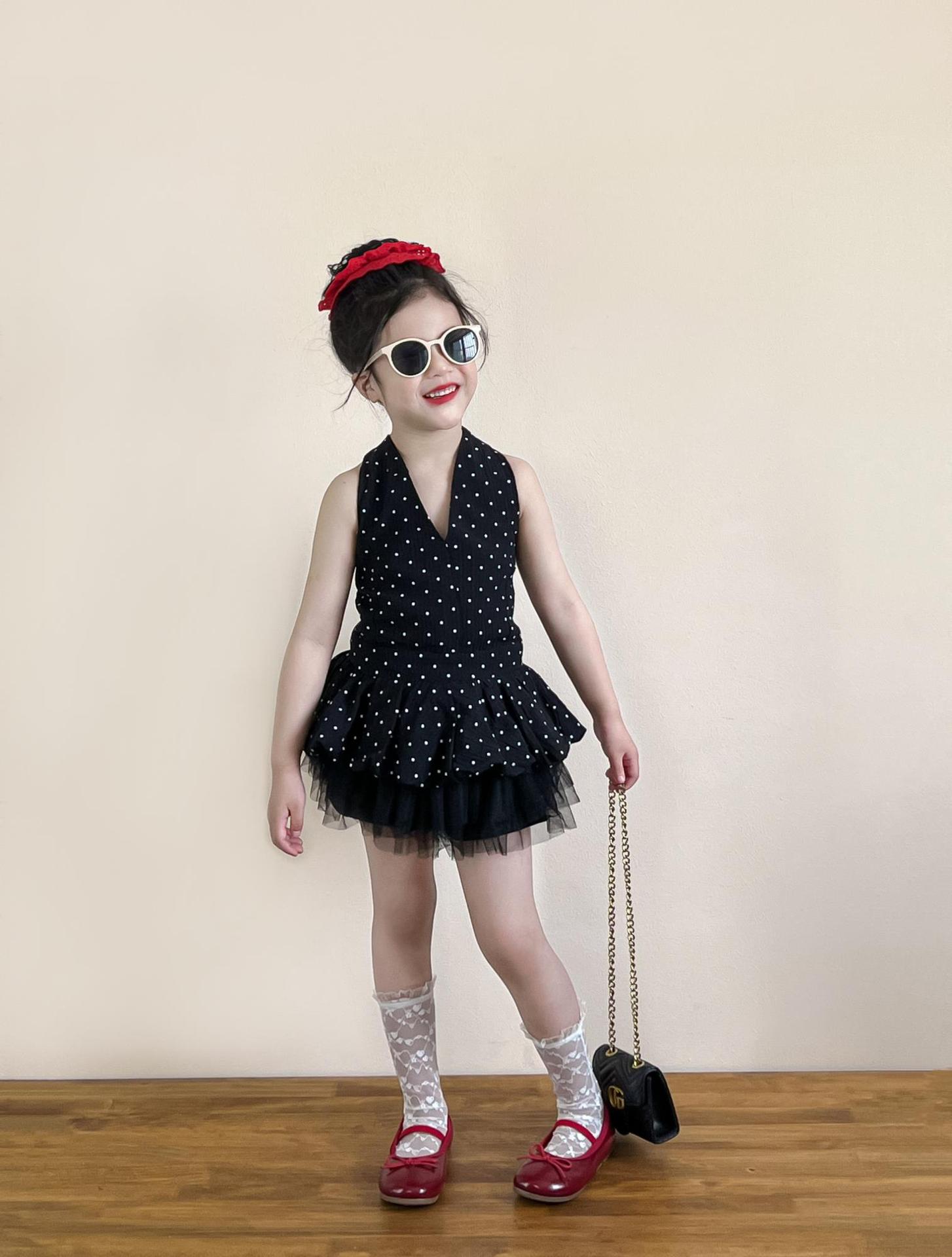 여아 여름 코디 백리스 홀터넥 튜브탑 레이스업 도트무늬 캐미솔 탑 + 블랙 하프 스커트 별도로 촬영