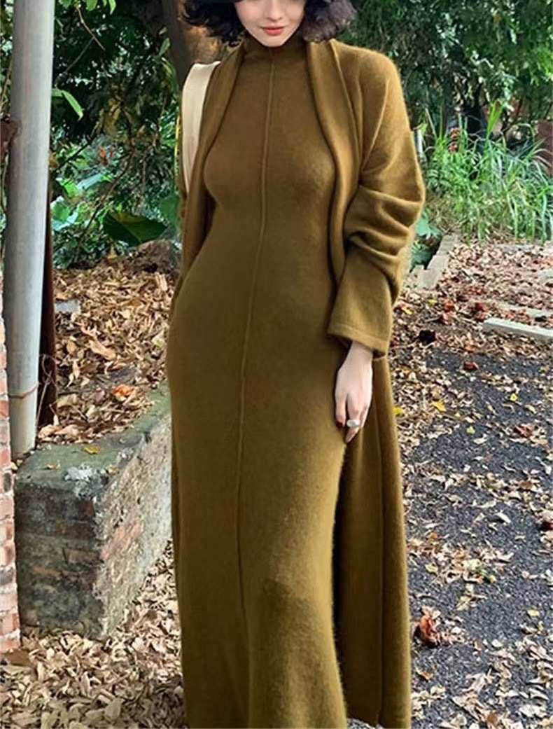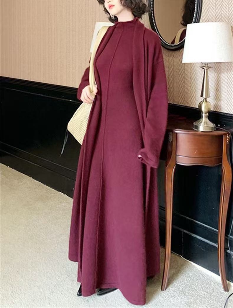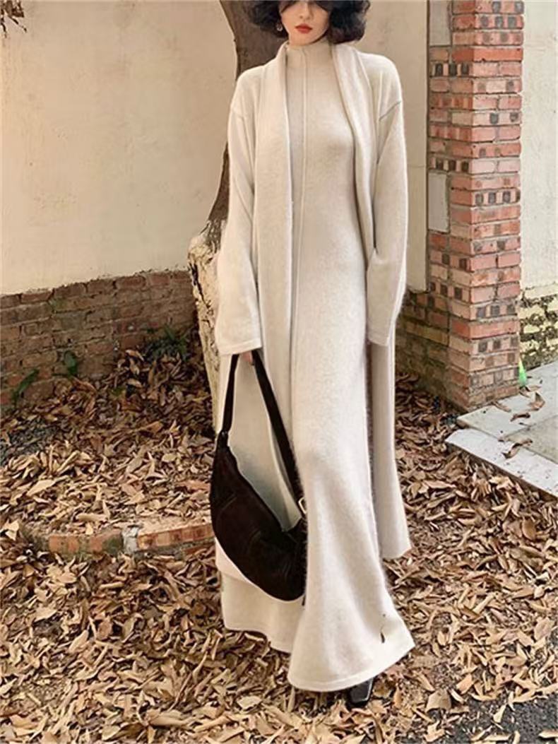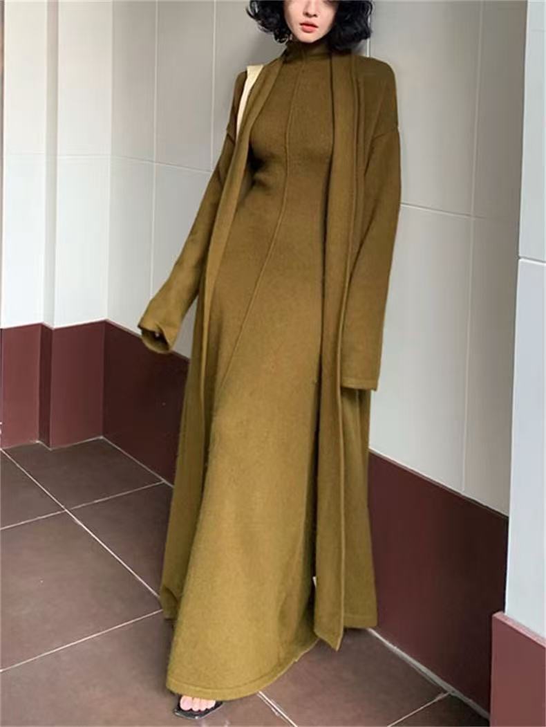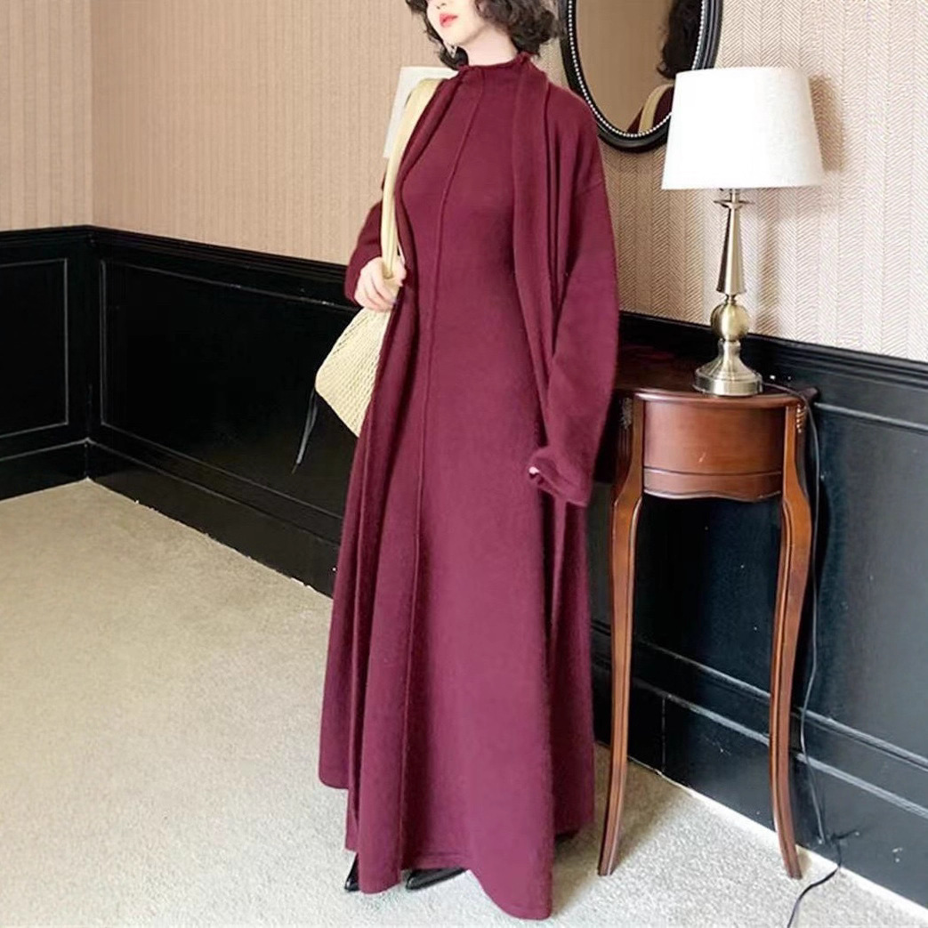 우아한 여성스러운 스타일의 롱 스웨터 세트 여성 가을 겨울 신상 레이지 스타일 니트 가디건+원피스 투피스 세트