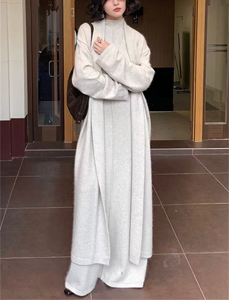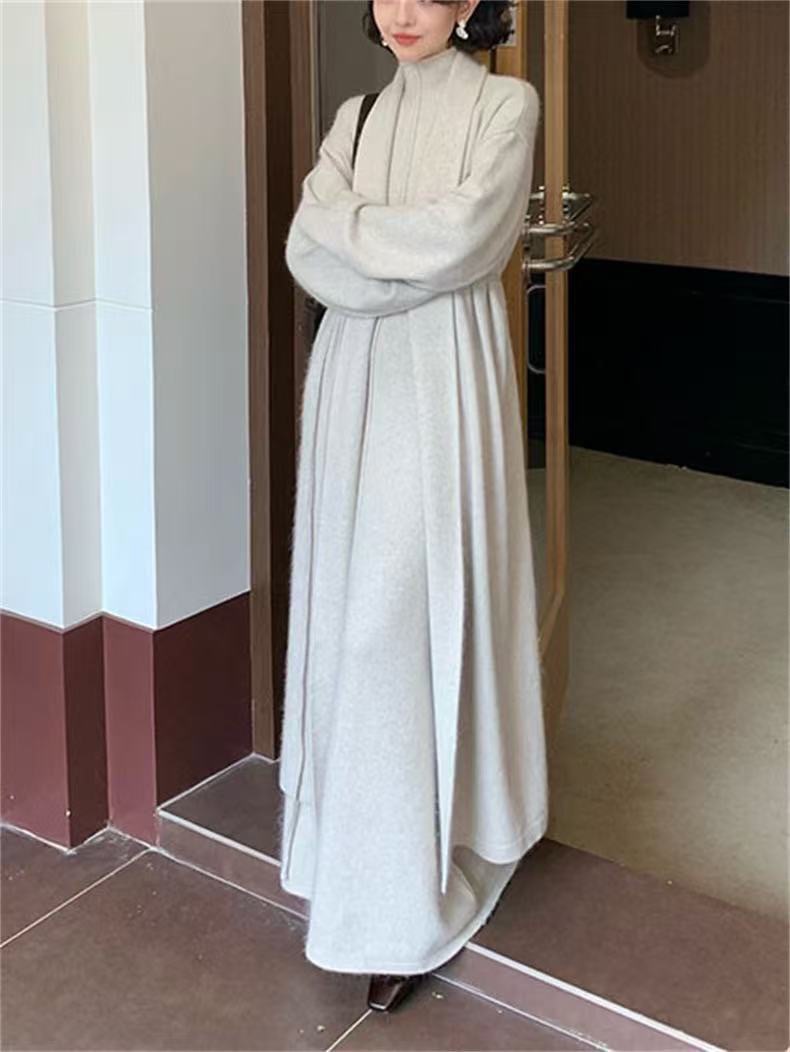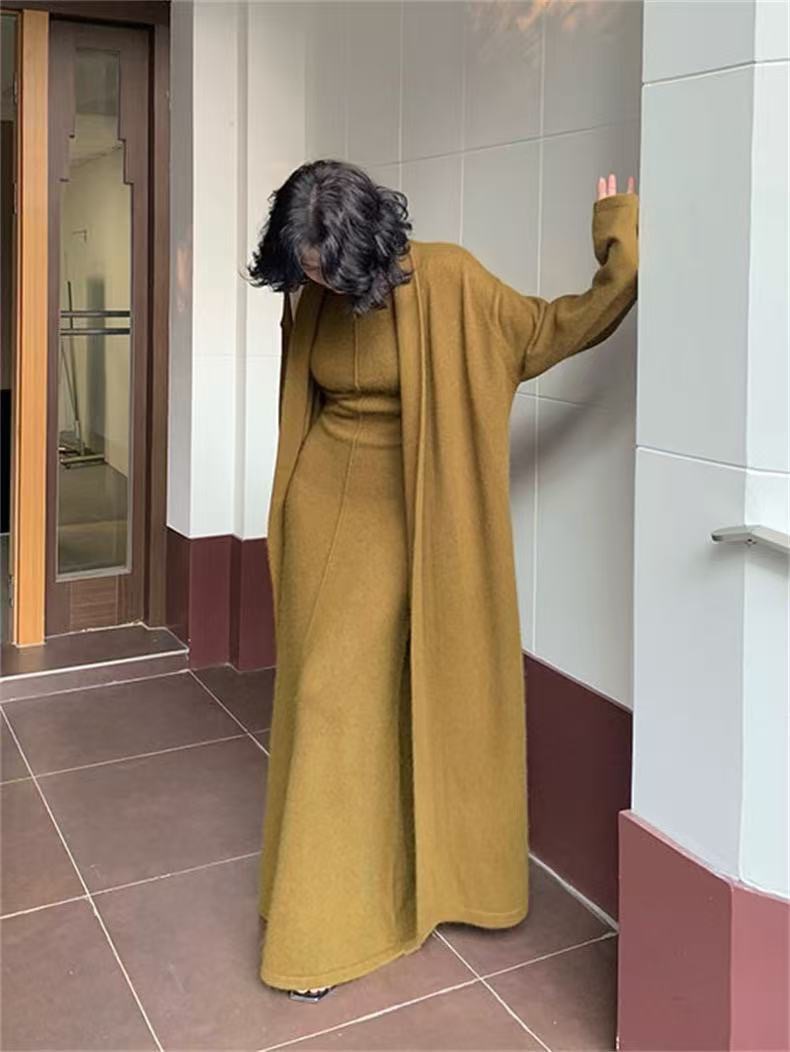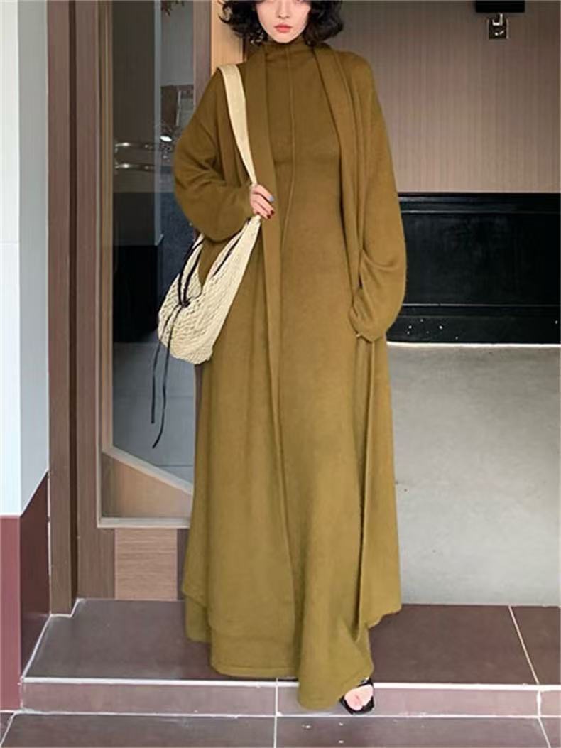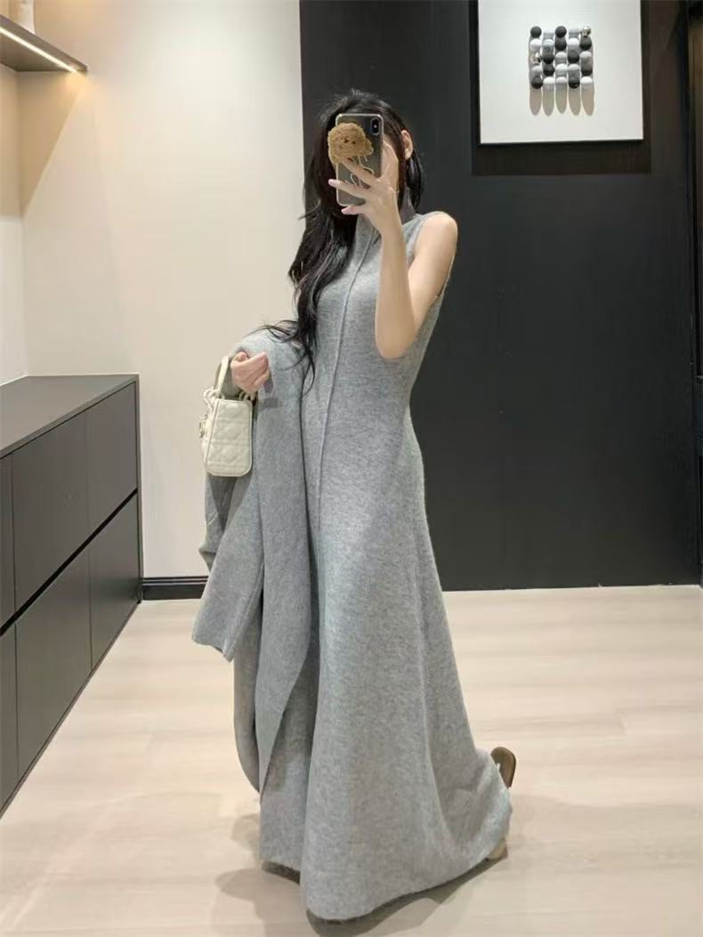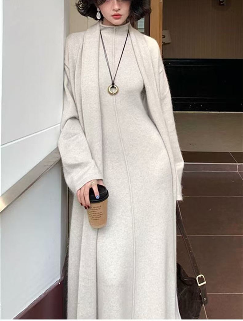 우아한 여성스러운 스타일의 롱 스웨터 세트 여성 가을 겨울 신상 레이지 스타일 니트 가디건+원피스 투피스 세트