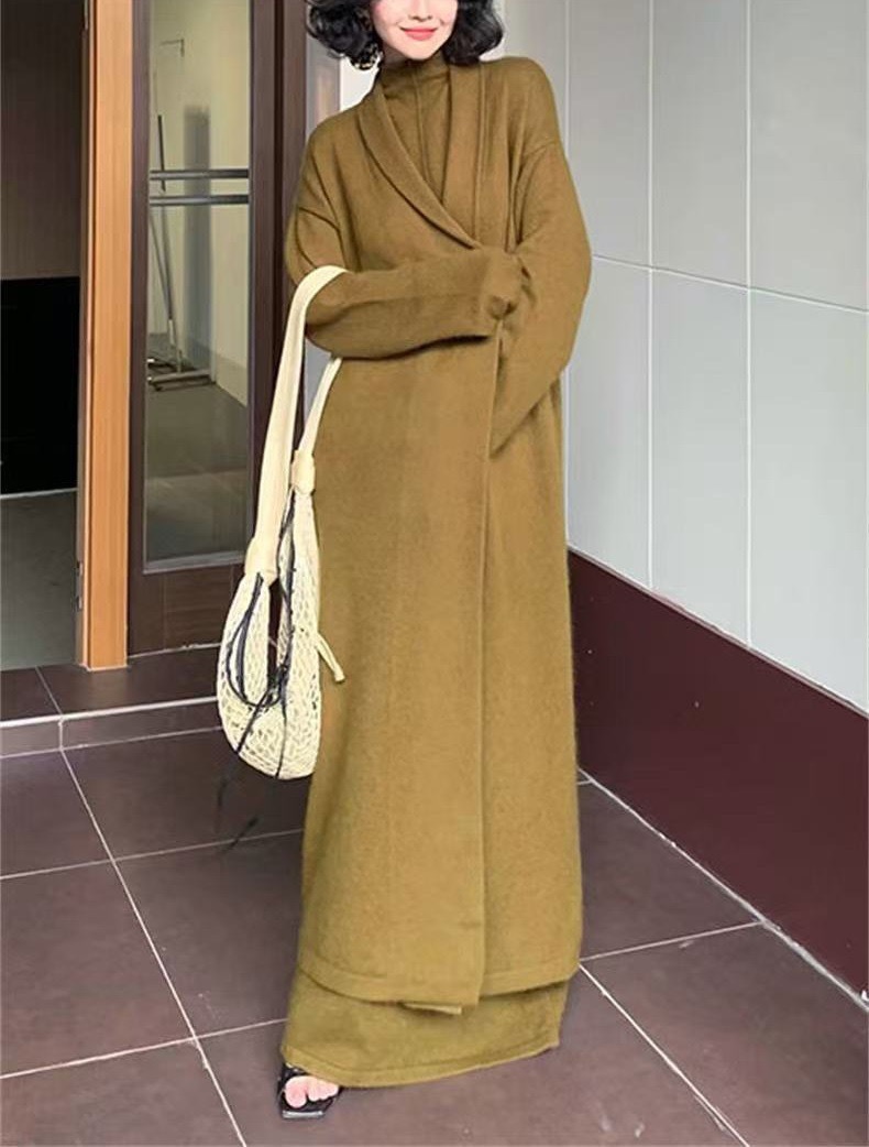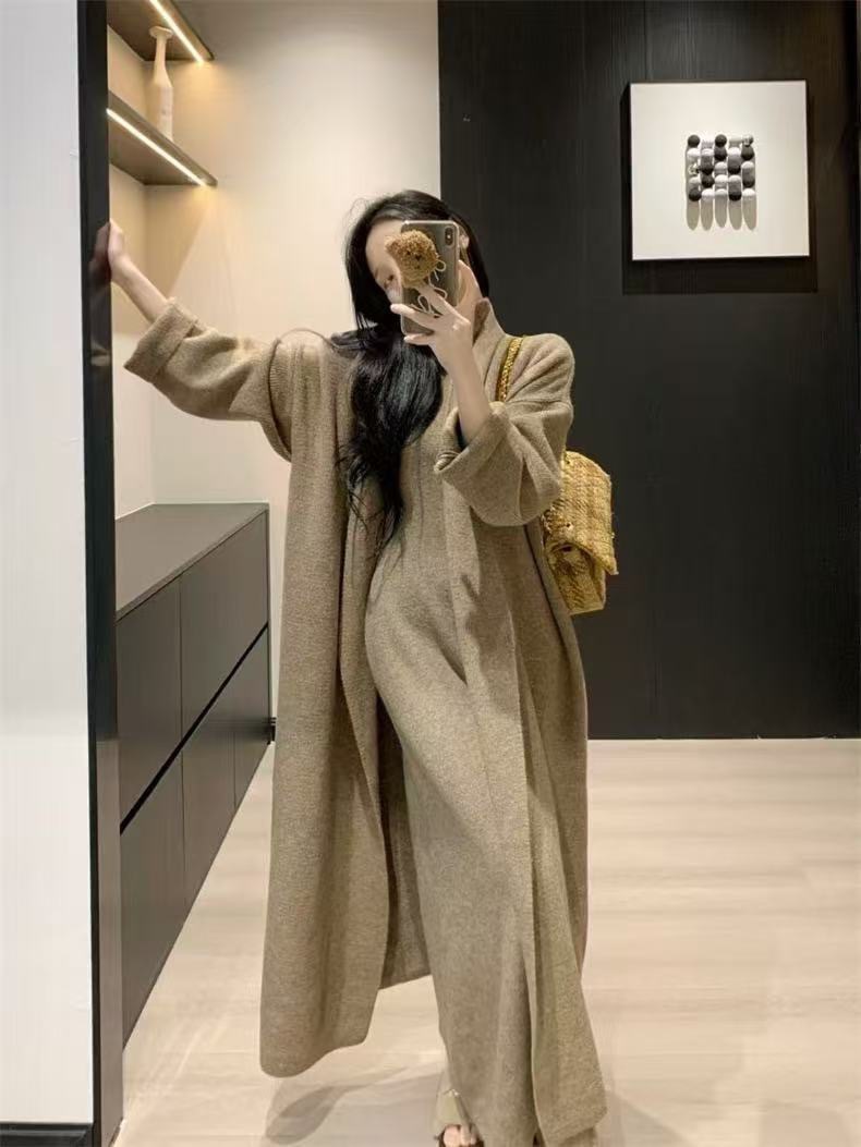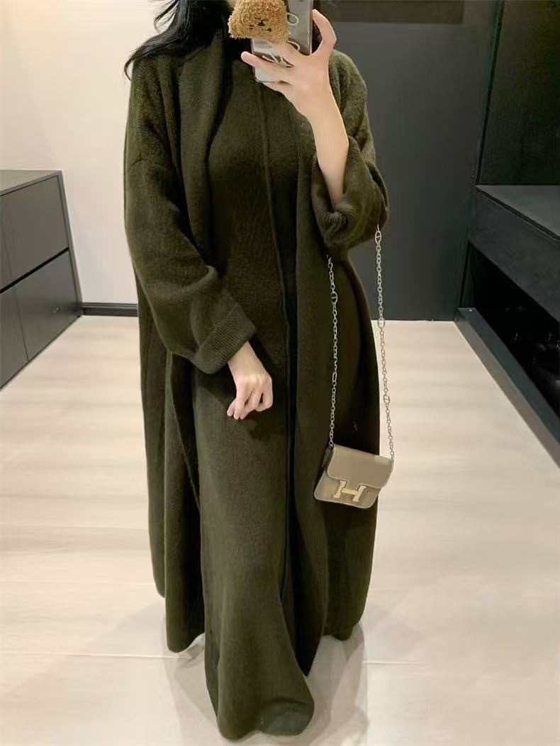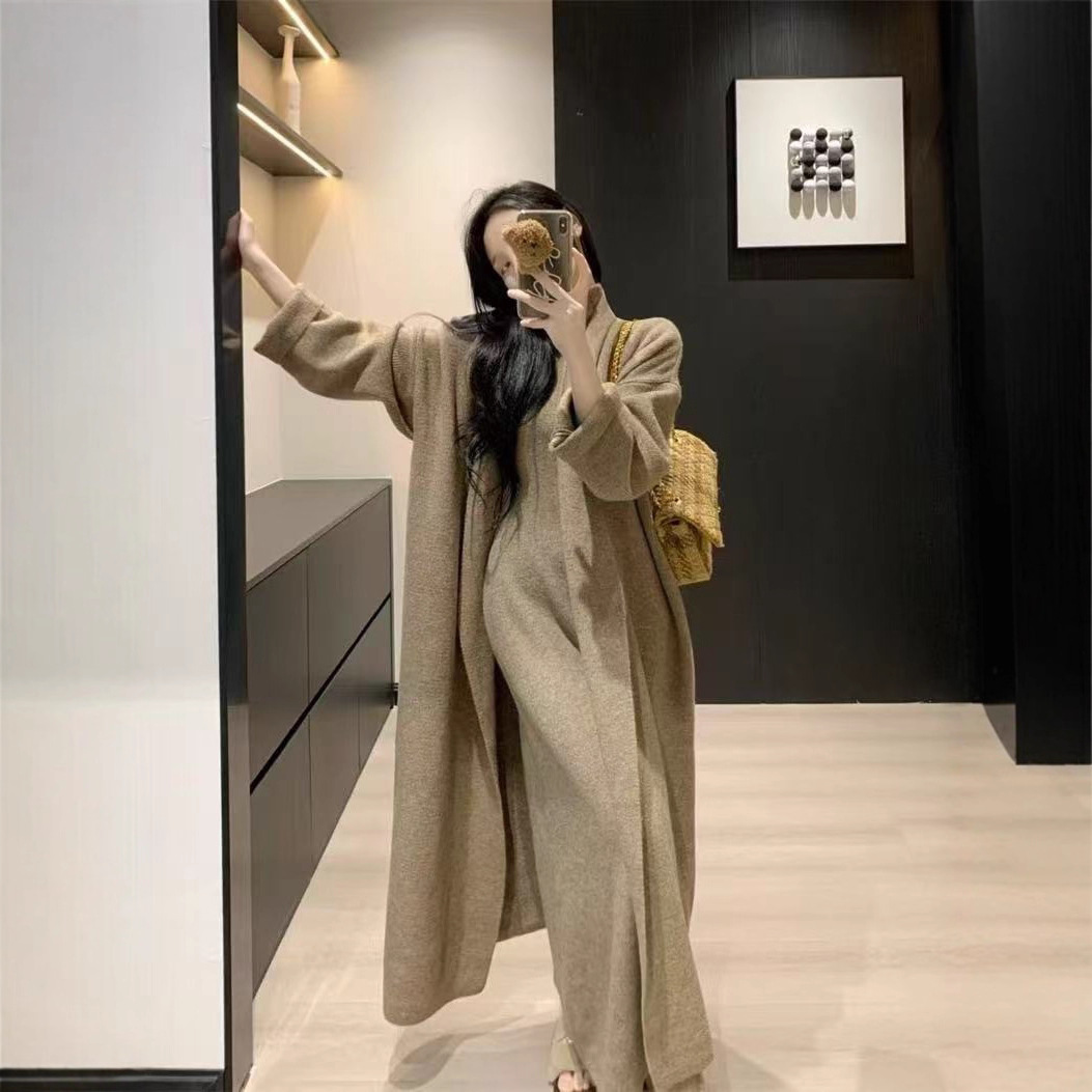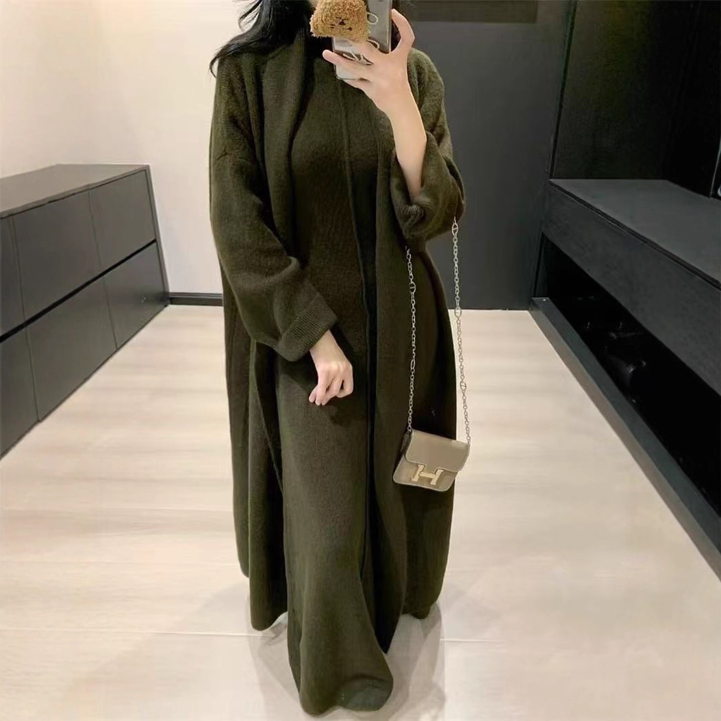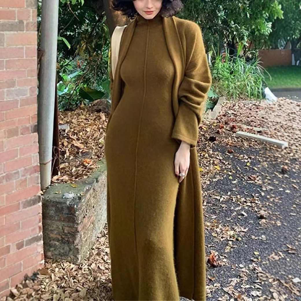우아한 여성스러운 스타일의 롱 스웨터 세트 여성 가을 겨울 신상 레이지 스타일 니트 가디건+원피스 투피스 세트스토어 가기