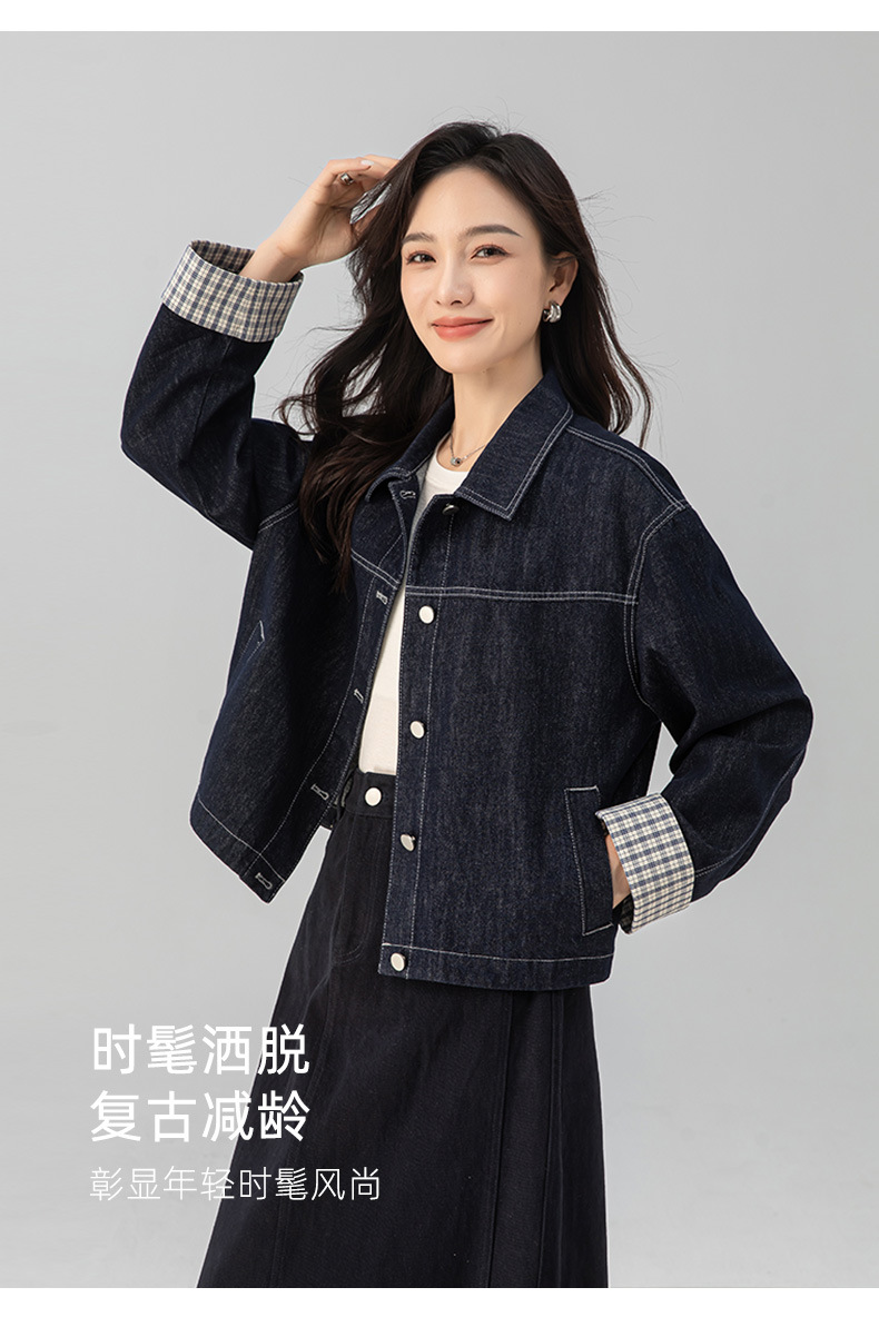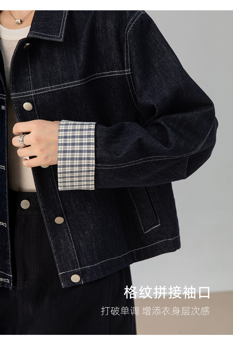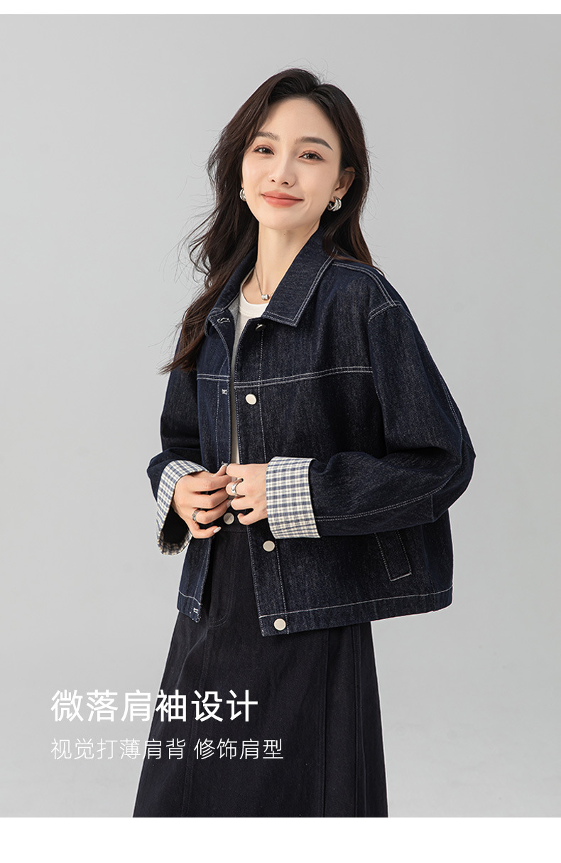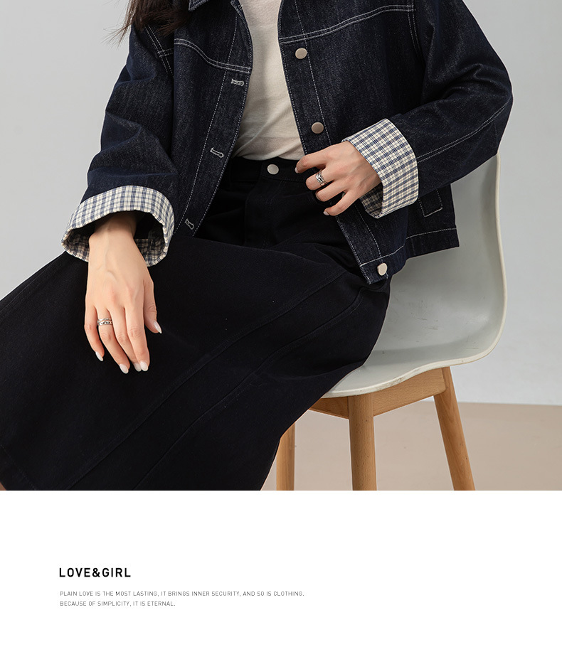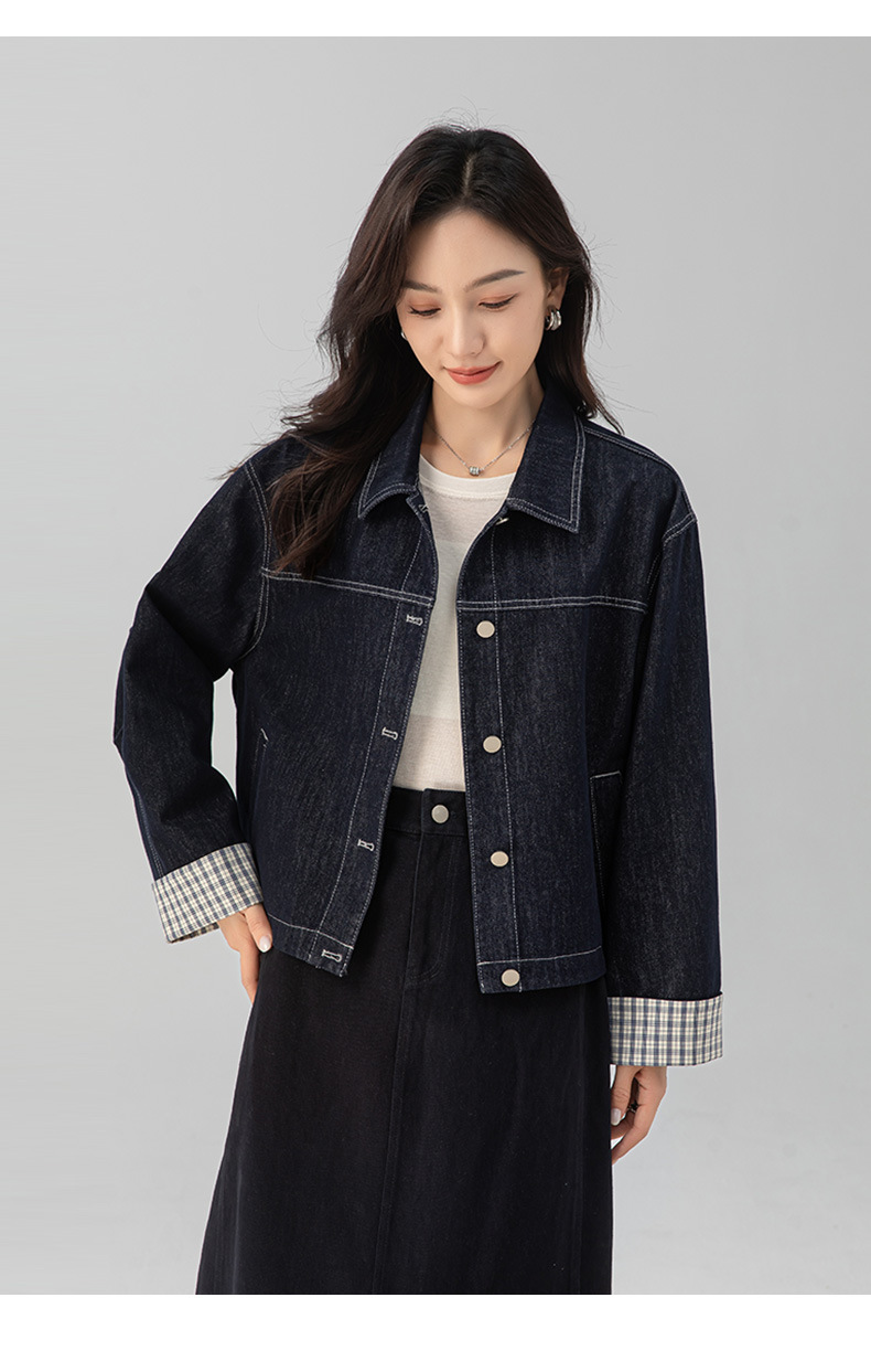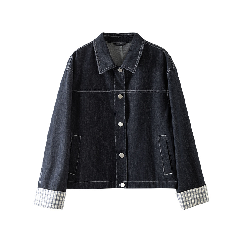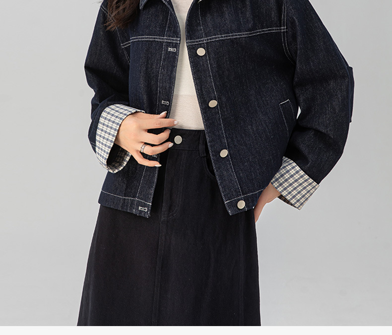 Xinge 가을 복고풍 격자 무늬 스플 라이스 커프 데님 짧은 코트 여성 긴 소매 오프 숄더 루즈 캐주얼 자켓 탑스토어 가기