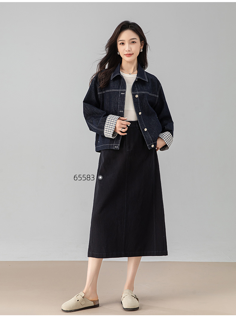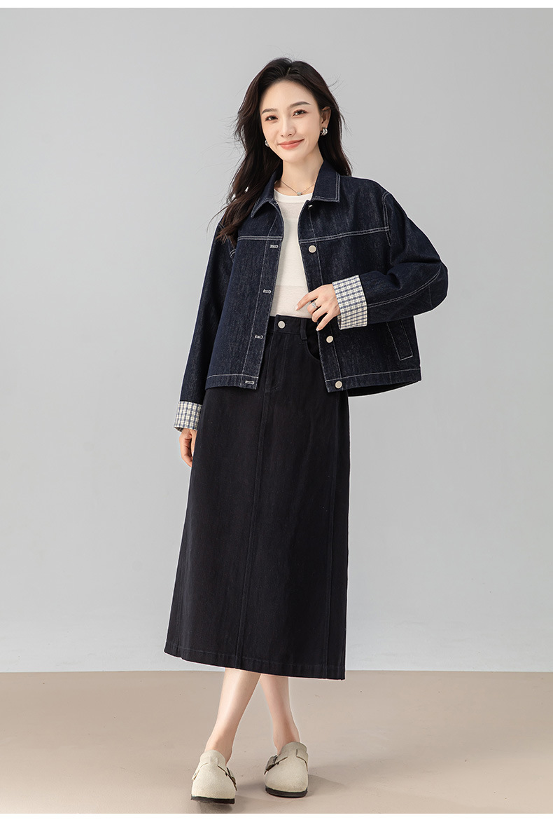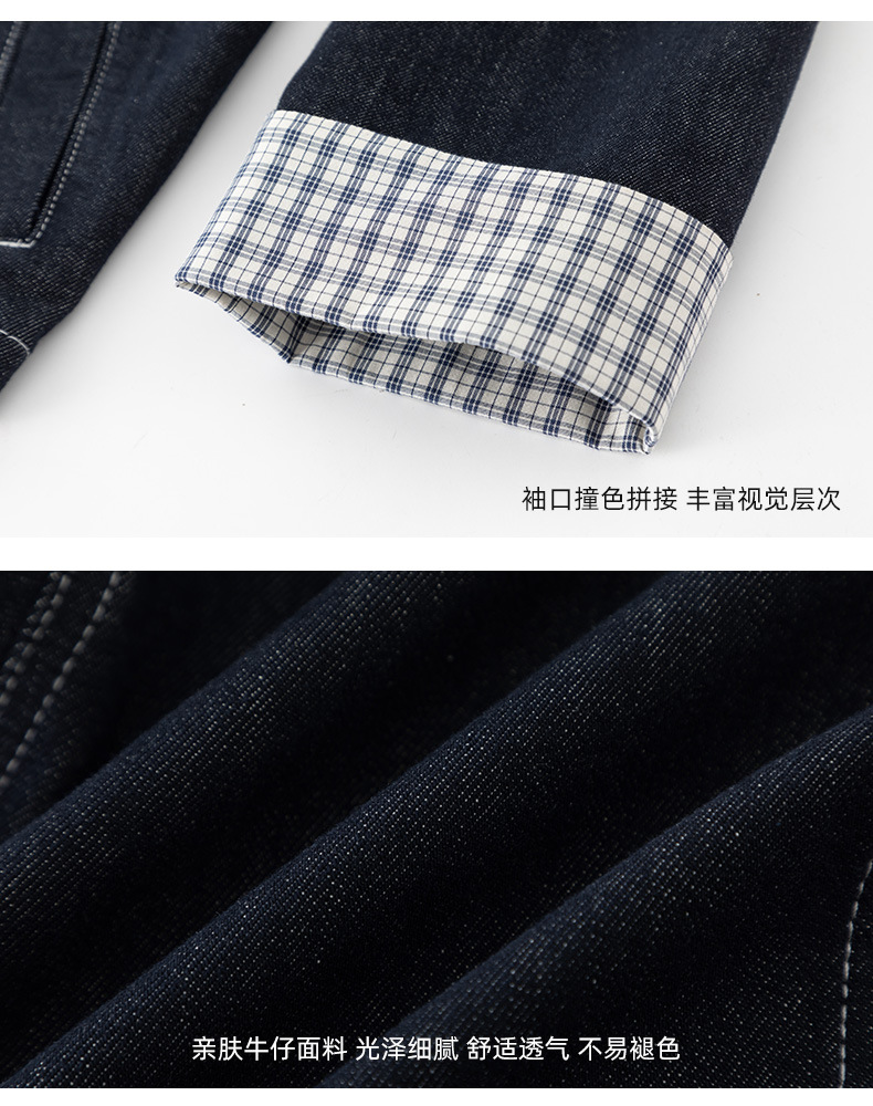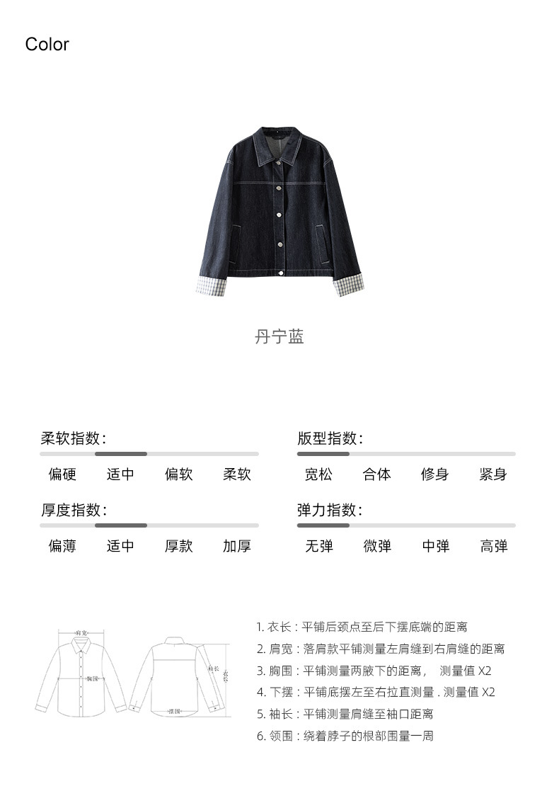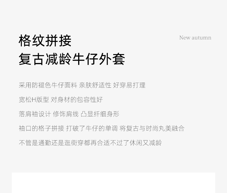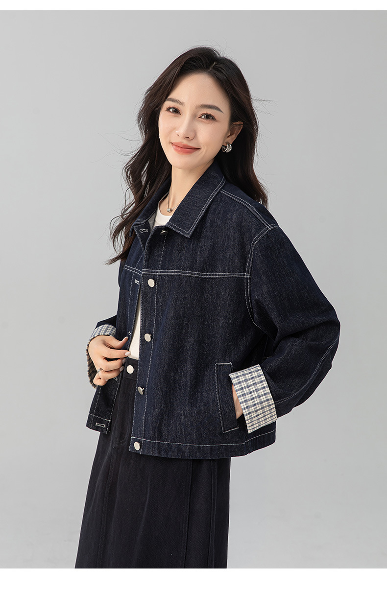Xinge 가을 복고풍 격자 무늬 스플 라이스 커프 데님 짧은 코트 여성 긴 소매 오프 숄더 루즈 캐주얼 자켓 탑스토어 가기