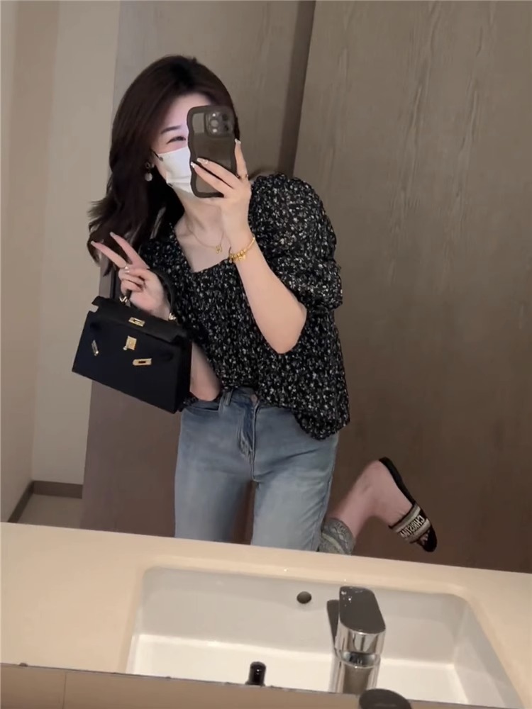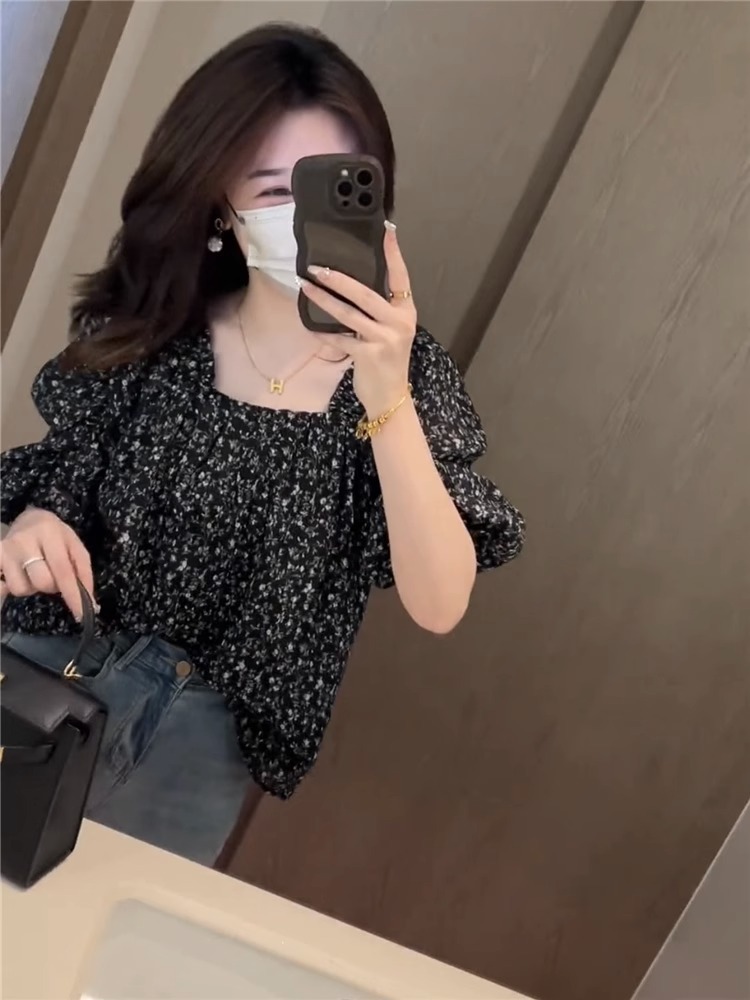 플로럴 루즈 쉬폰 셔츠, 반팔, 스타일리시하고 연령을 줄여주는 프렌치 스타일의 독특하고 시크한 탑