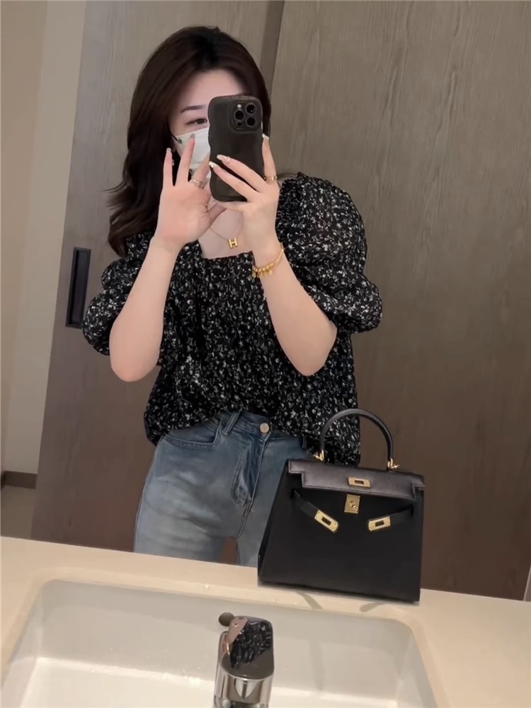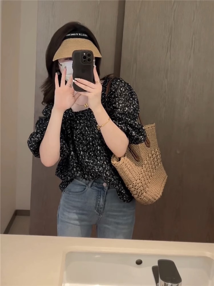 플로럴 루즈 쉬폰 셔츠, 반팔, 스타일리시하고 연령을 줄여주는 프렌치 스타일의 독특하고 시크한 탑스토어 가기