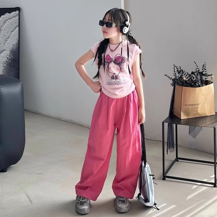 여아 한국식 와이드 팬츠 티셔츠 세트 큰 어린이 여름 신작 솔리드 컬러 도파민 스타일 캐주얼 반팔 여름