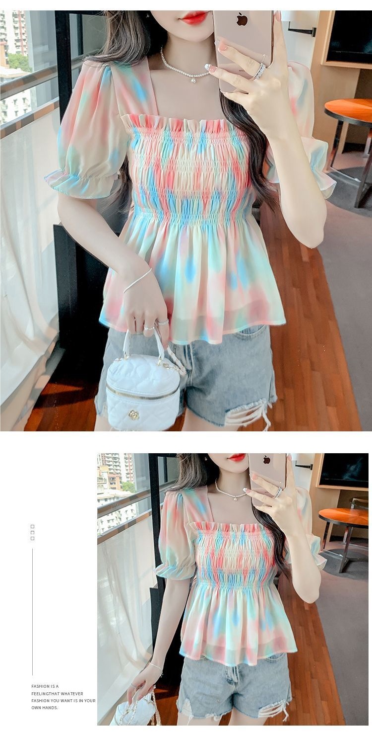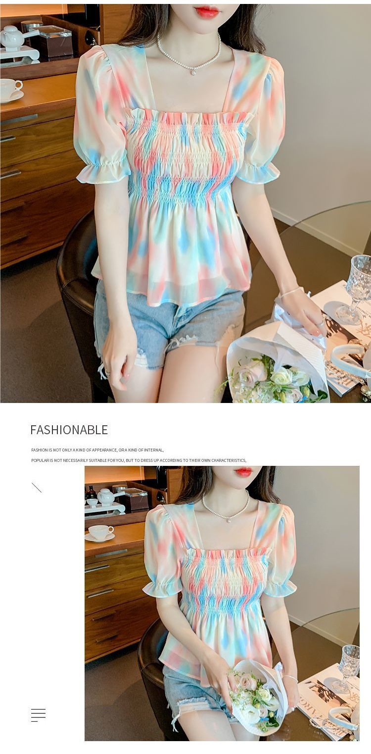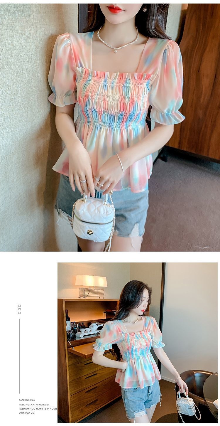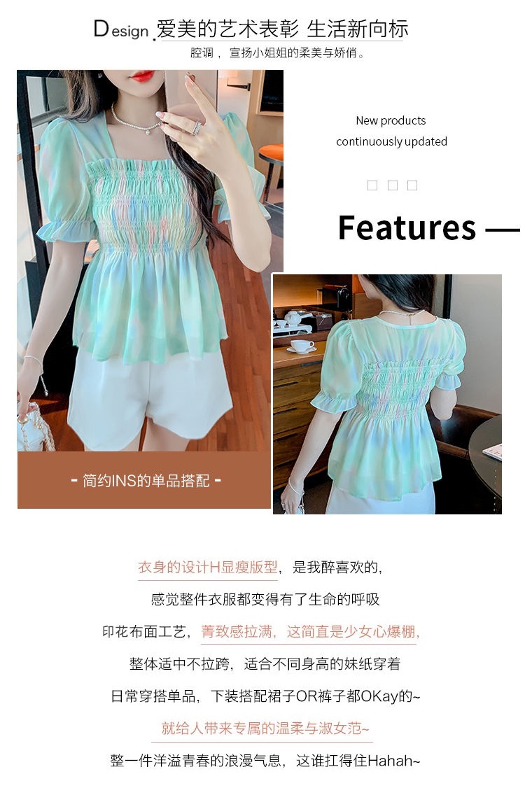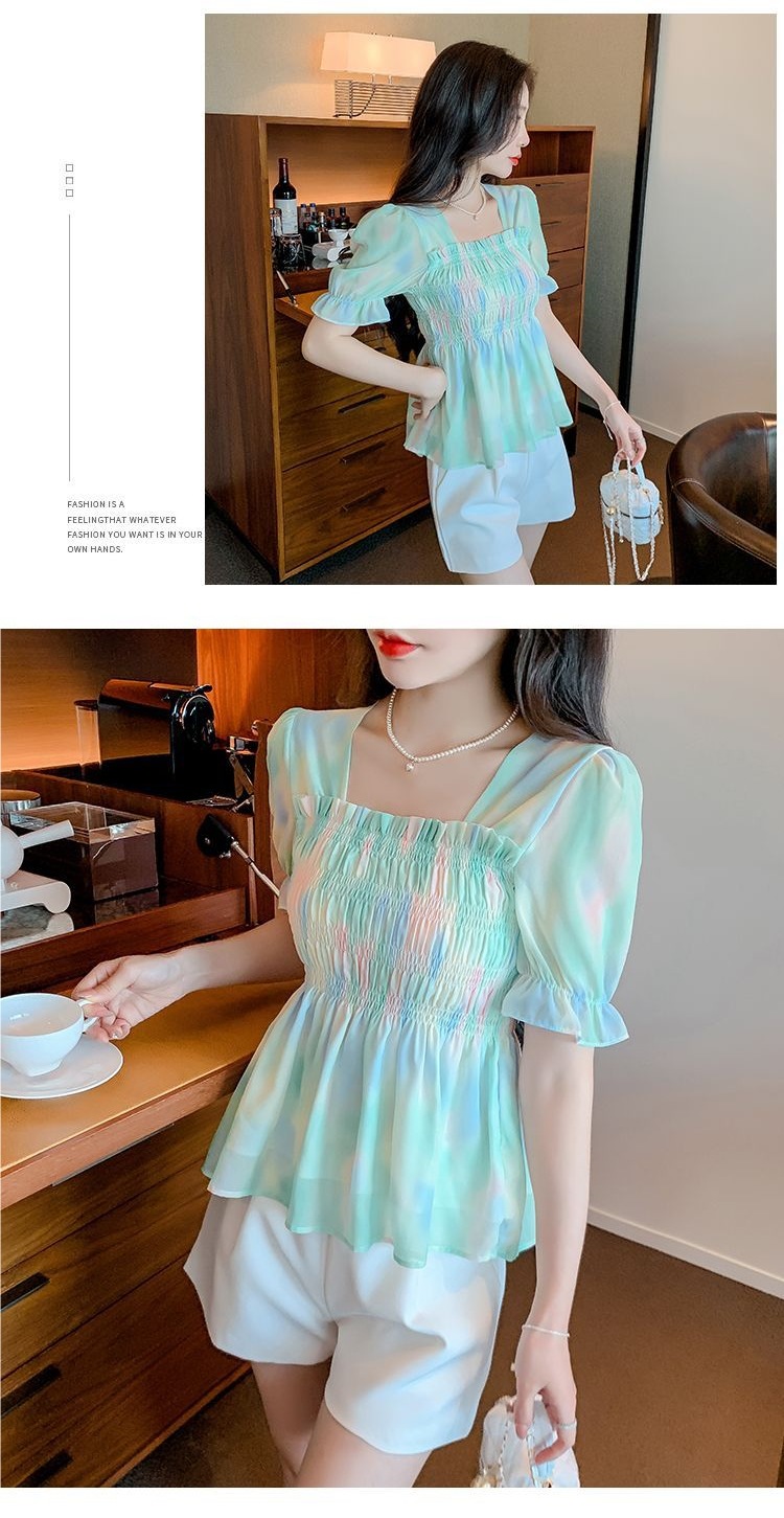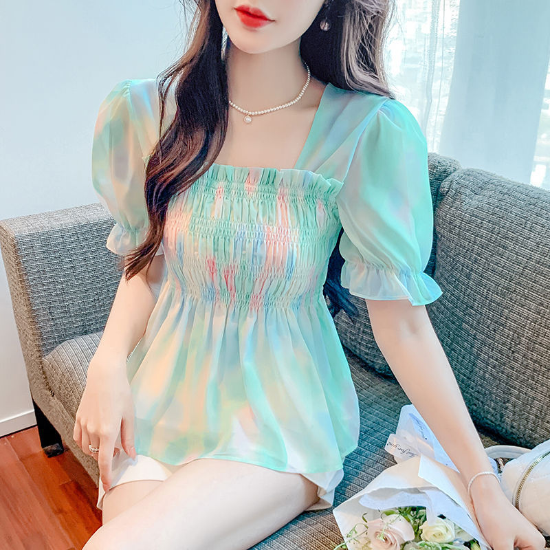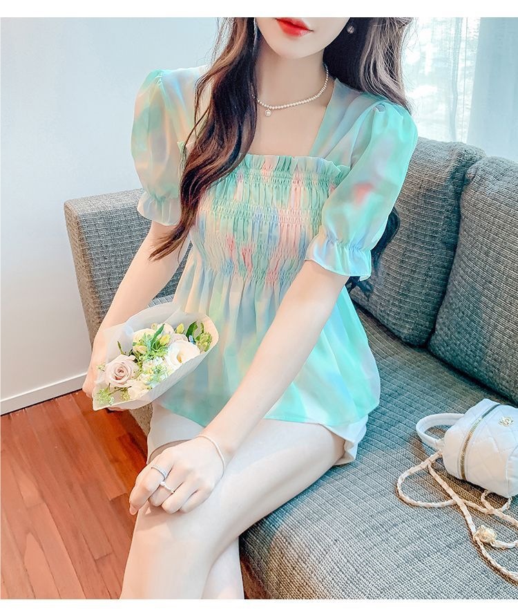 프렌치 쉬폰 셔츠 스퀘어 넥 신상 허리 스타일 탑 버블 여름 반팔 스위트 슬리밍 슬림 셔츠스토어 가기