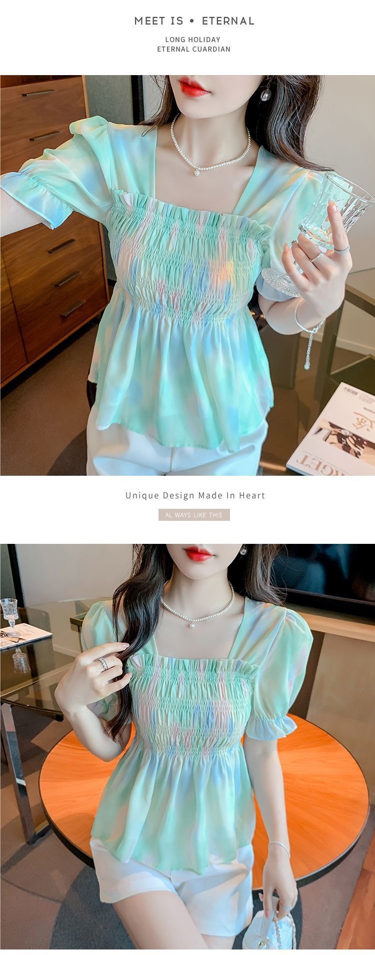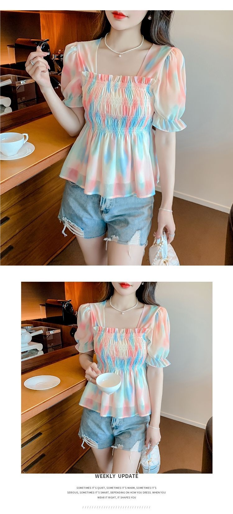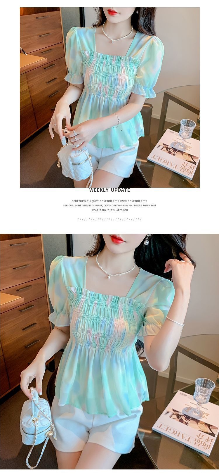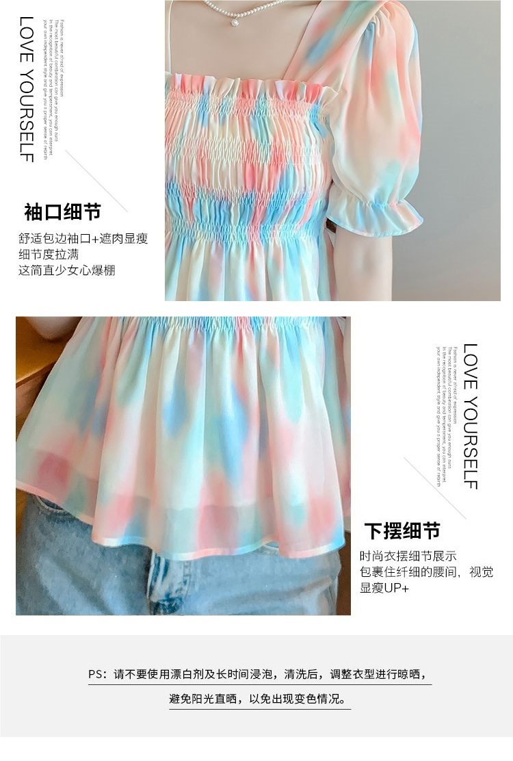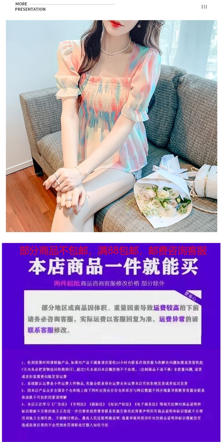 프렌치 쉬폰 셔츠 스퀘어 넥 신상 허리 스타일 탑 버블 여름 반팔 스위트 슬리밍 슬림 셔츠스토어 가기
