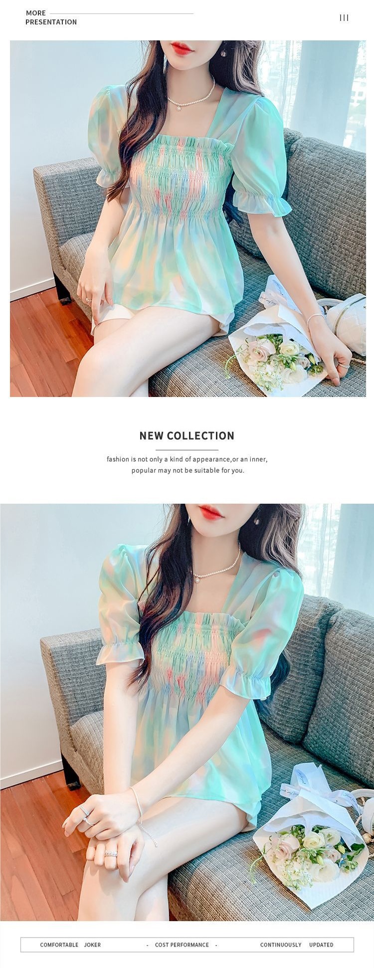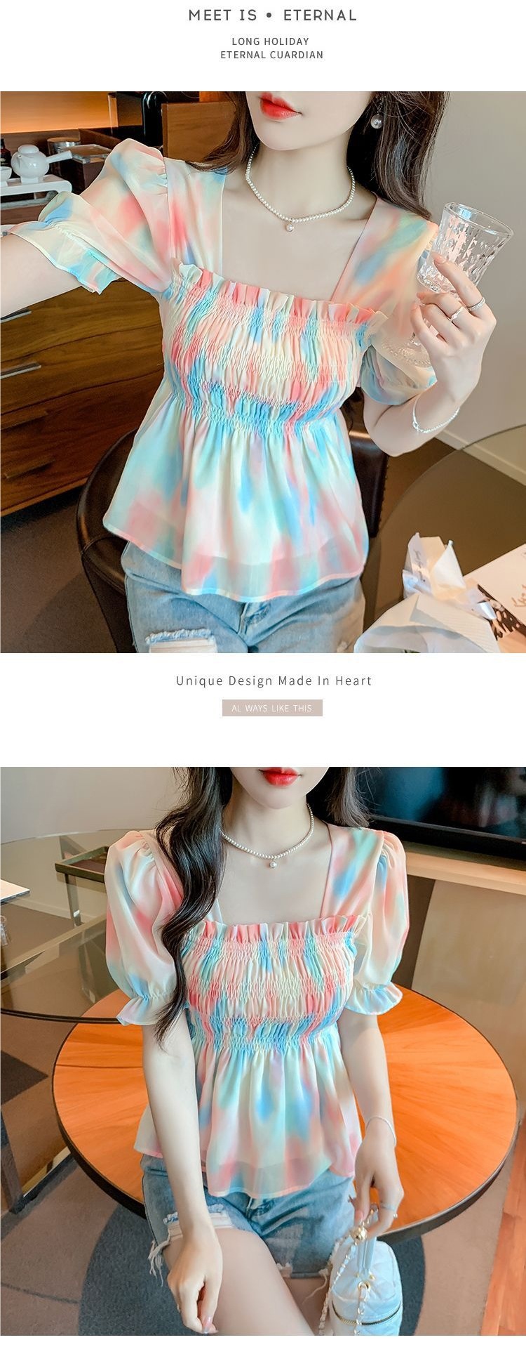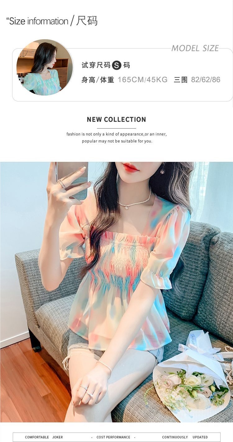 프렌치 쉬폰 셔츠 스퀘어 넥 신상 허리 스타일 탑 버블 여름 반팔 스위트 슬리밍 슬림 셔츠