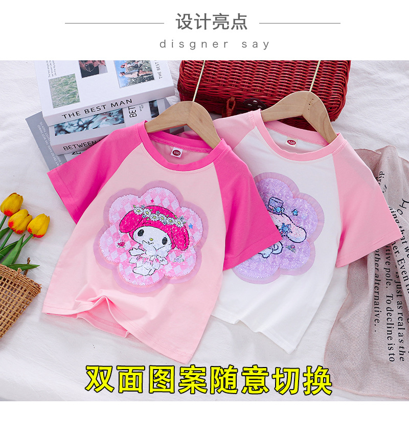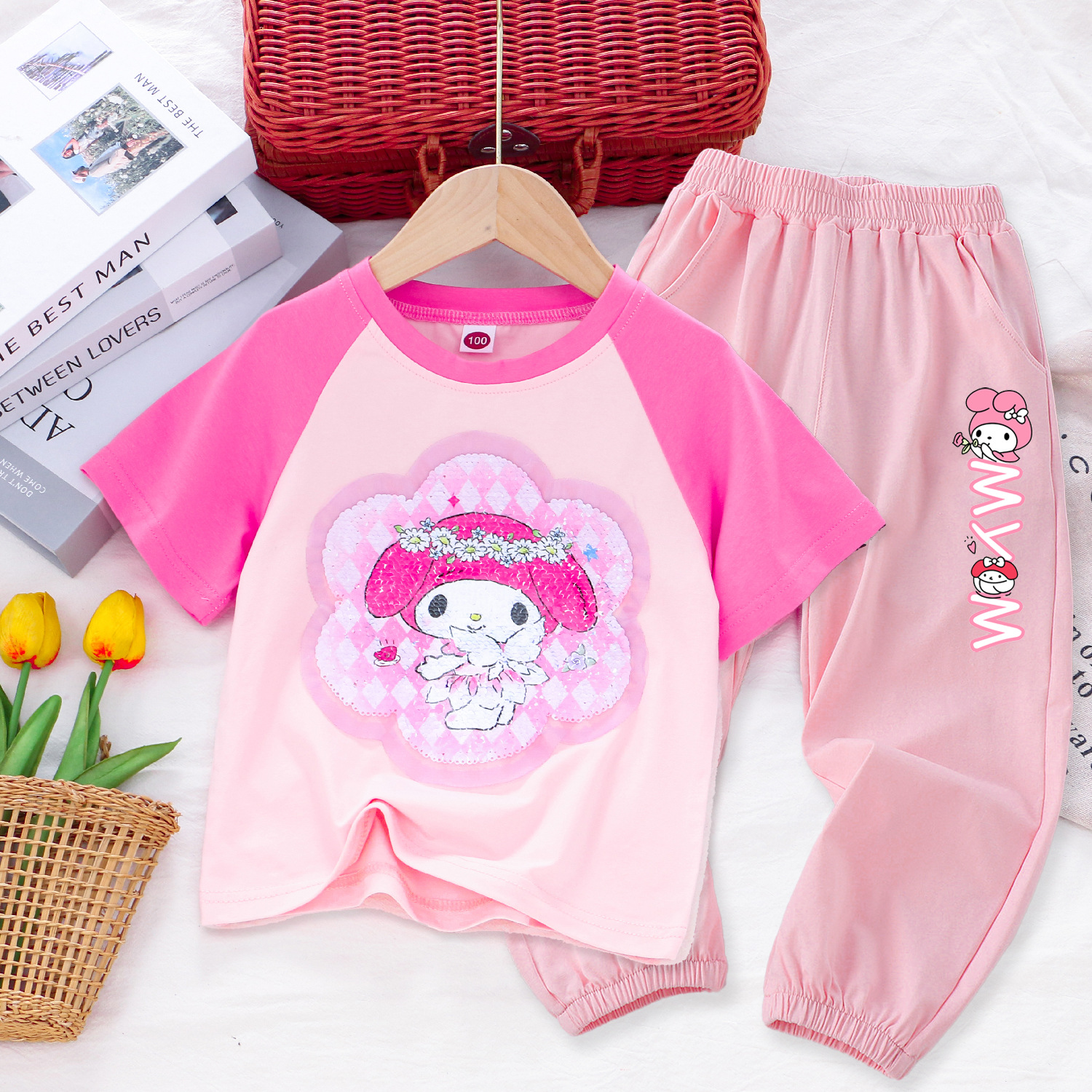 여아 정장, 아동용 대비색 래글런 반팔 티셔츠, 여아 멜로디 컬러 체인징 탑, 여름 모기 방지 바지 세트
