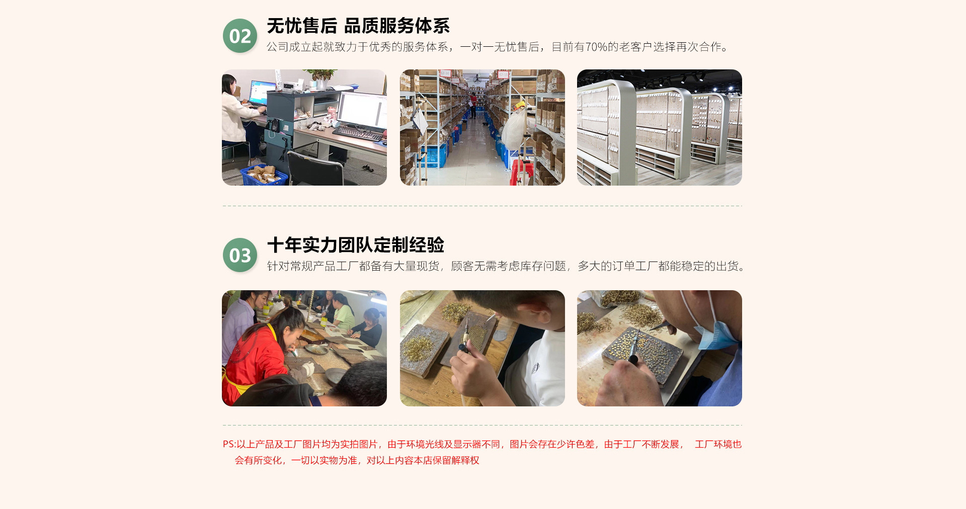 本厂专业饰品批发,产品批量生产,基本上手工加工,不同批次产品可能会有细微差异,微小瑕疵(不影响销售)无法避免,建议先拿样看货,大家都应该明白一分钱一分货的道理,不要凭自己的想像,每个人的想像都是无限大,这个我们满足不了,请见谅!对于质量非常苛刻的客户,请到专柜购买!