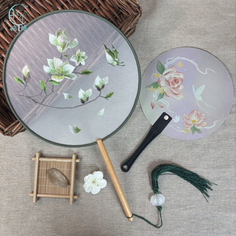 • [자수 부채] 녹목련 나비 + 모란 작은 둥근 부채