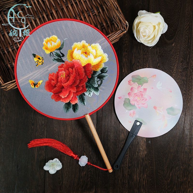 • [자수 부채] 노란색 상큼 + 모란 작은 둥근 부채 스타일