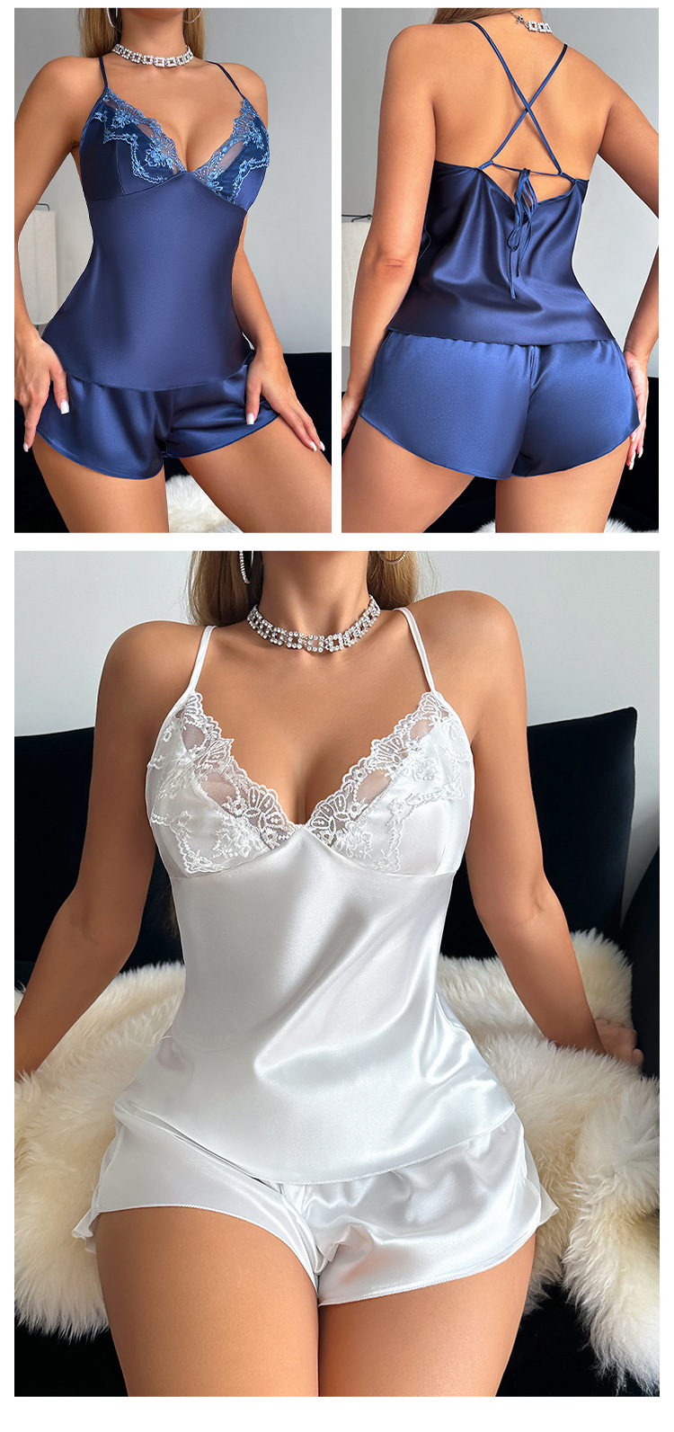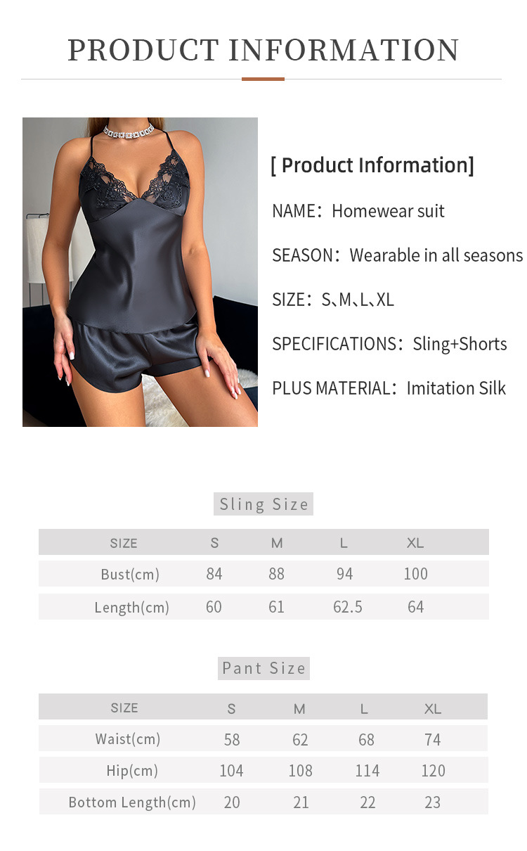유럽과 미국 스타일의 얼음 실크 실크 잠옷, 여성스러운 레이스 서스펜더 반바지 정장, 가정복, 여름 모조 실크 잠옷스토어 가기