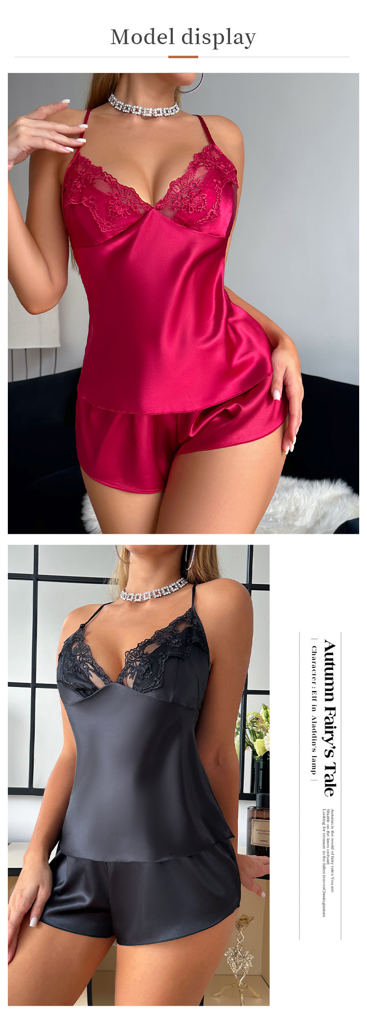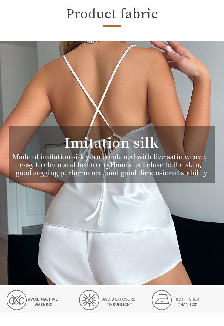 유럽과 미국 스타일의 얼음 실크 실크 잠옷, 여성스러운 레이스 서스펜더 반바지 정장, 가정복, 여름 모조 실크 잠옷