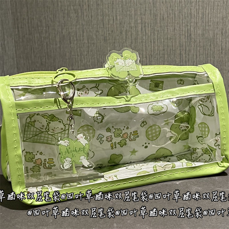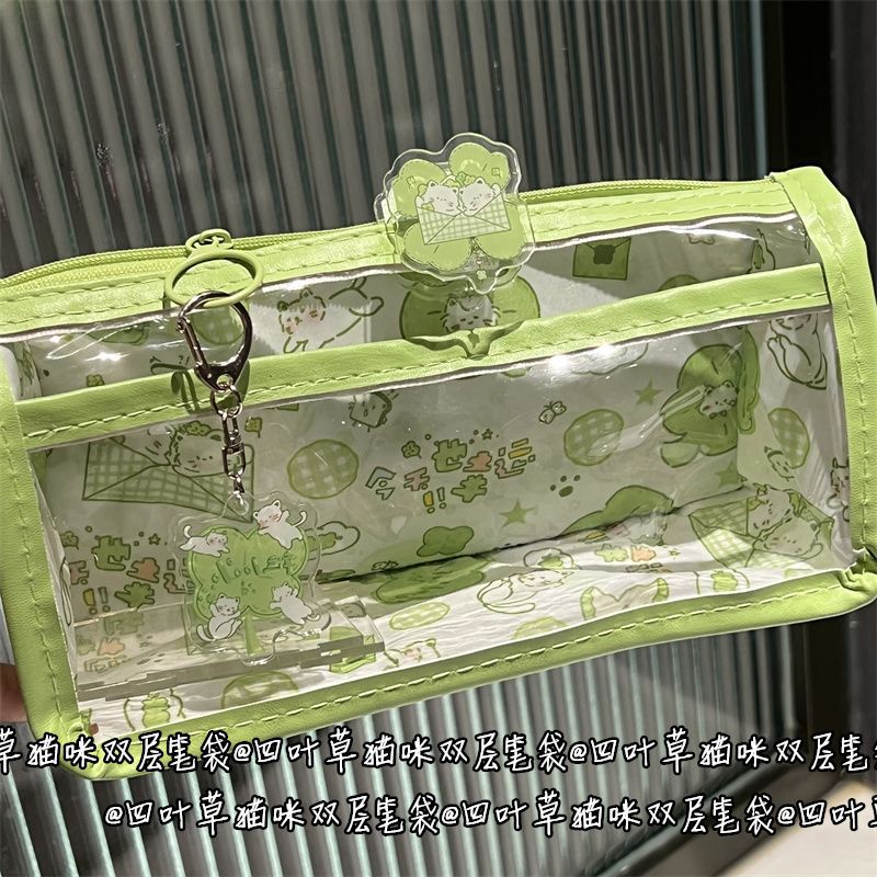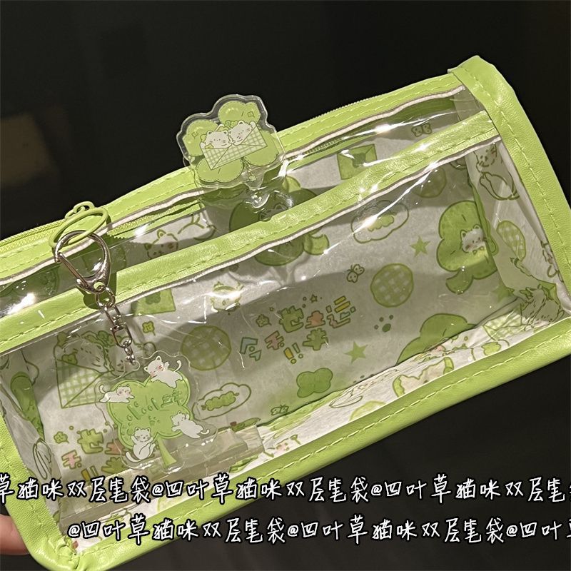 Jumu Zhen 네잎 클로버 고양이 더블 레이어 펜 가방 스타일 고가치 귀여운 오리지널 투명 휴대용 문구 가방