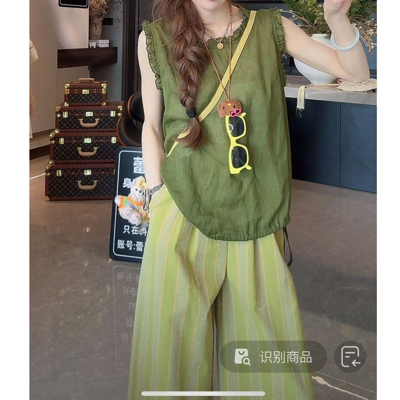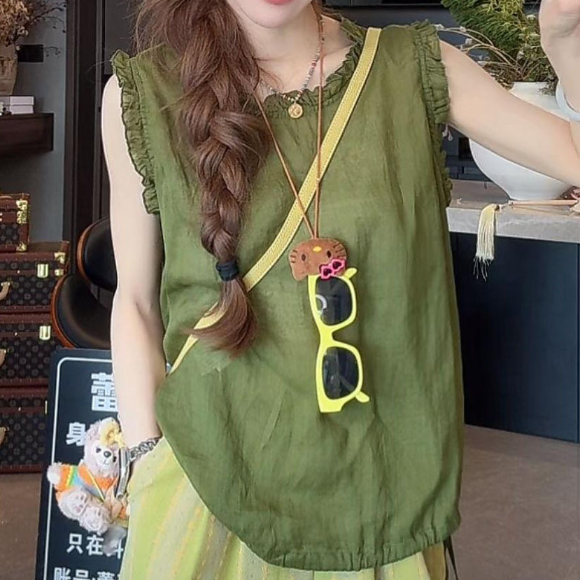 여름 버섯 칼라, 루즈하고 시원하며 편안한 예술적인 민소매 탑, 대비되는 컬러 드레이프, 활용도가 높은 와이드 팬츠 슈트스토어 가기