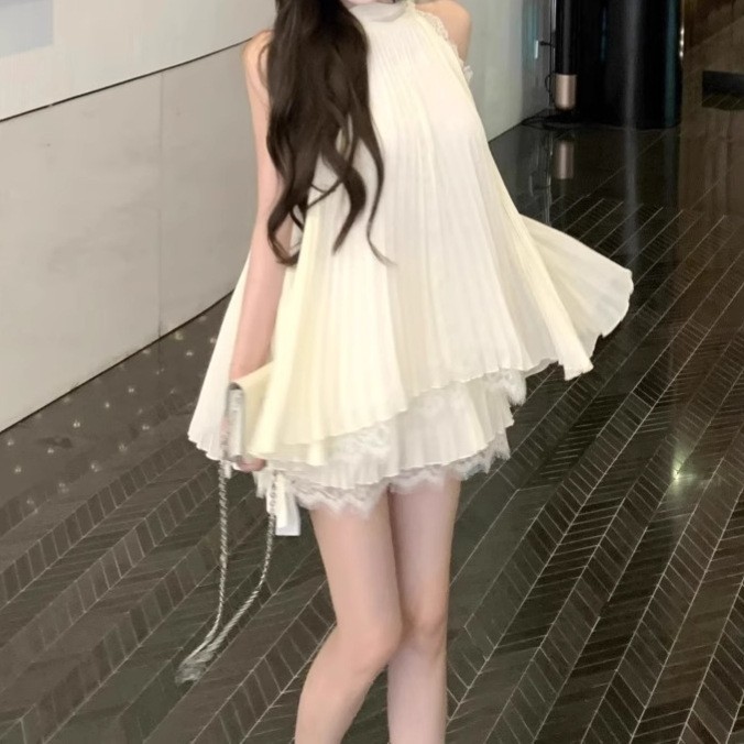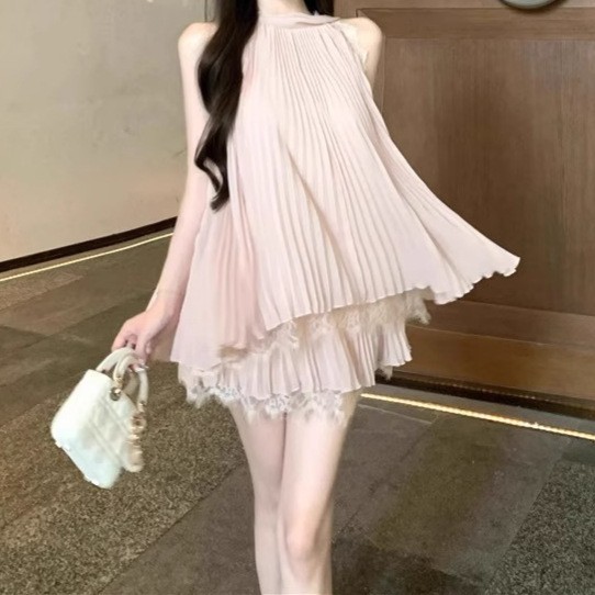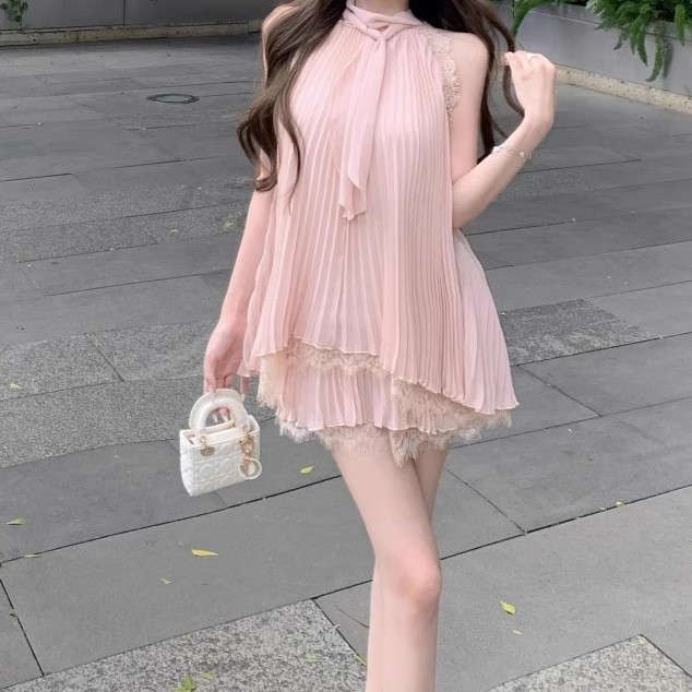 레이스 스플 라이스 순수한 욕망 민소매 홀터넥 탑 여성 여름 정장 하이 웨이스트 쉬폰 스커트 투피스 세트스토어 가기