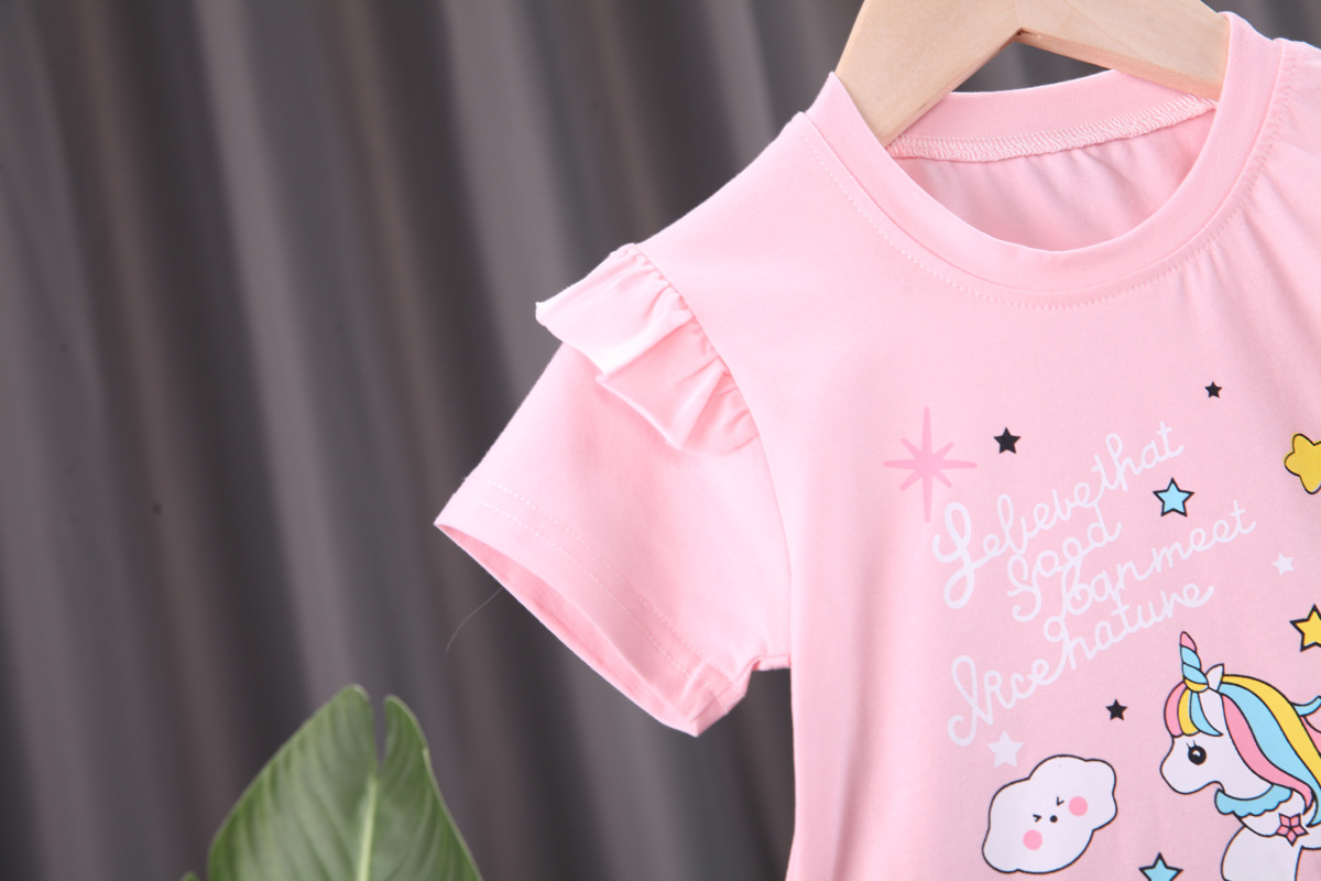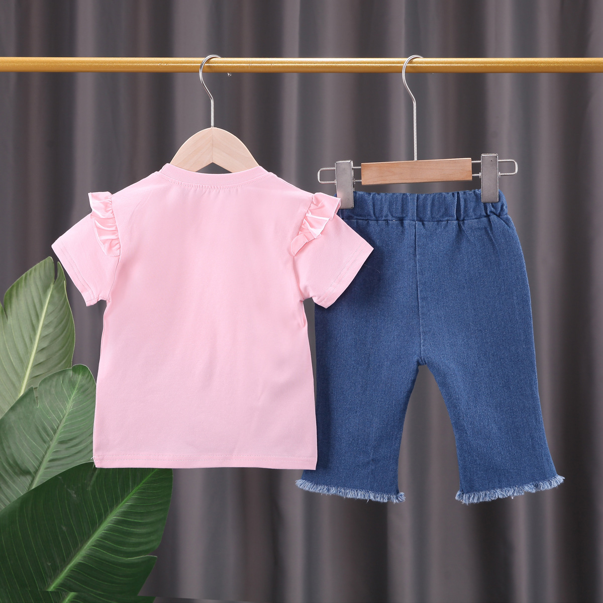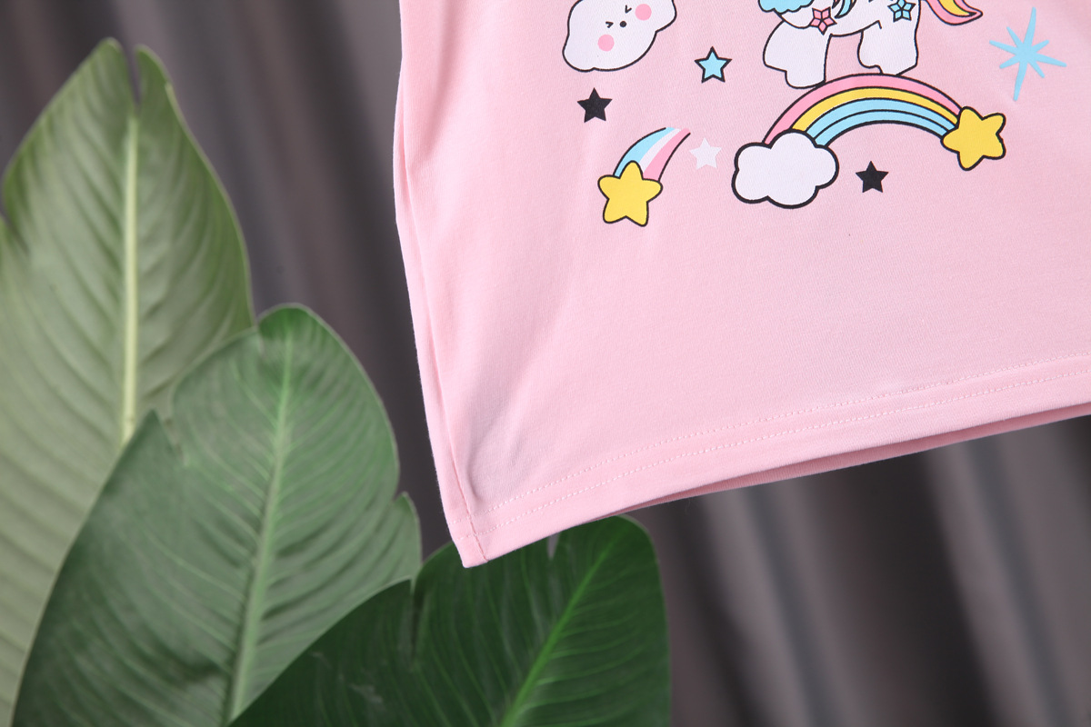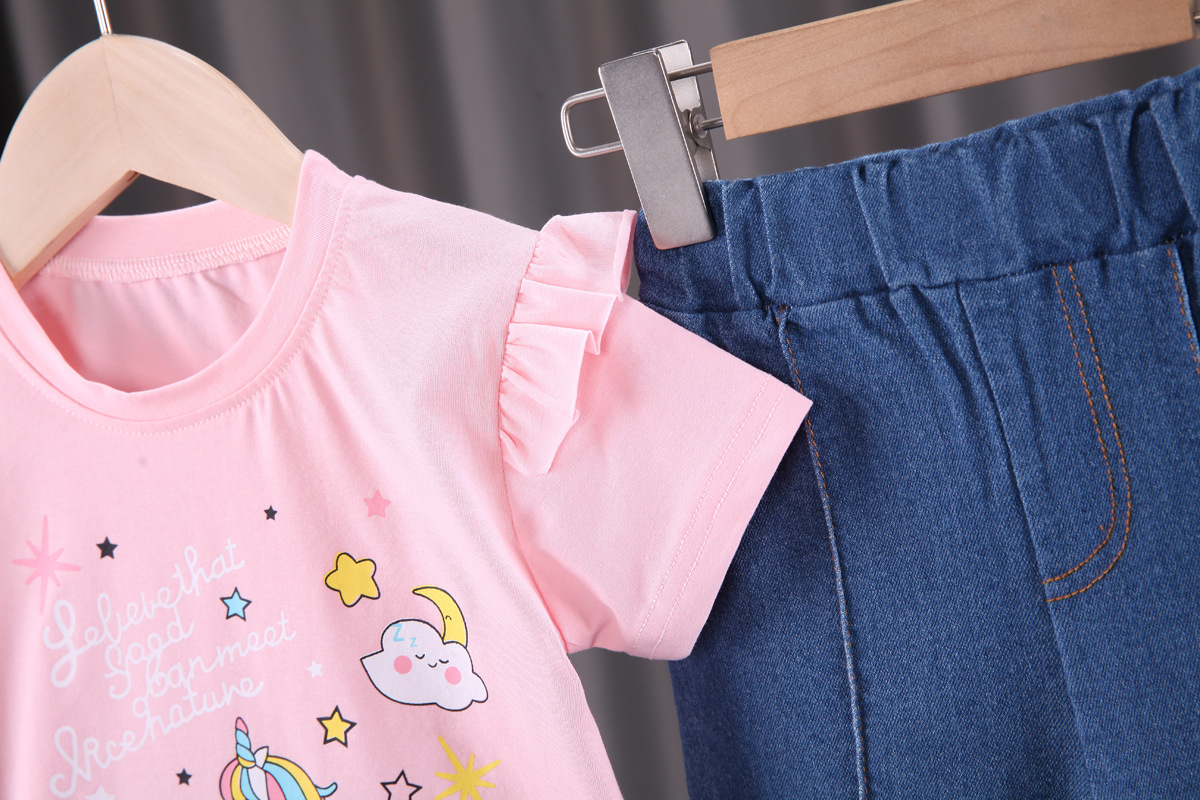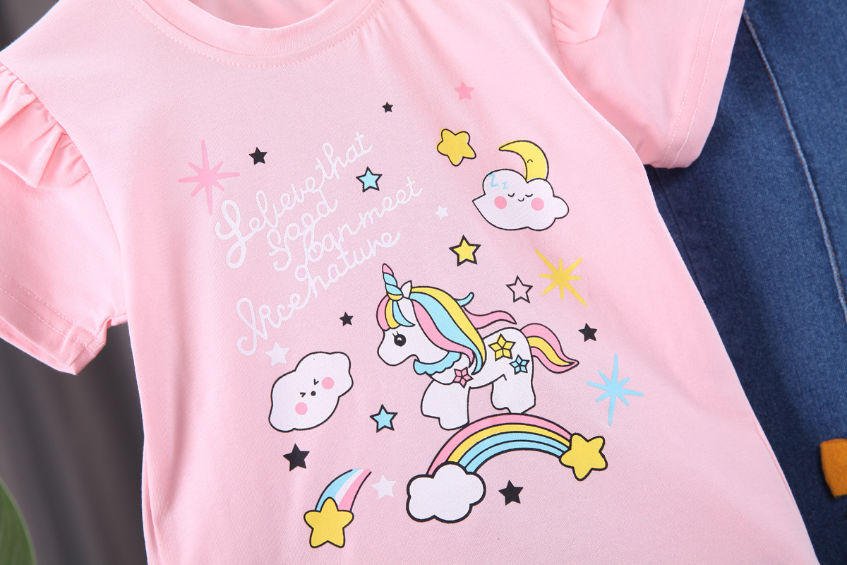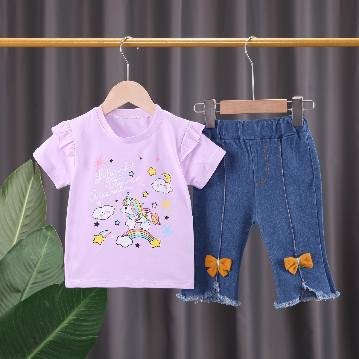 여자 여름 정장 2025 새로운 어린이 만화 편지 반팔 무지개 조랑말 캐주얼 청바지 투피스 세트
