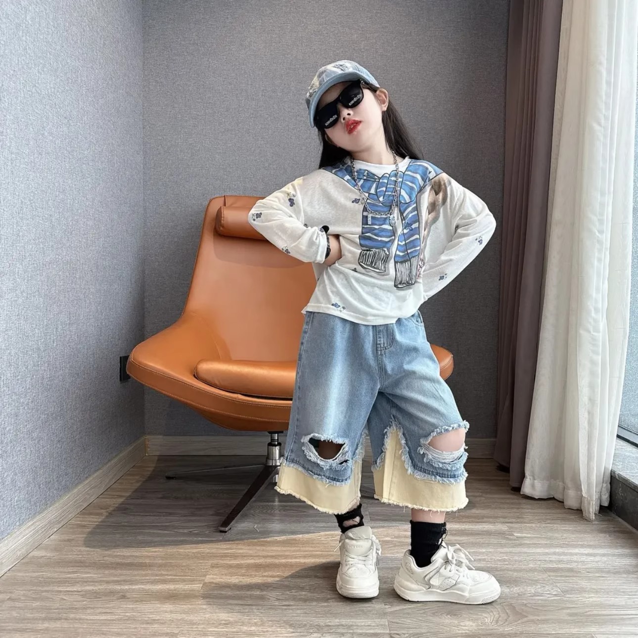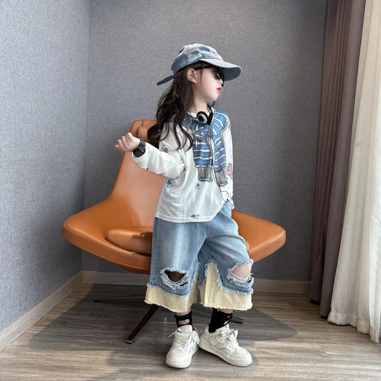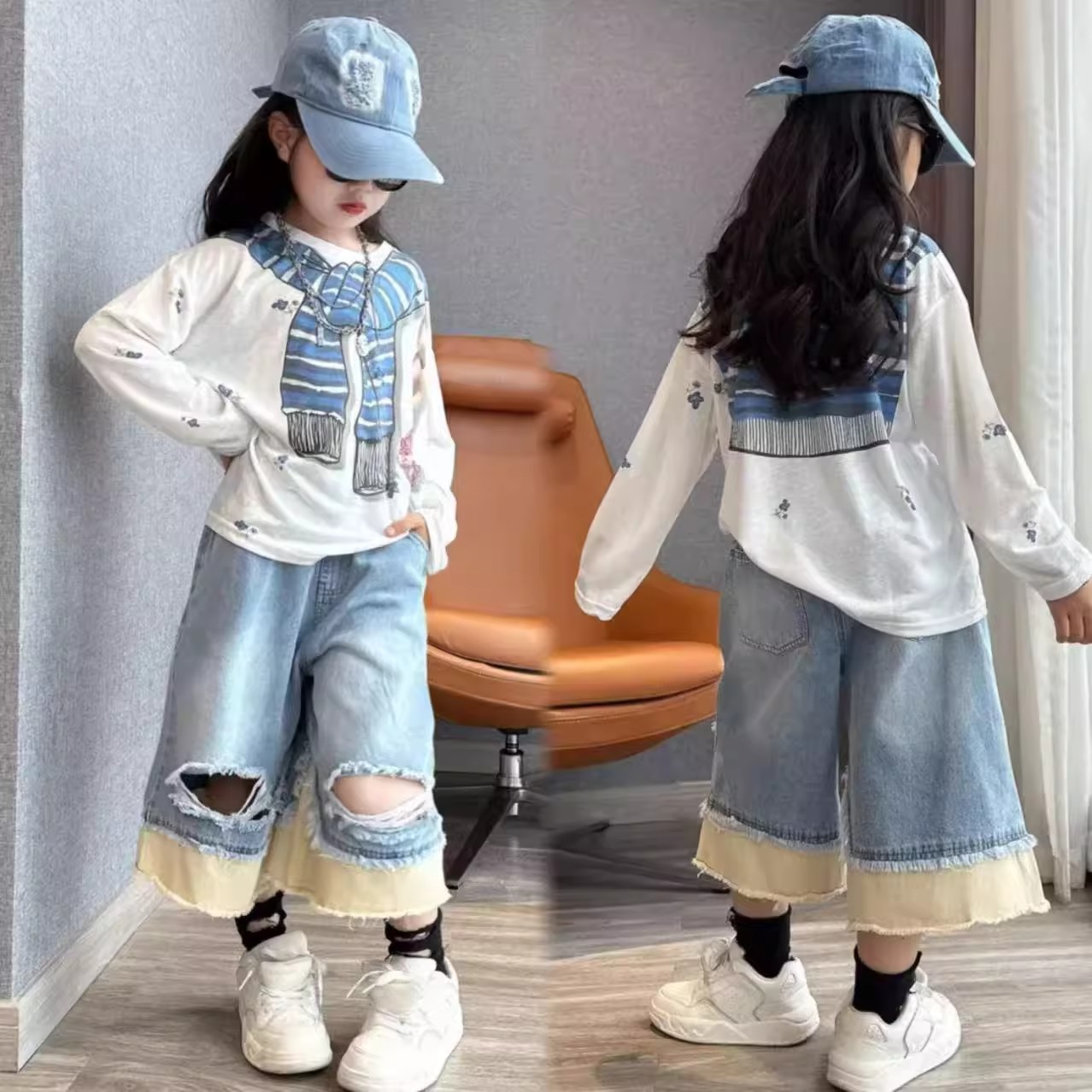 여아 게으른 스타일 재미있는 프린트 자외선 차단 긴팔 티셔츠 맞춤형 찢어진 컬러 블록 데님 크롭 팬츠 슈트 한국어 버전 9