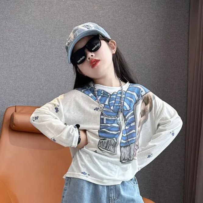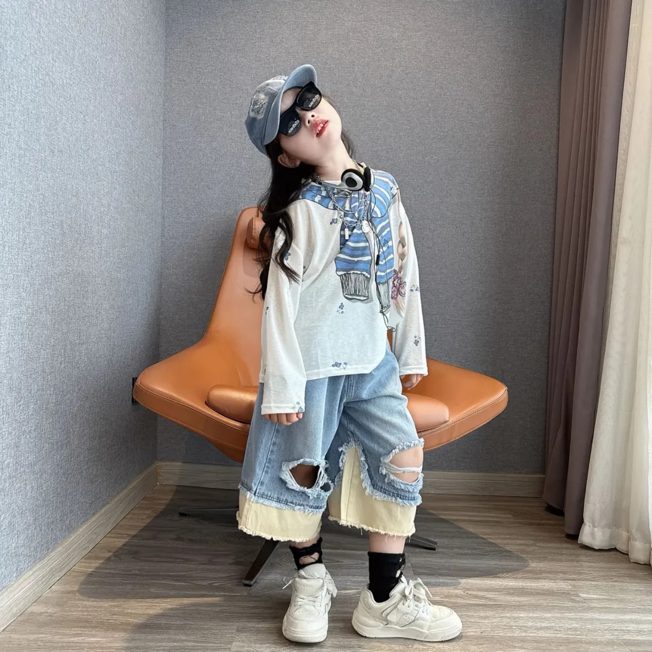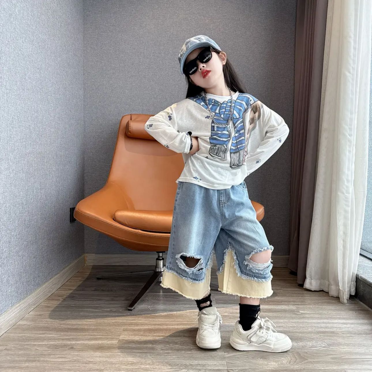 여아 게으른 스타일 재미있는 프린트 자외선 차단 긴팔 티셔츠 맞춤형 찢어진 컬러 블록 데님 크롭 팬츠 슈트 한국어 버전 9