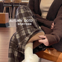 加绒咖色毛呢阔腿裤女春秋2025新款小个子宽松直筒慵懒复古格子裤