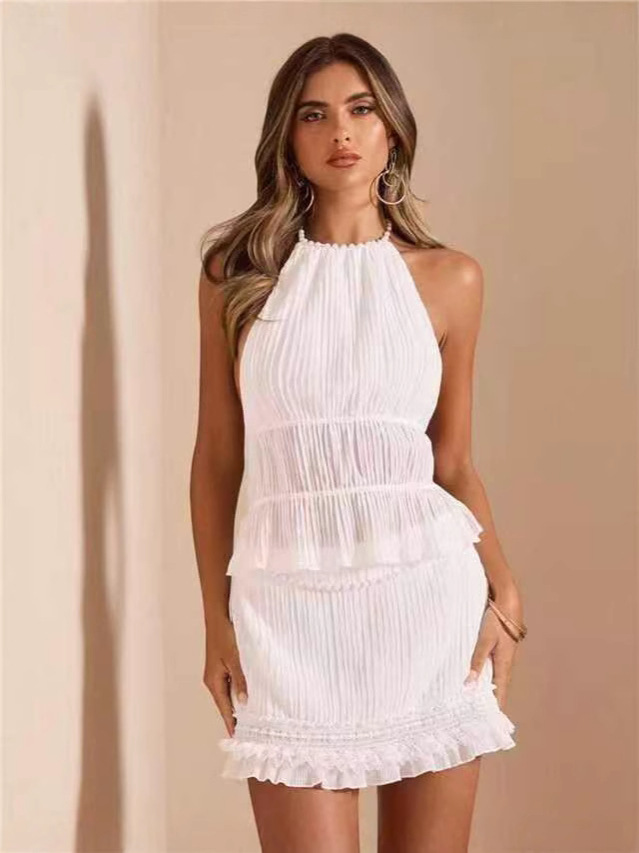 국경 간 유럽과 미국 의류 봄과 여름 등이없는 주름 맞춤형 진주 체인 스커트 새로운 통기성 레이스 힙 스커트