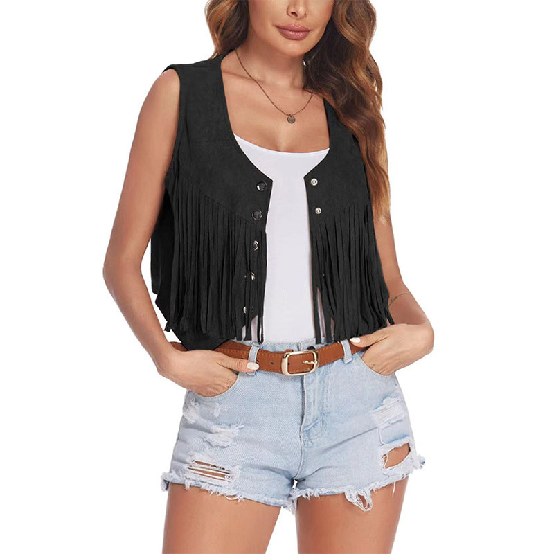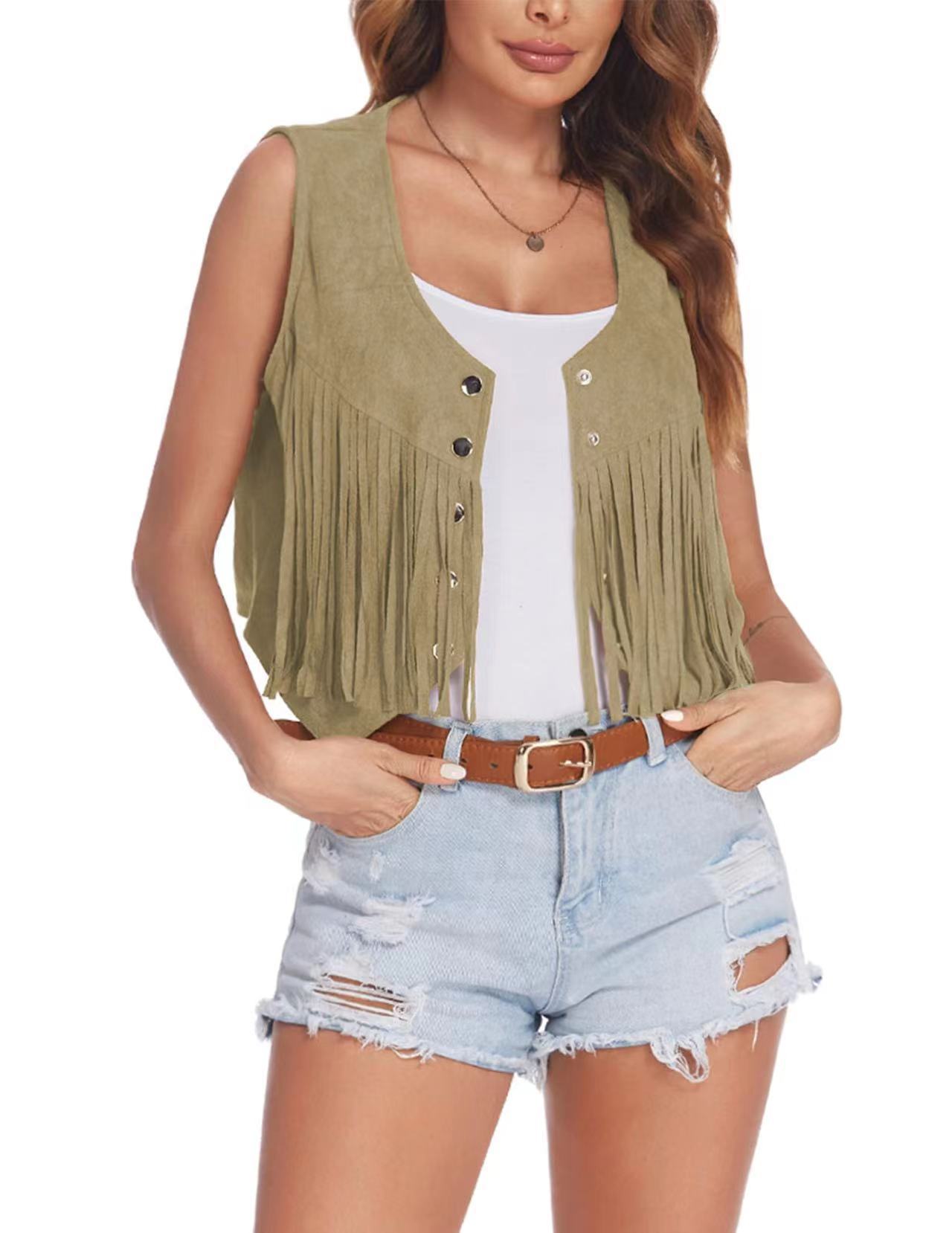 2026 여성 유럽 및 미국 스타일 신상 스웨이드 프린지 조끼 재킷, 인기 민소매 중간 길이 조끼 아우터