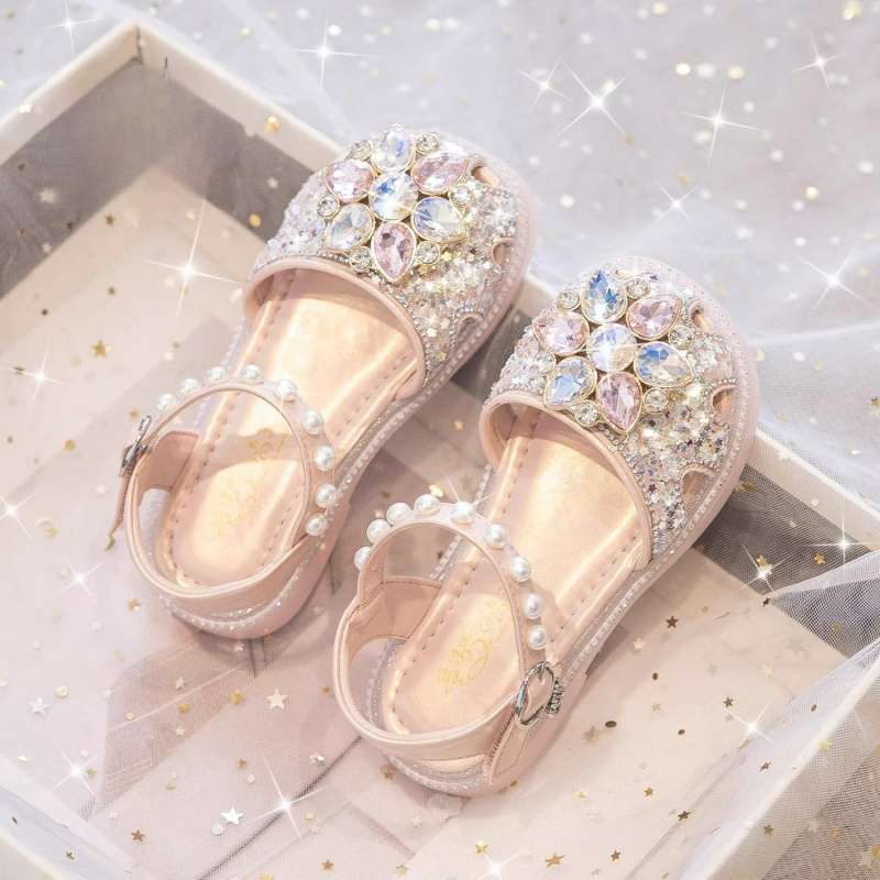 여자 샌들 2025 새로운 여름 스타일 어린이 공주 신발 여자 라인 석 발가락 부드러운 바닥 크리스탈 신발 여름