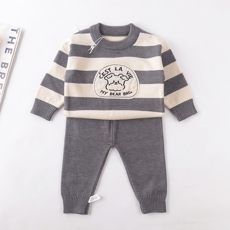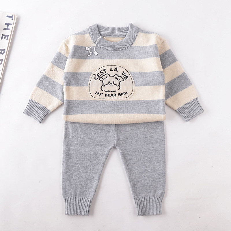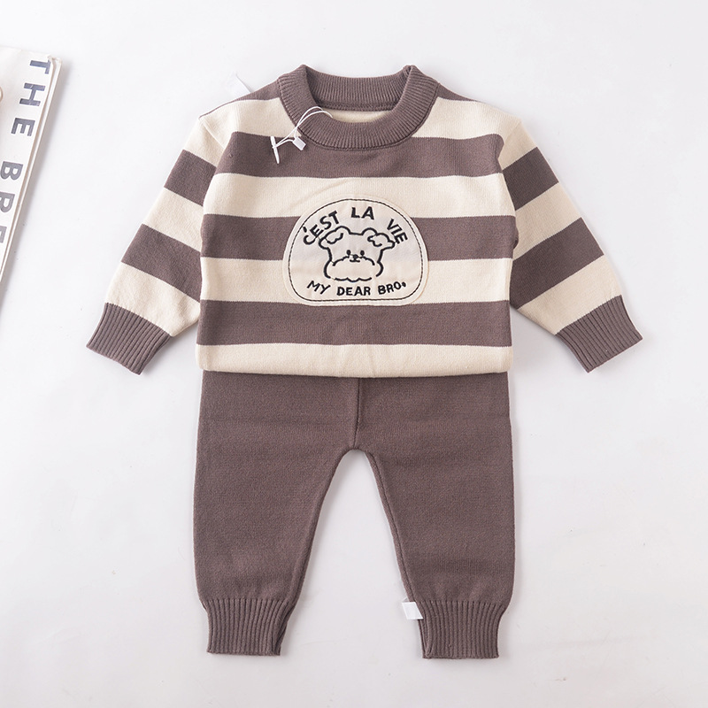 아기 소년 가을 의류 2025 아기 정장 줄무늬 스플릿 투피스 세트 유아 대비 색상 니트 스웨터 도매