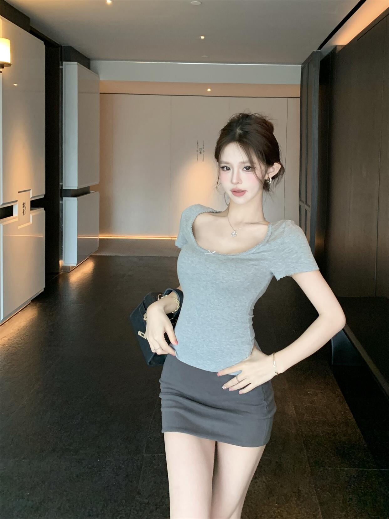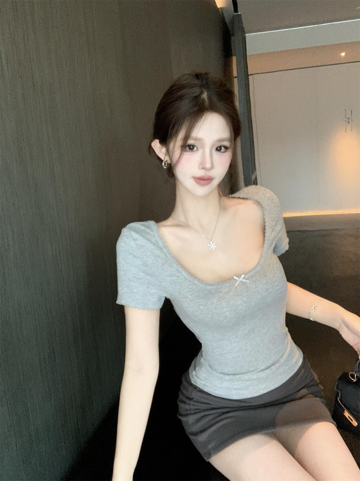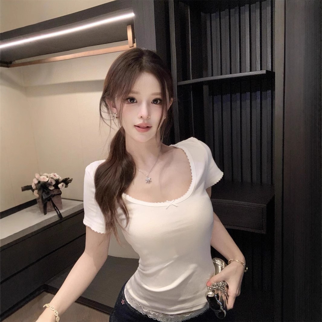 여름 여성용 화이트 보우 U넥 반팔 오른쪽 어깨 티셔츠 슬림핏 허리 퓨어 디자이어 니치 다용도 바디 쉐이핑 탑