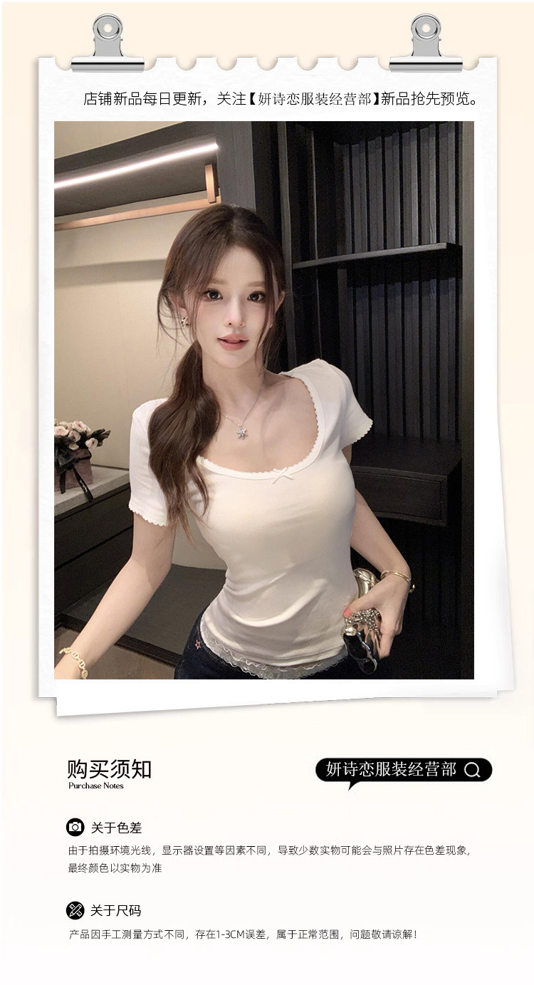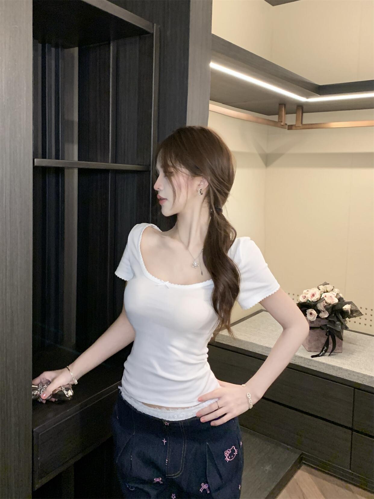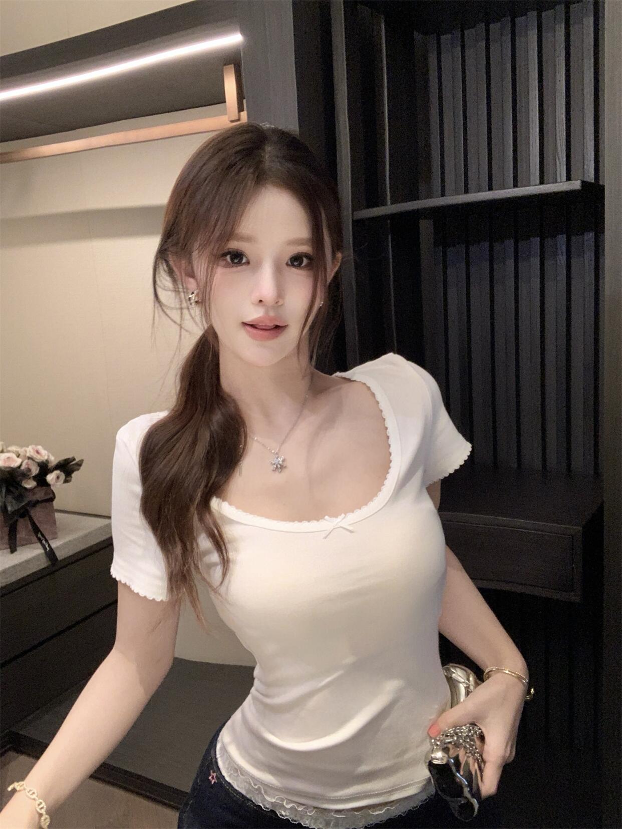 여름 여성용 화이트 보우 U넥 반팔 오른쪽 어깨 티셔츠 슬림핏 허리 퓨어 디자이어 니치 다용도 바디 쉐이핑 탑스토어 가기