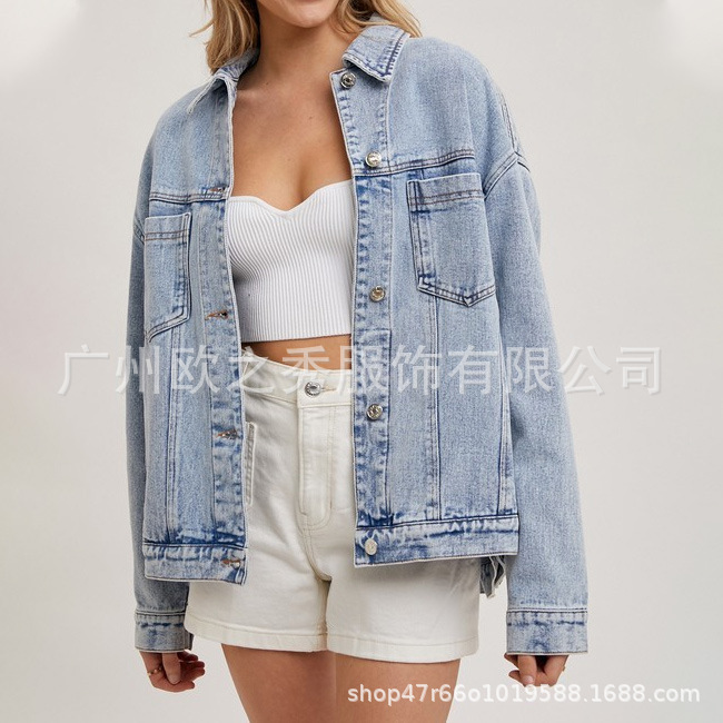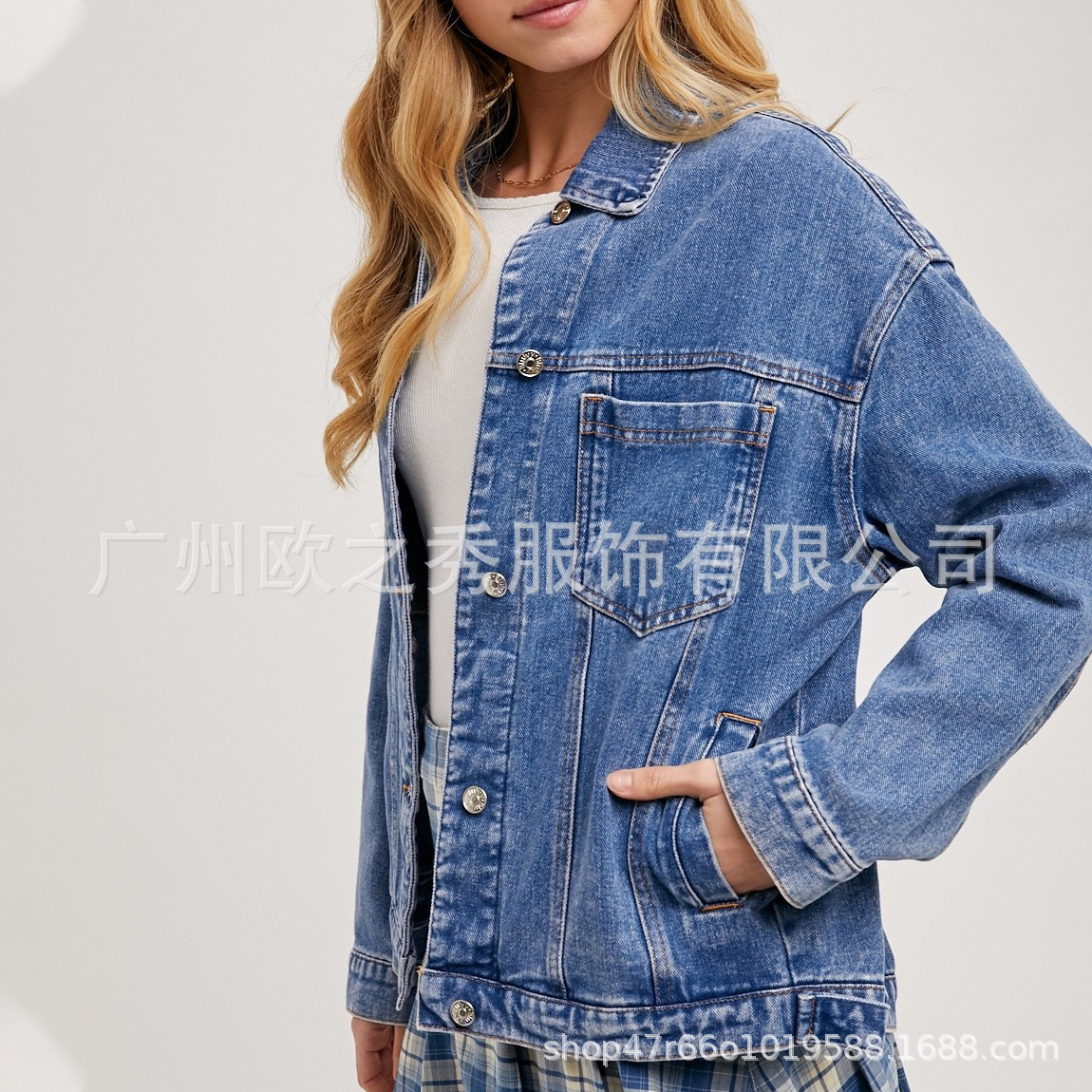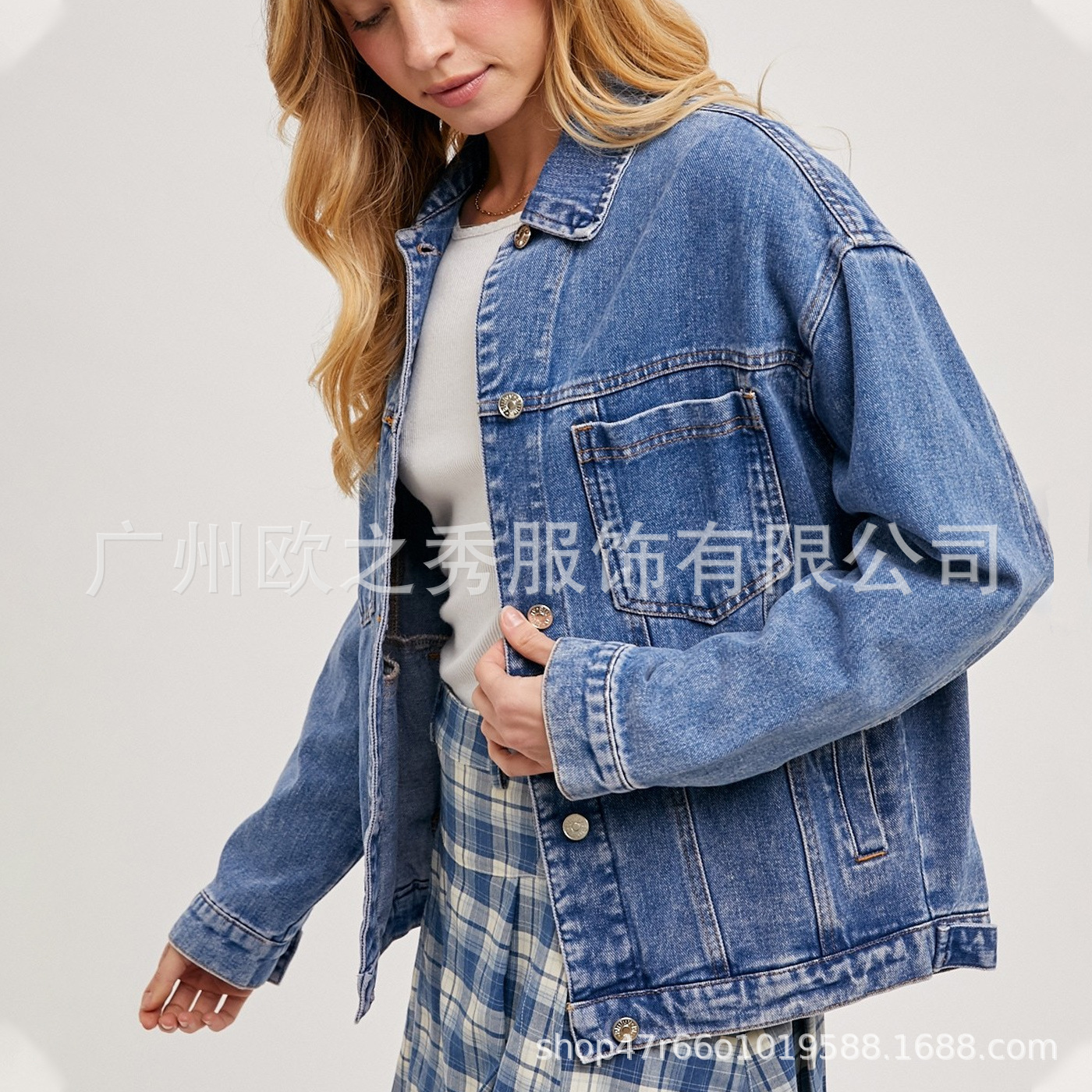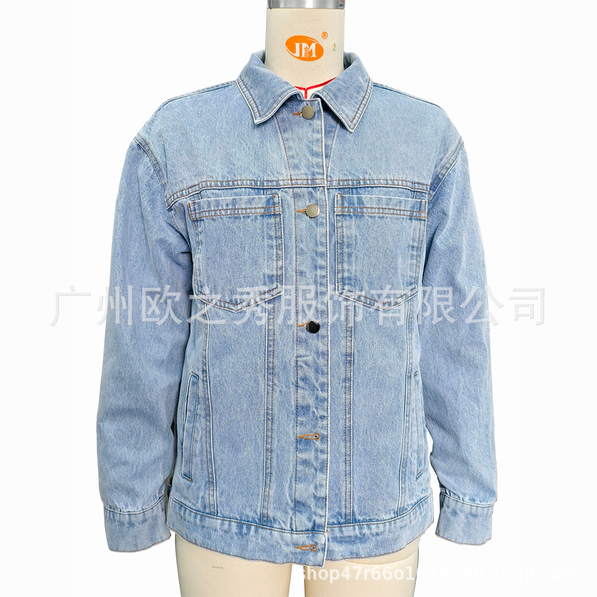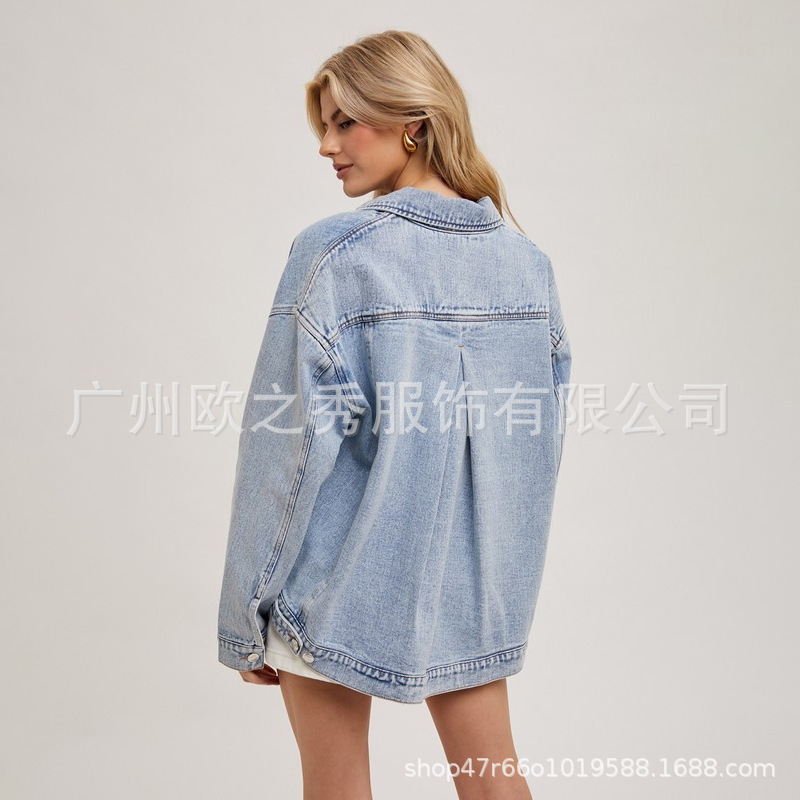 2025 새로운 유럽과 미국의 여성용 데님 재킷 단색 느슨한 긴팔 워시 라펠 데님 재킷 여성용스토어 가기
