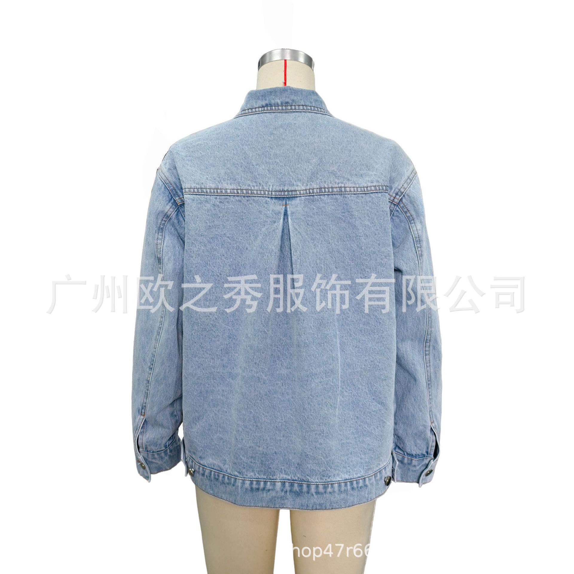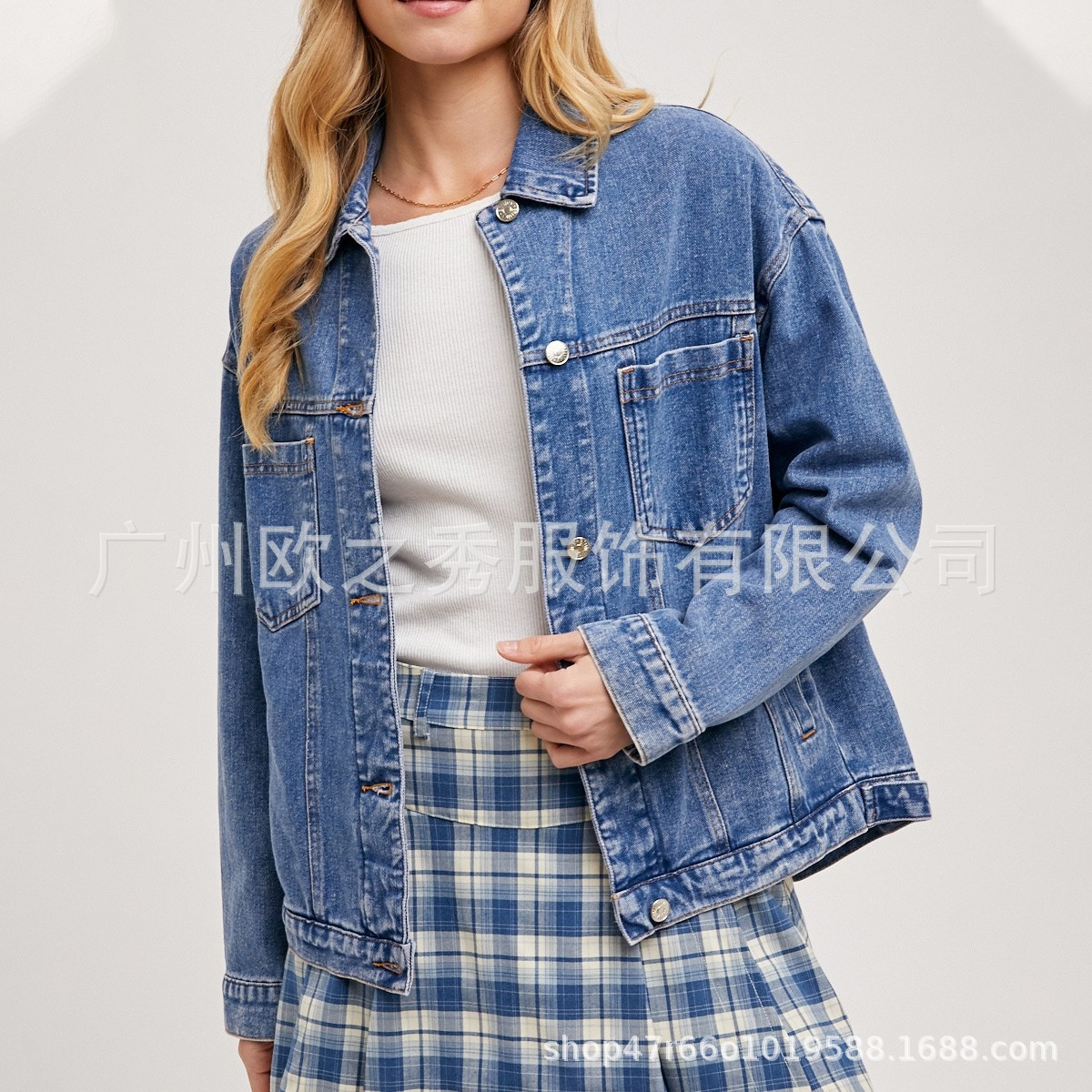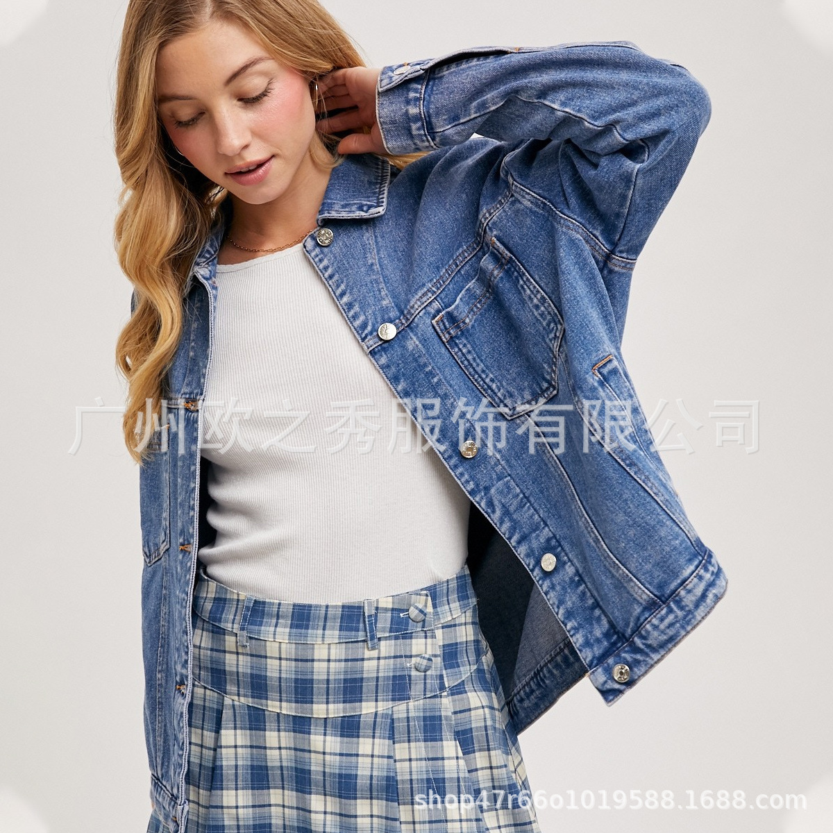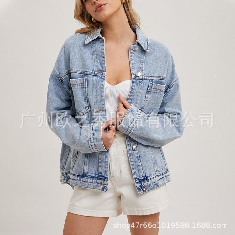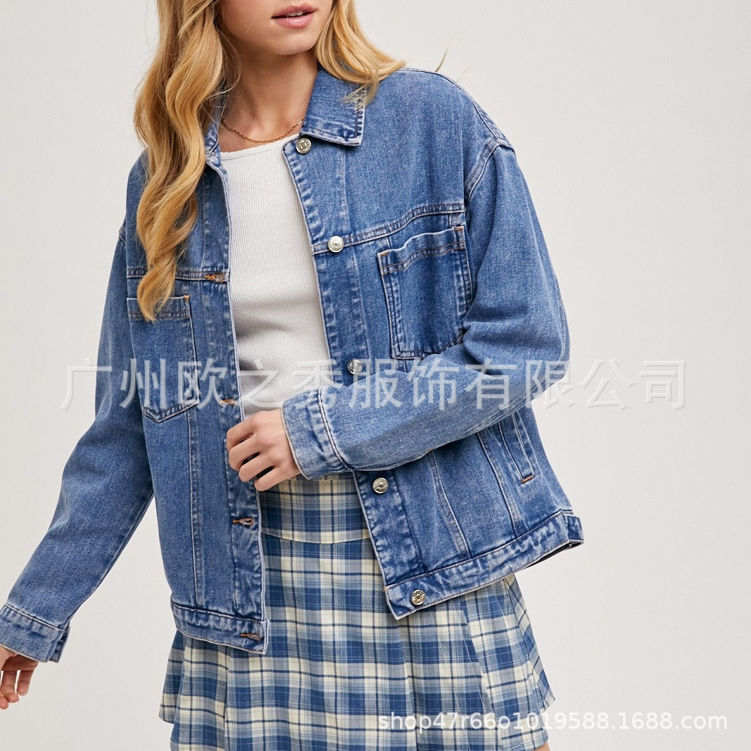 2025 새로운 유럽과 미국의 여성용 데님 재킷 단색 느슨한 긴팔 워시 라펠 데님 재킷 여성용스토어 가기