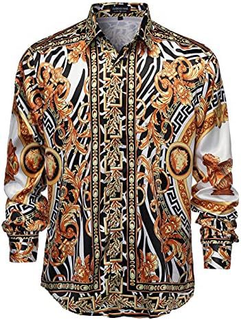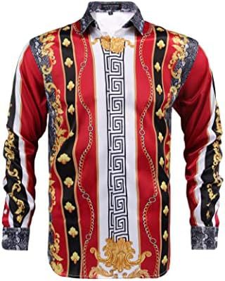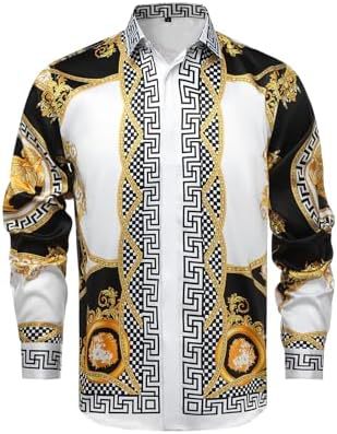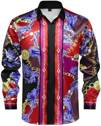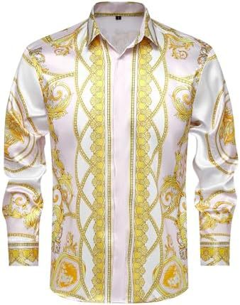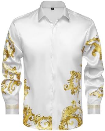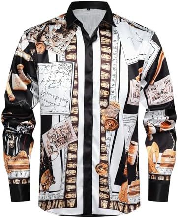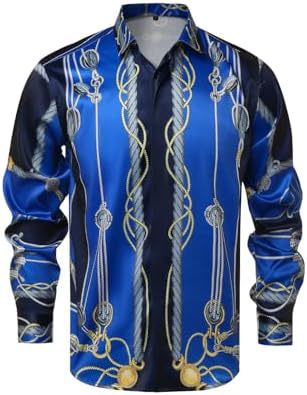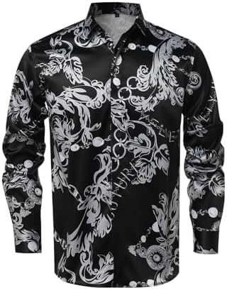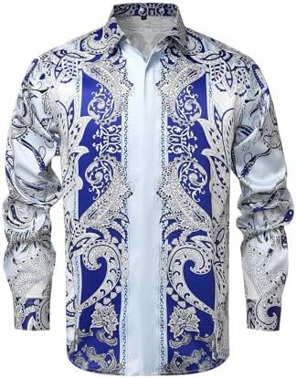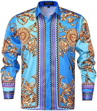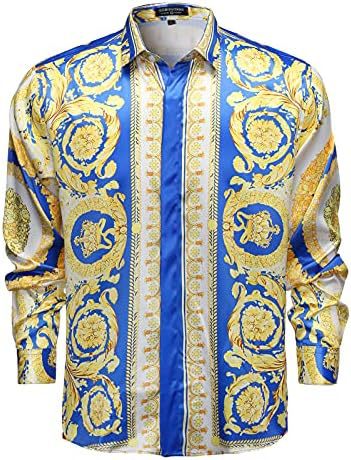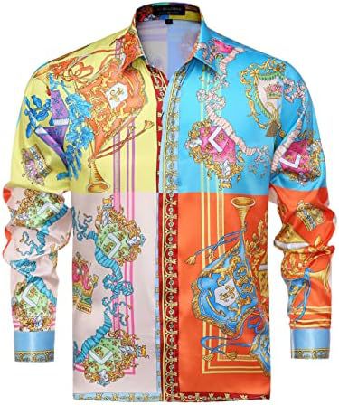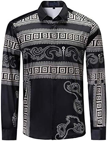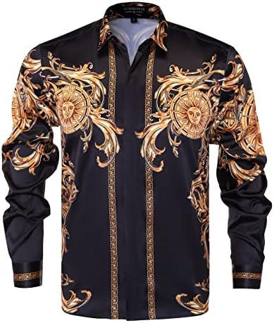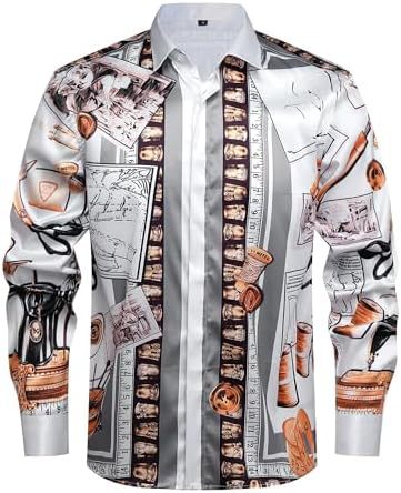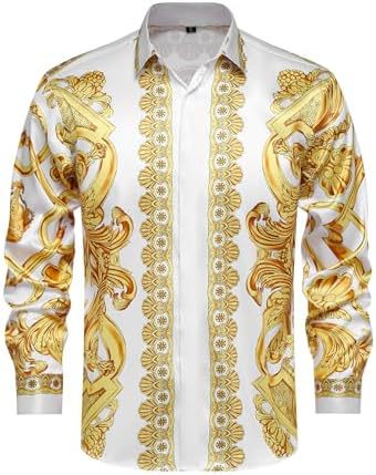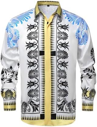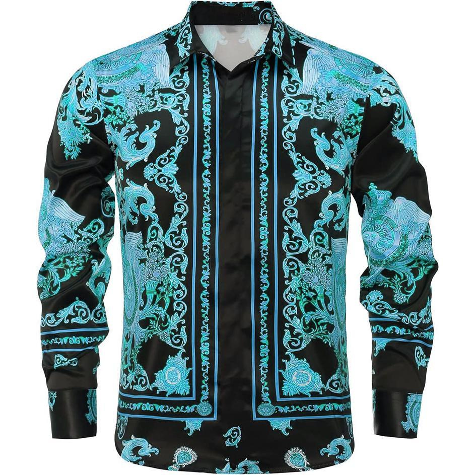 남성 럭셔리 브랜드 인쇄 실크 같은 새틴 버튼 업 드레스 셔츠 파티 댄스 파티 긴 소매 슬림 피트스토어 가기
