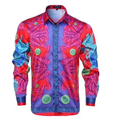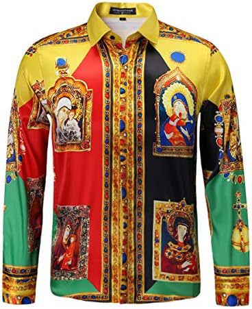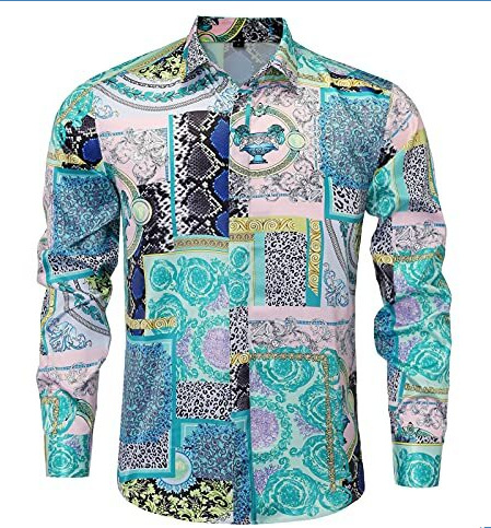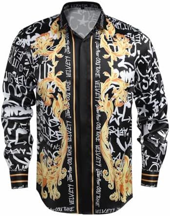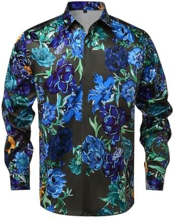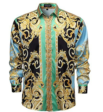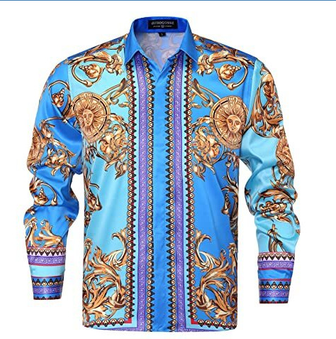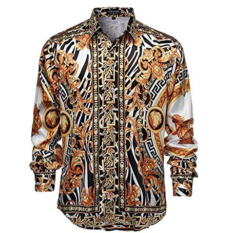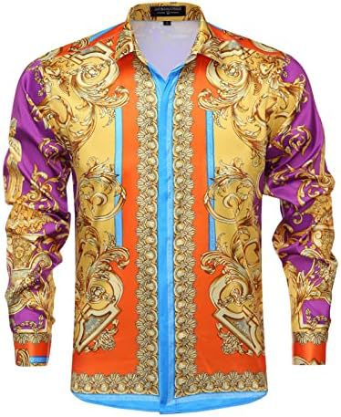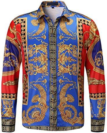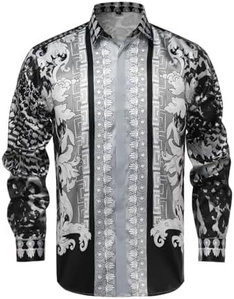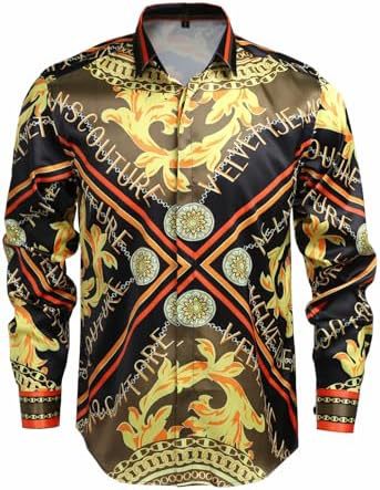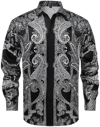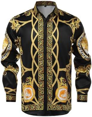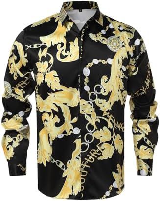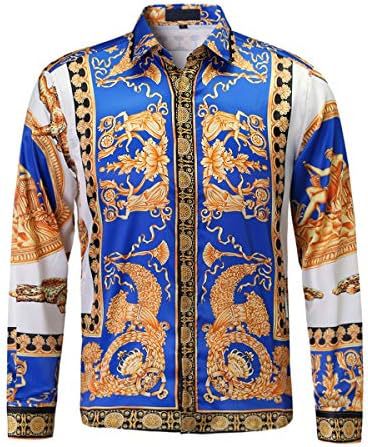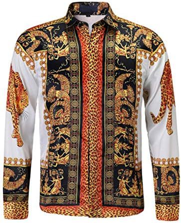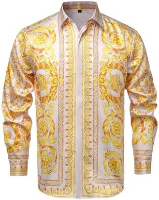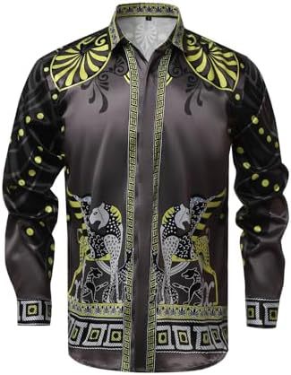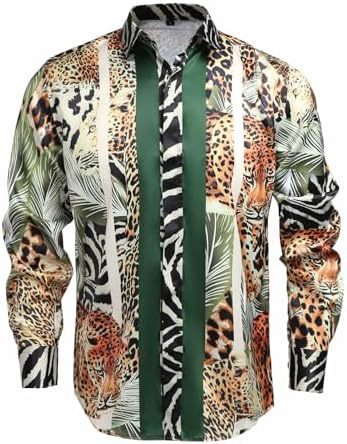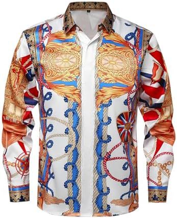 남성 럭셔리 브랜드 인쇄 실크 같은 새틴 버튼 업 드레스 셔츠 파티 댄스 파티 긴 소매 슬림 피트스토어 가기