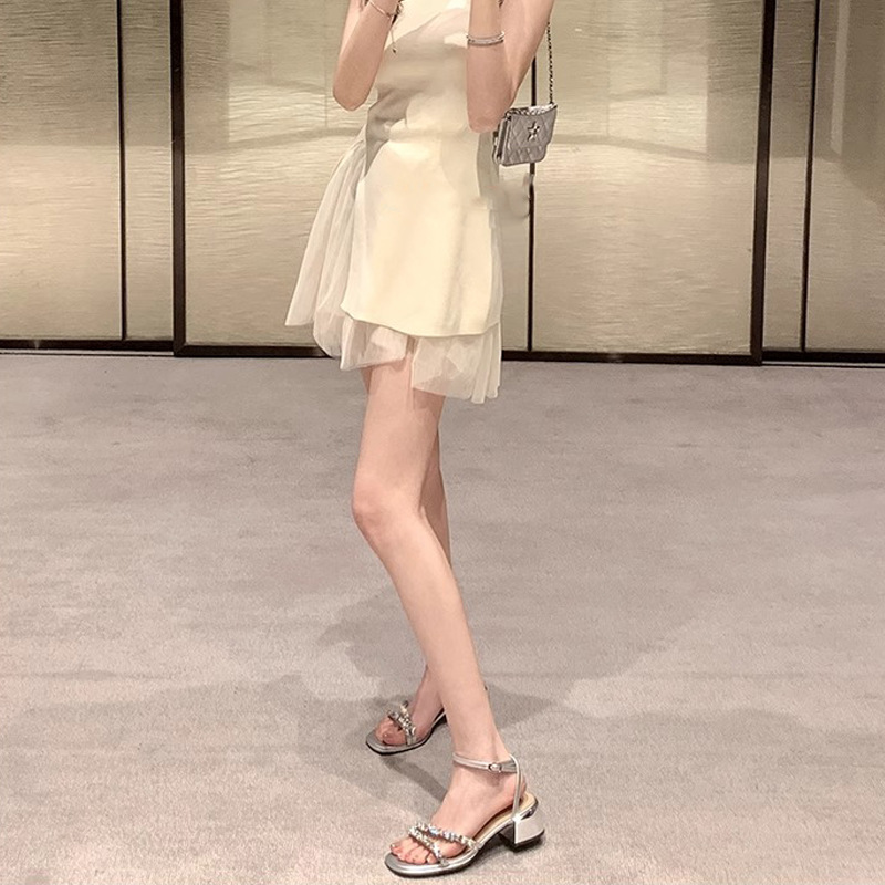 2025 Su Yinyin Rock Candy Fairy 여름 새 스타일 원 스트랩 샌들 여성용 프렌치 라인스톤 오픈 토우 두꺼운 하이힐 샌들