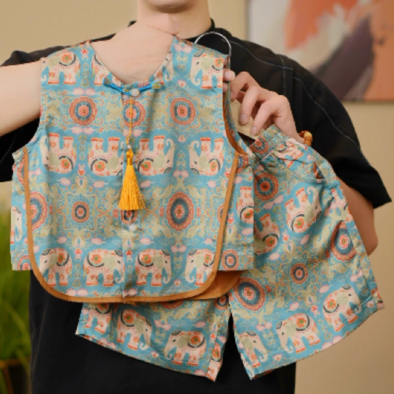 어린이 아기 중국 스타일 조끼 반바지 2025 여름 소년과 소녀 고급 자카드 조끼 아기 투피스 세트