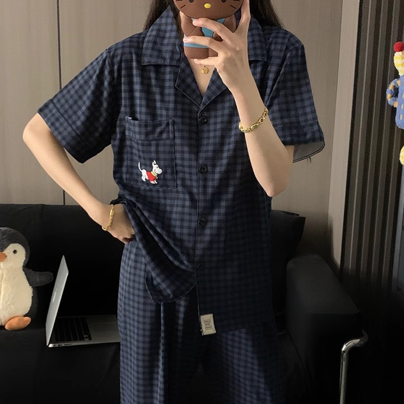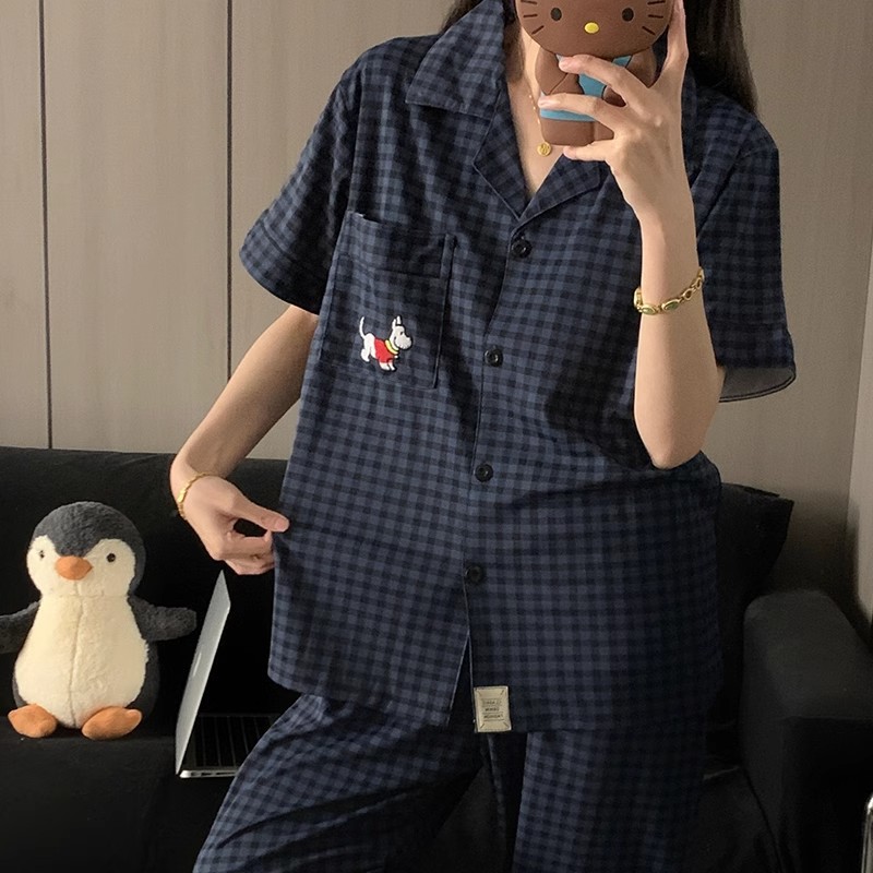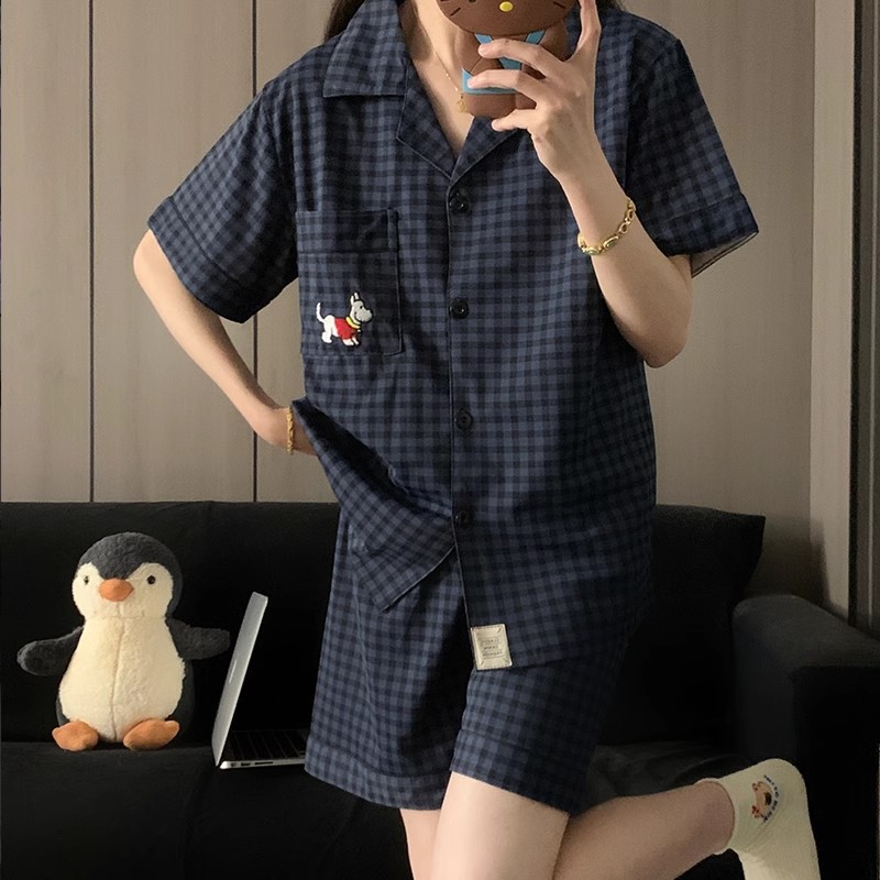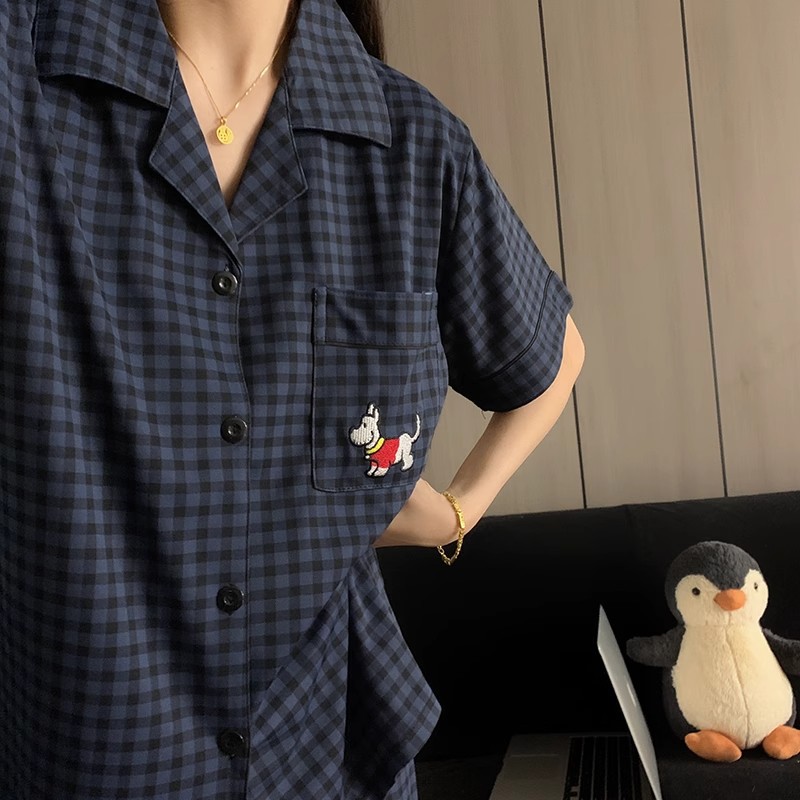 • 플레인블루 체크 강아지 [반팔+반바지+바지]