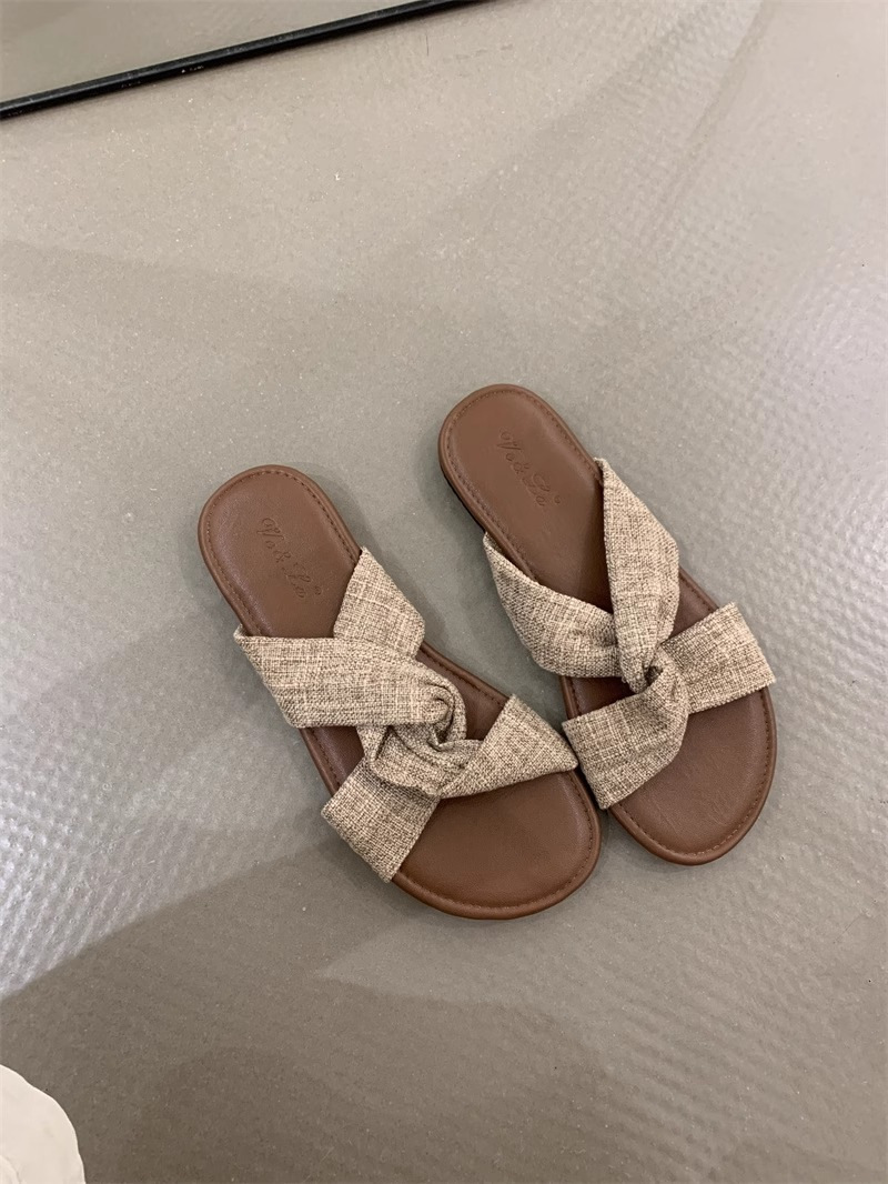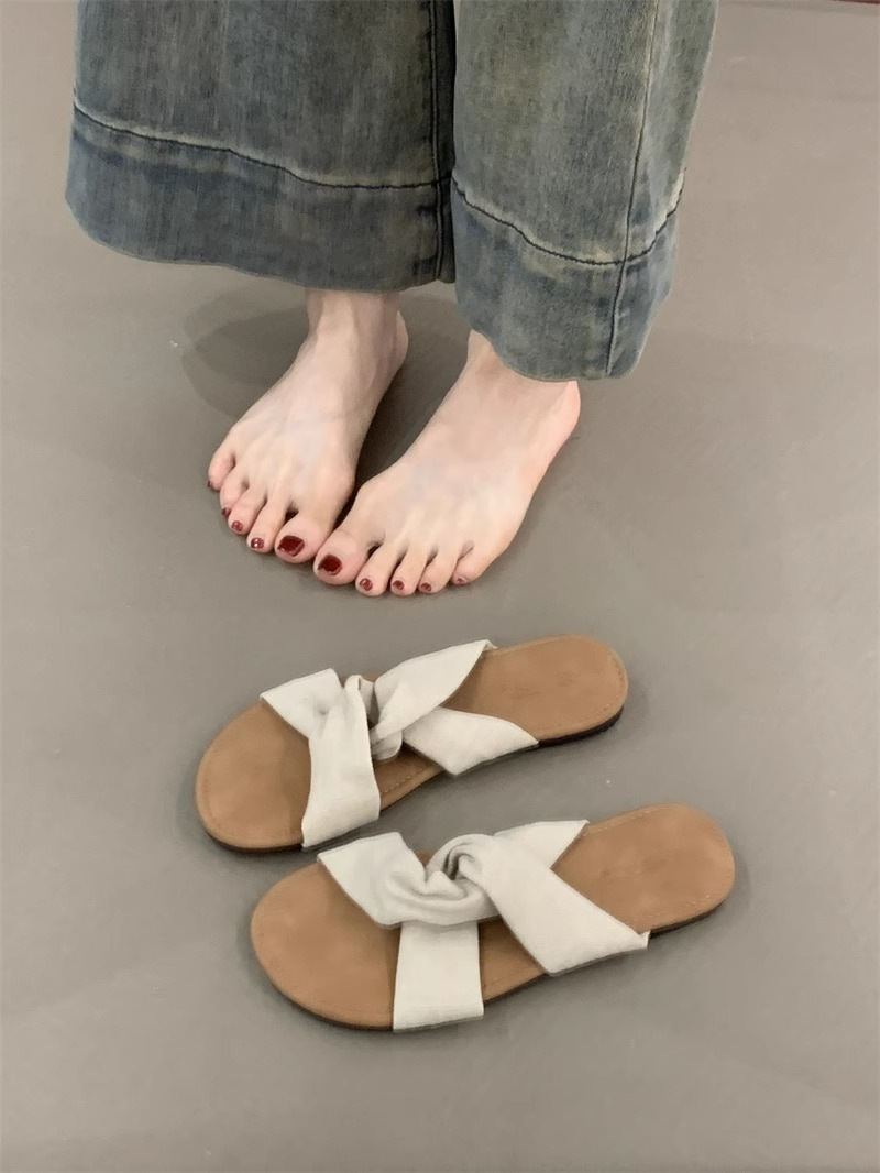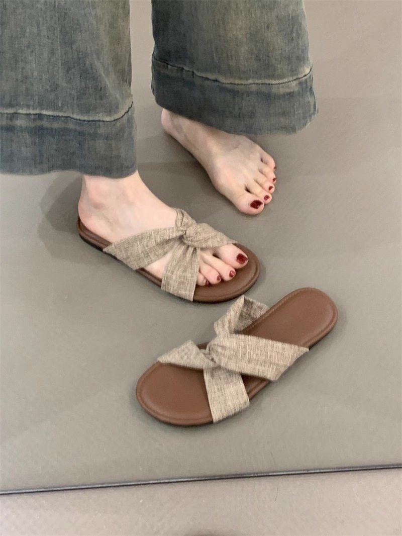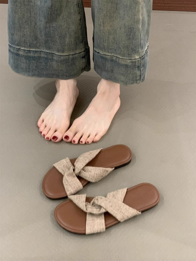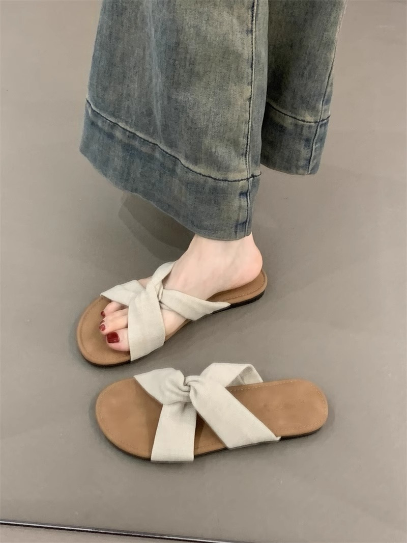 여름 아우터용 여성용 크로스 스트랩 오픈 토 플랫 슬리퍼 2025 새로운 요정 스타일 캐주얼 휴가 비치 샌들