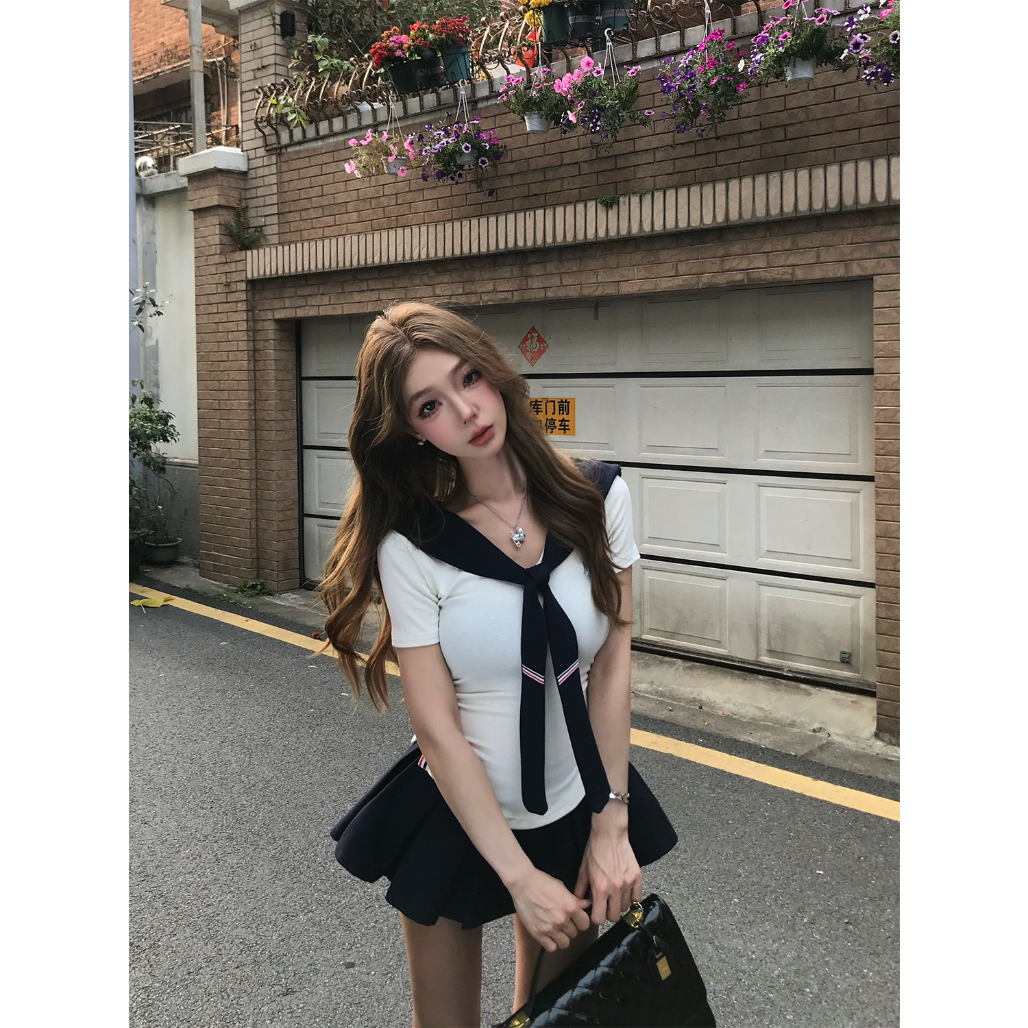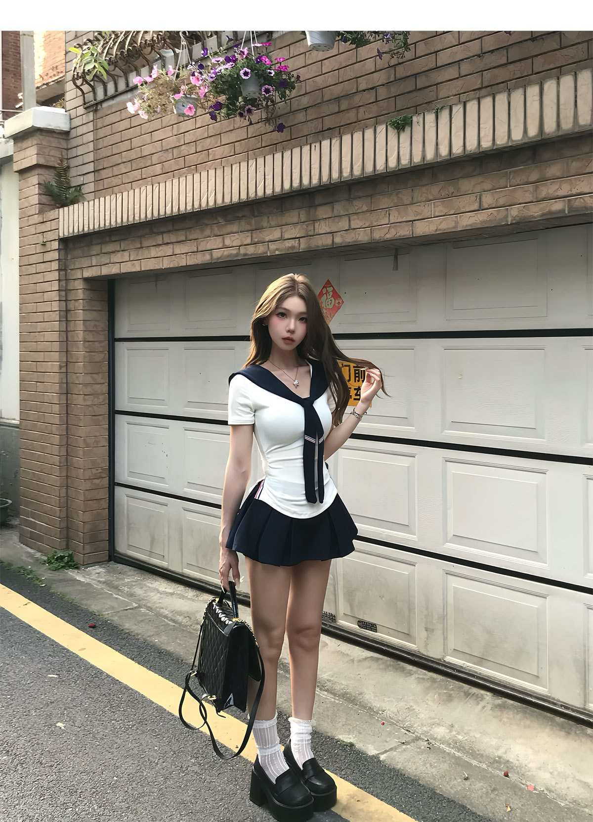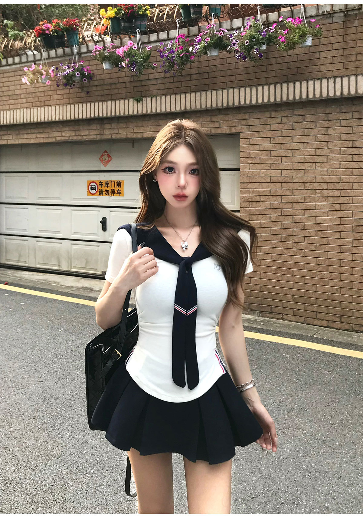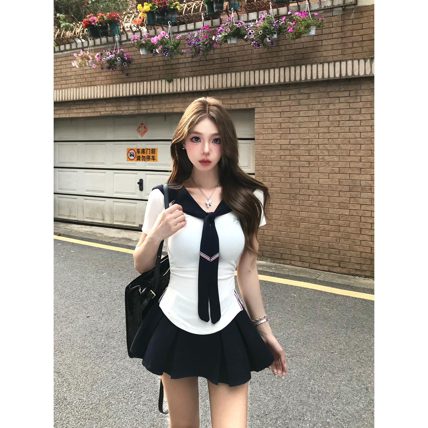 Pure Desire College Style jk 유니폼 핀치 허리 슬림 반팔 티셔츠 탑 여성 핫 소녀 플리츠 스커트 3 피스 슈트 여름스토어 가기