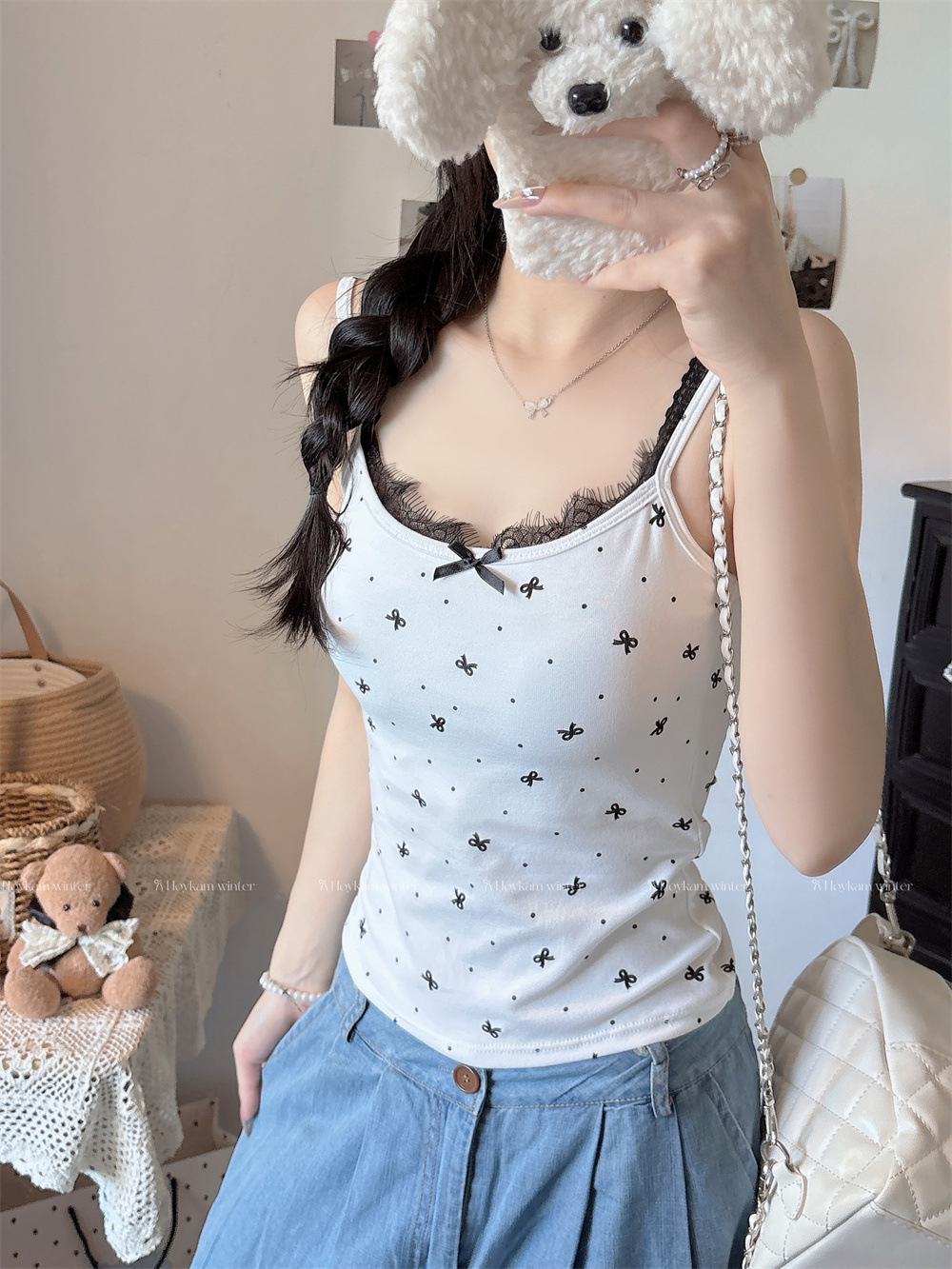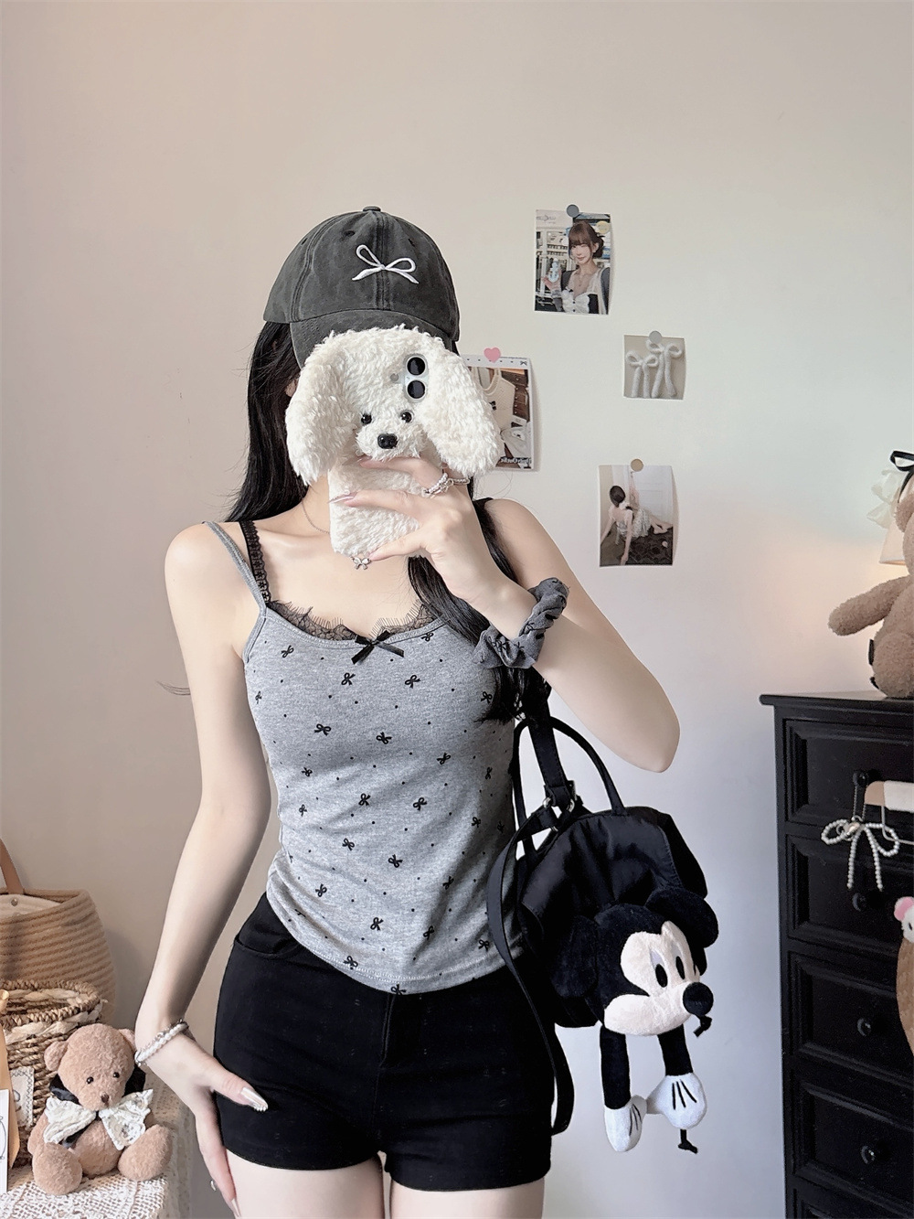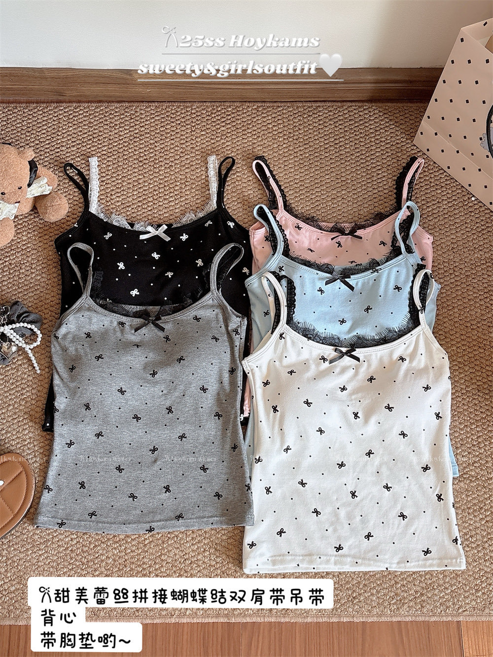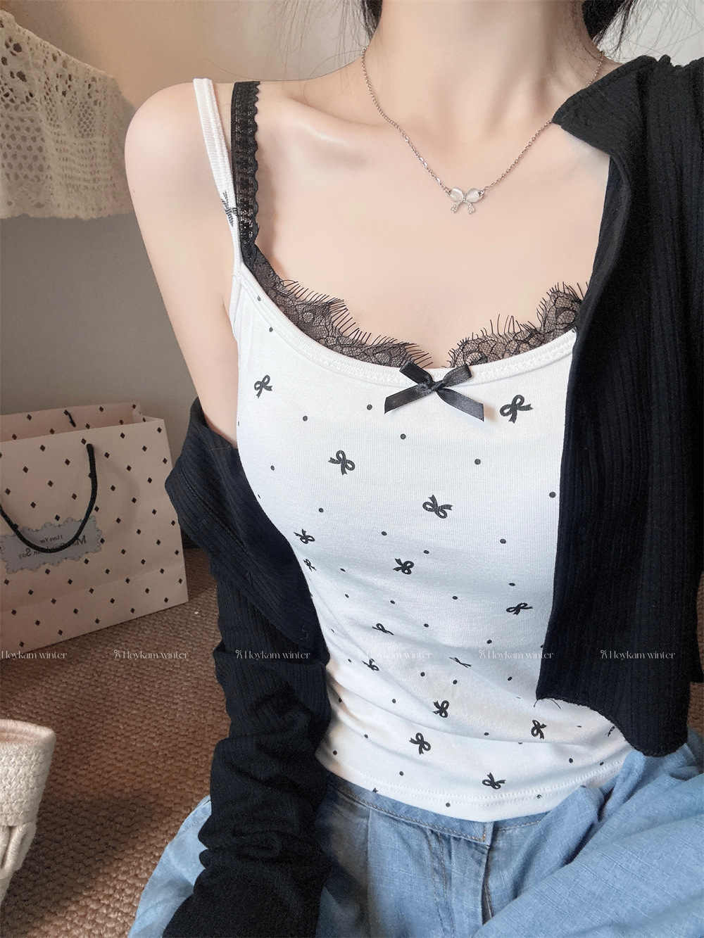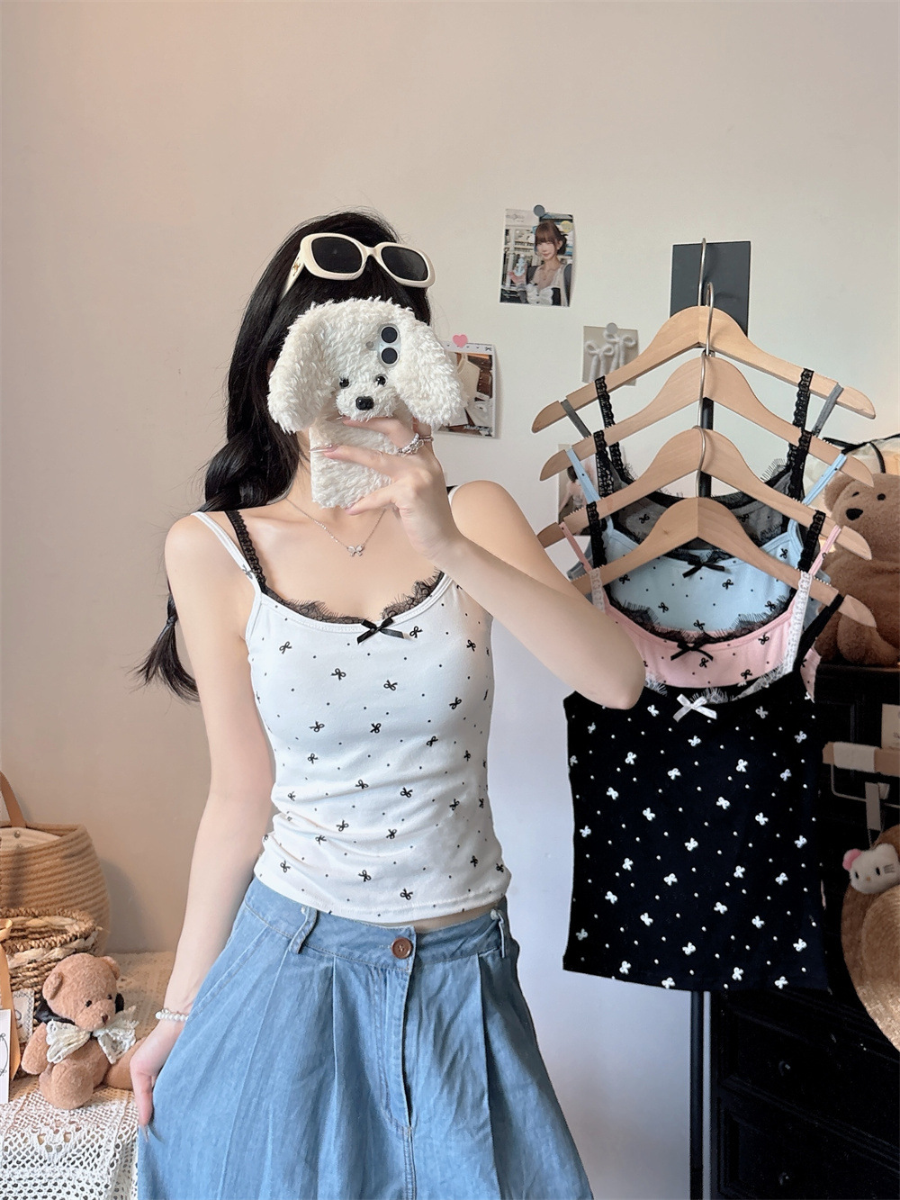6116 # 여성용 한국식 달콤한 레이스 보우 캐미솔 여름 슬림핏 짧은 아름다운 백 탑(가슴 패드 포함)스토어 가기