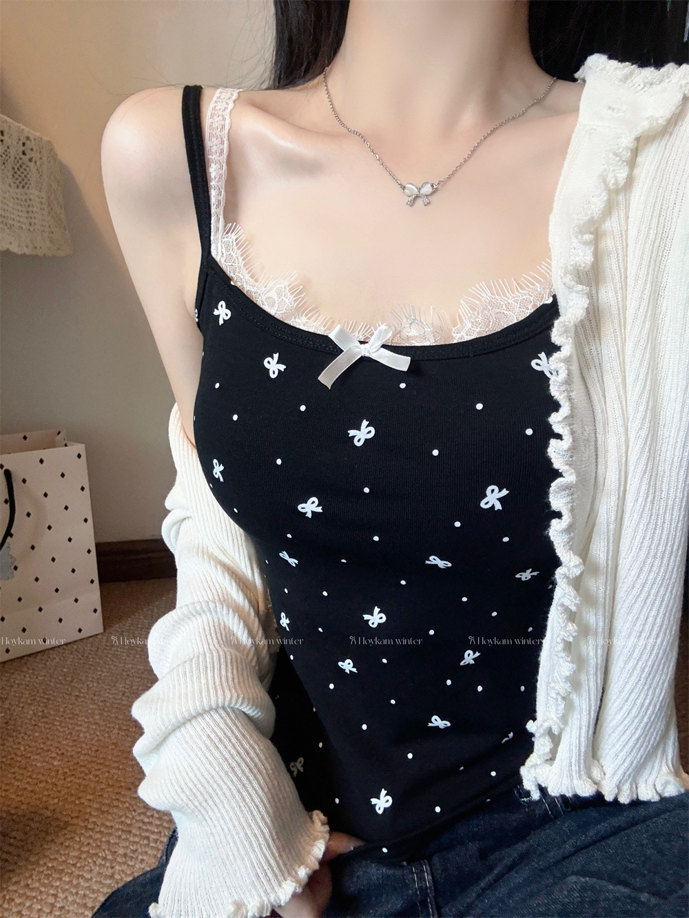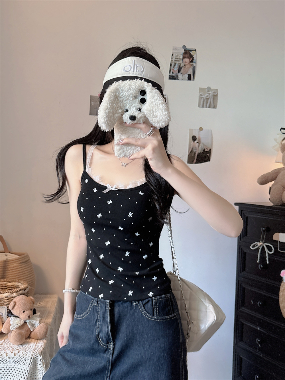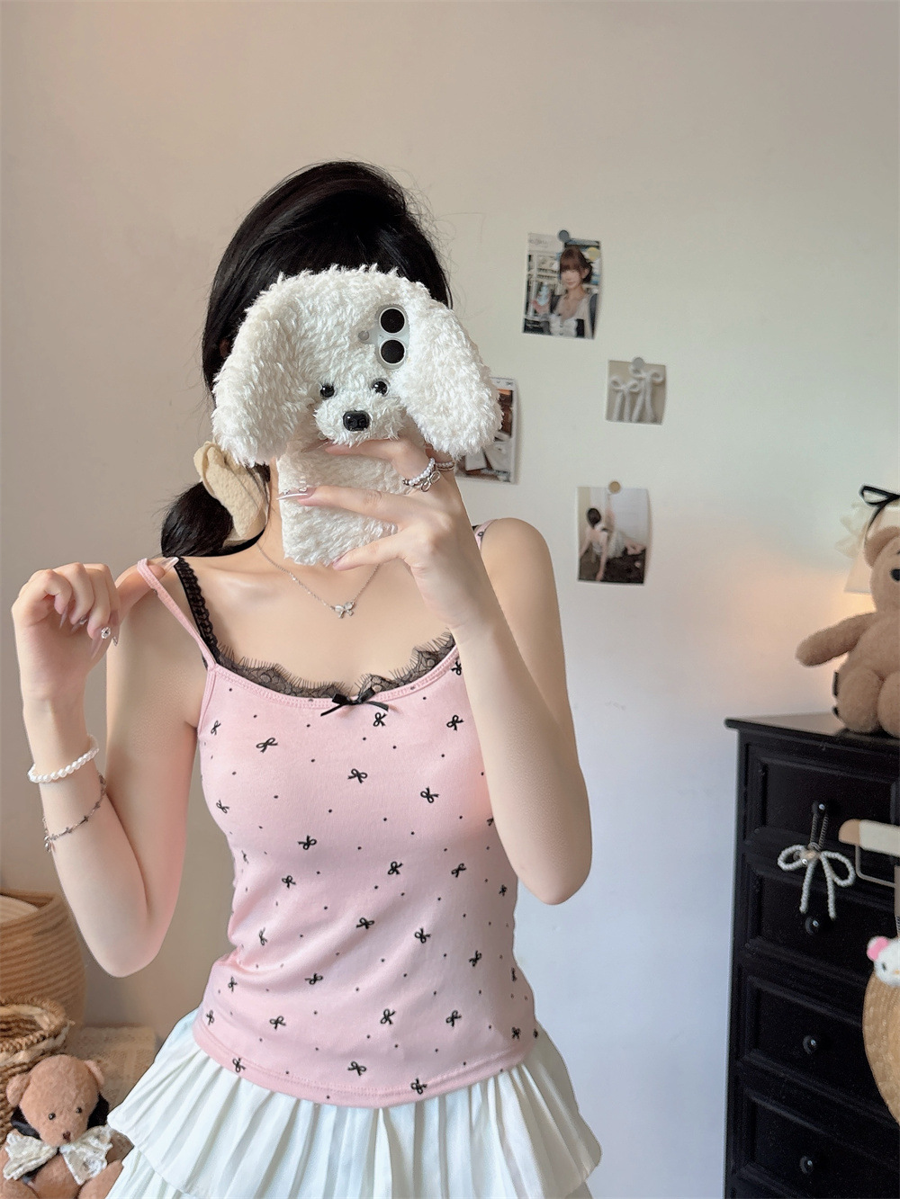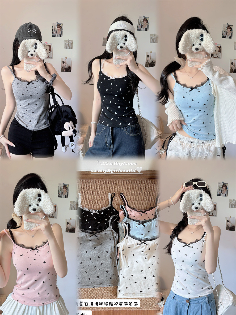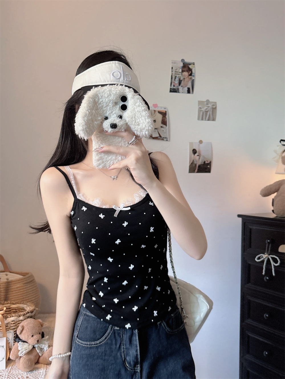 6116 # 여성용 한국식 달콤한 레이스 보우 캐미솔 여름 슬림핏 짧은 아름다운 백 탑(가슴 패드 포함)스토어 가기