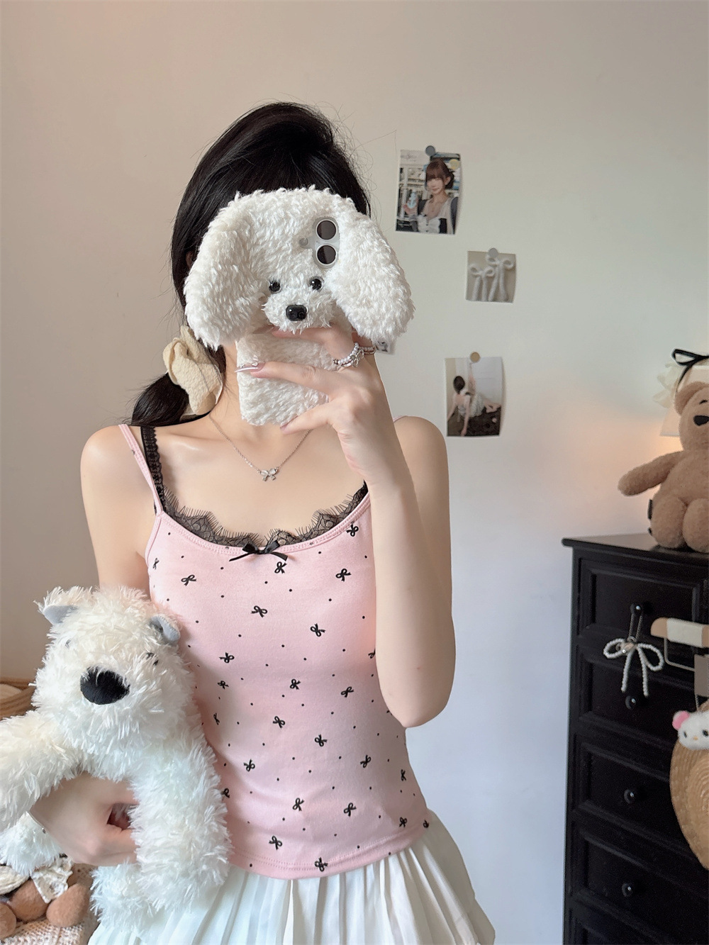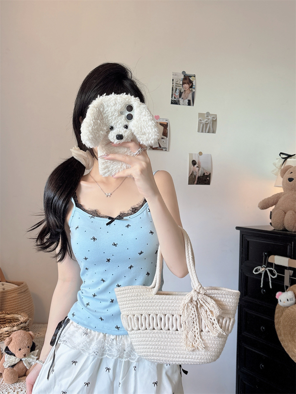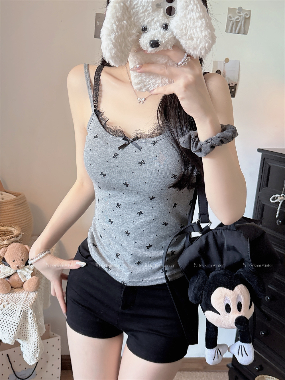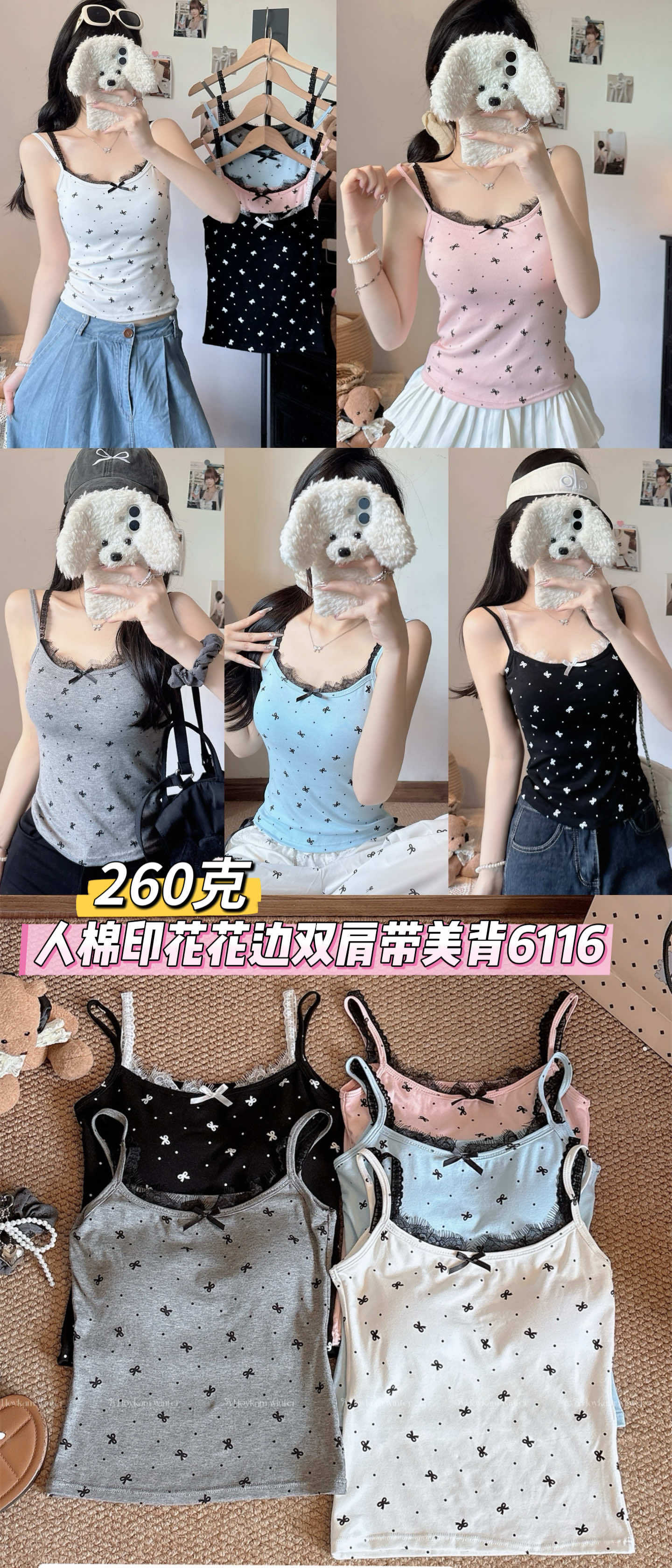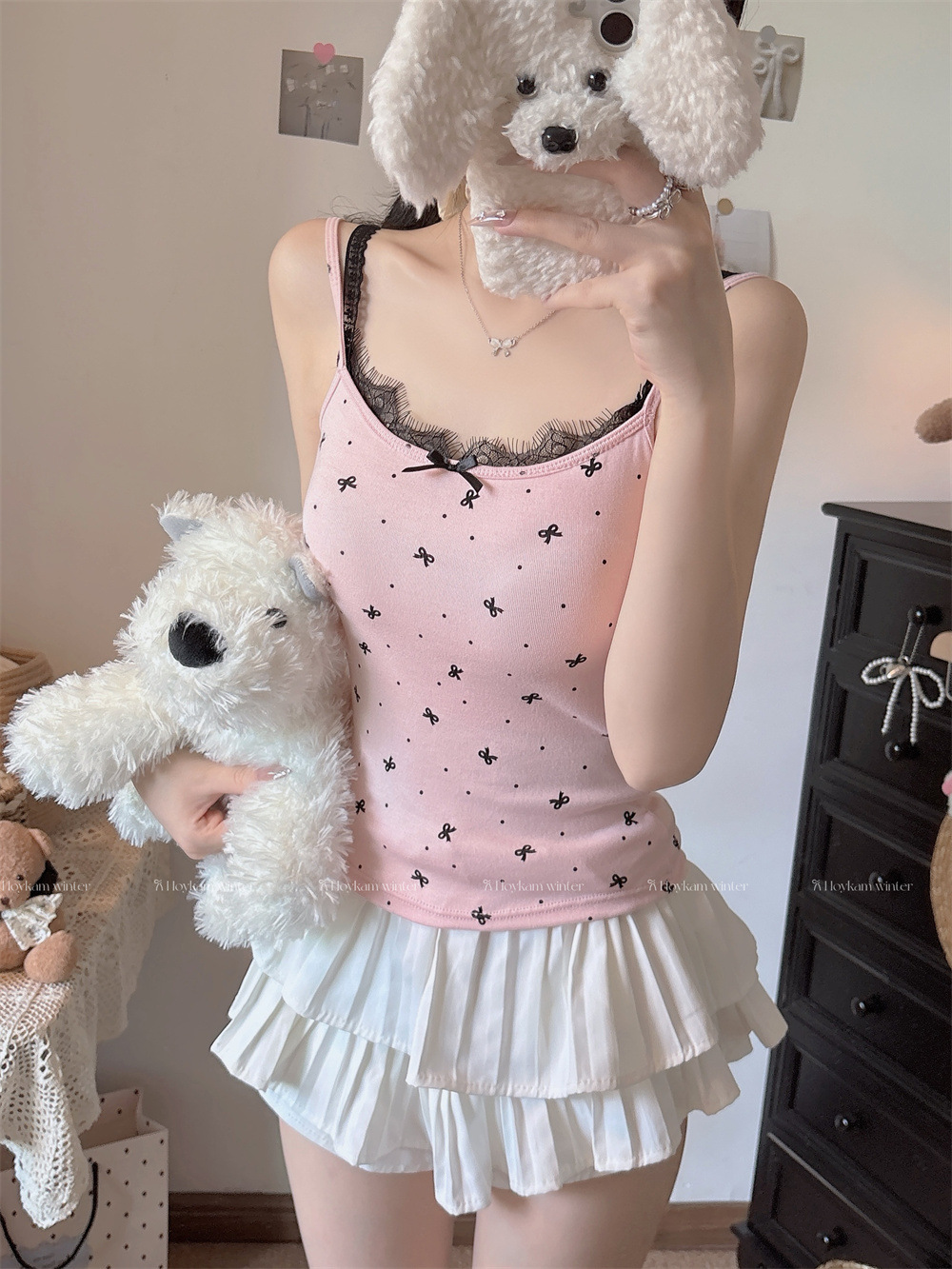 6116 # 여성용 한국식 달콤한 레이스 보우 캐미솔 여름 슬림핏 짧은 아름다운 백 탑(가슴 패드 포함)스토어 가기