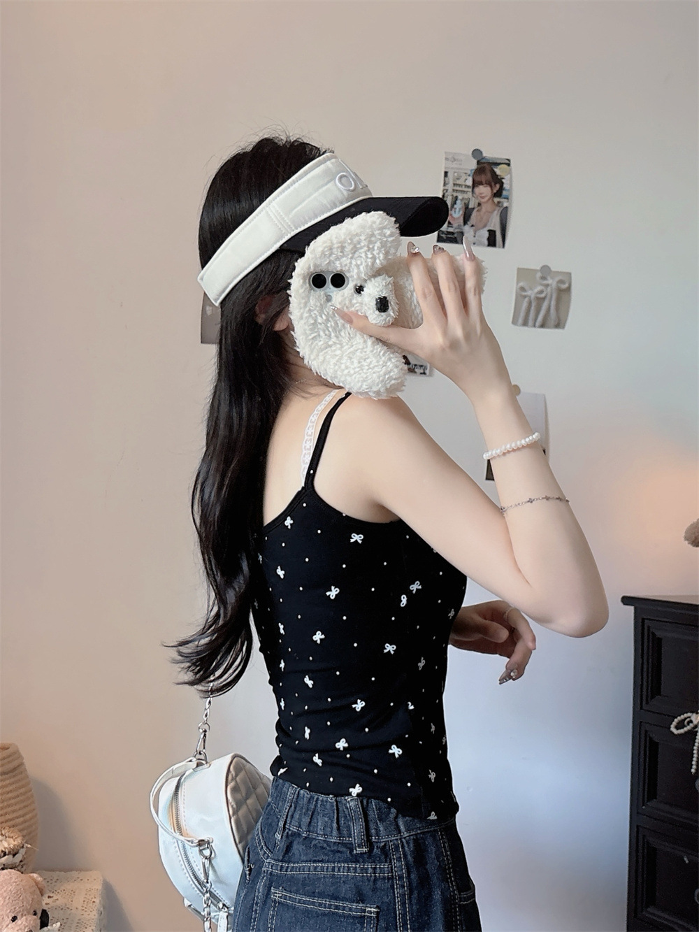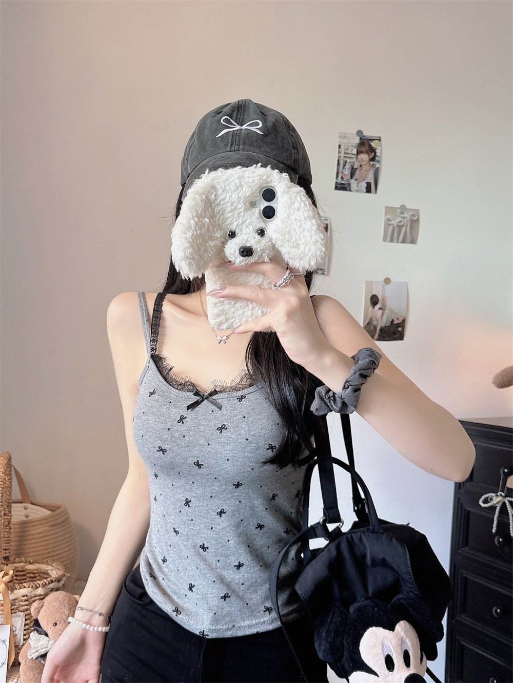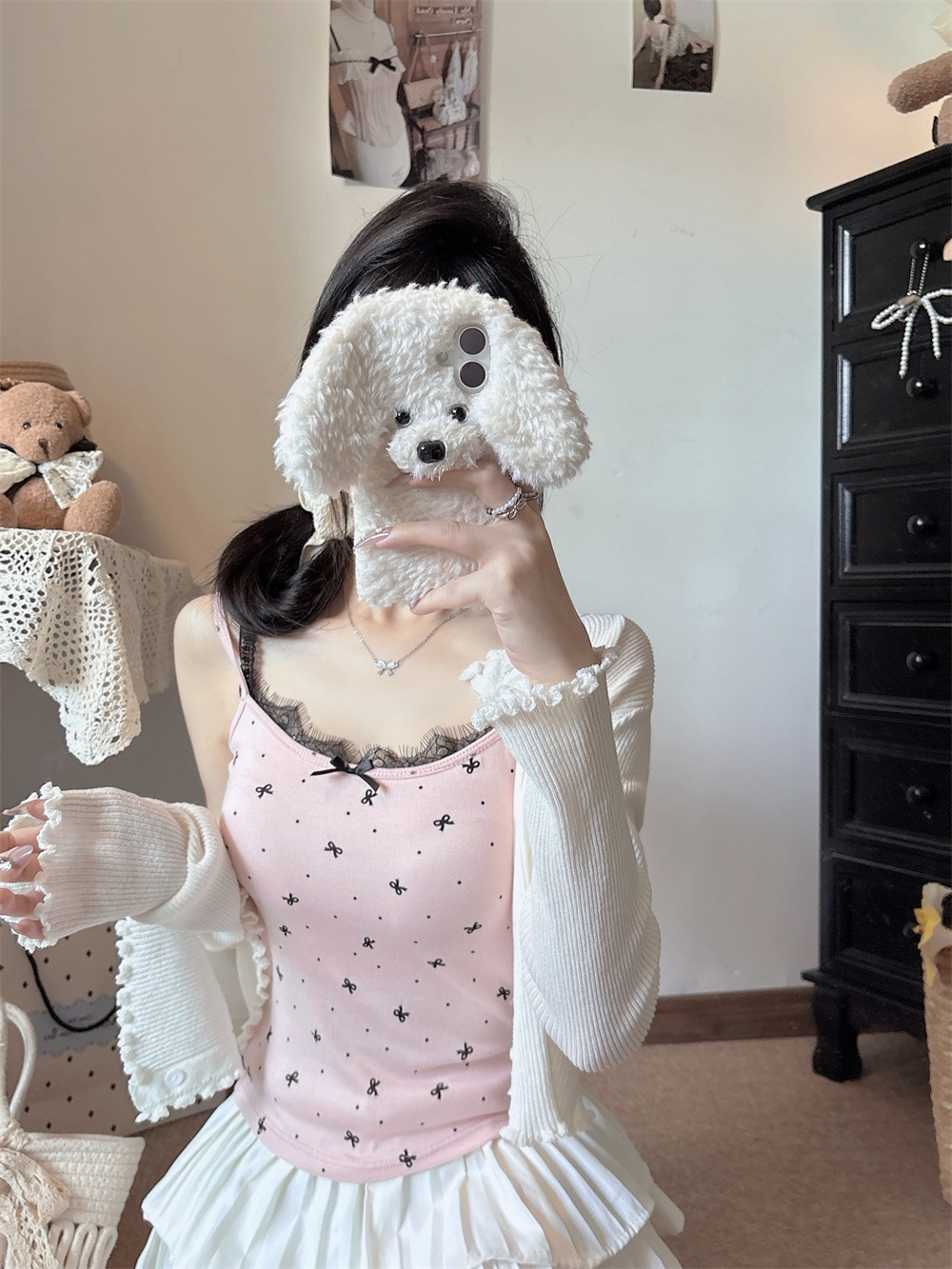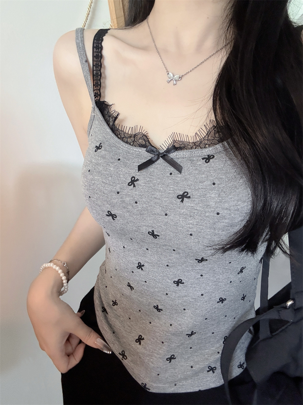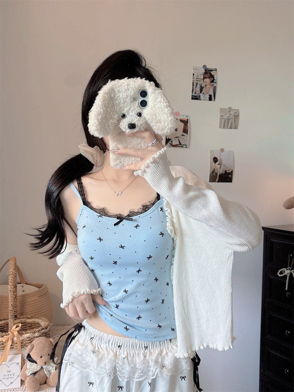6116 # 여성용 한국식 달콤한 레이스 보우 캐미솔 여름 슬림핏 짧은 아름다운 백 탑(가슴 패드 포함)스토어 가기