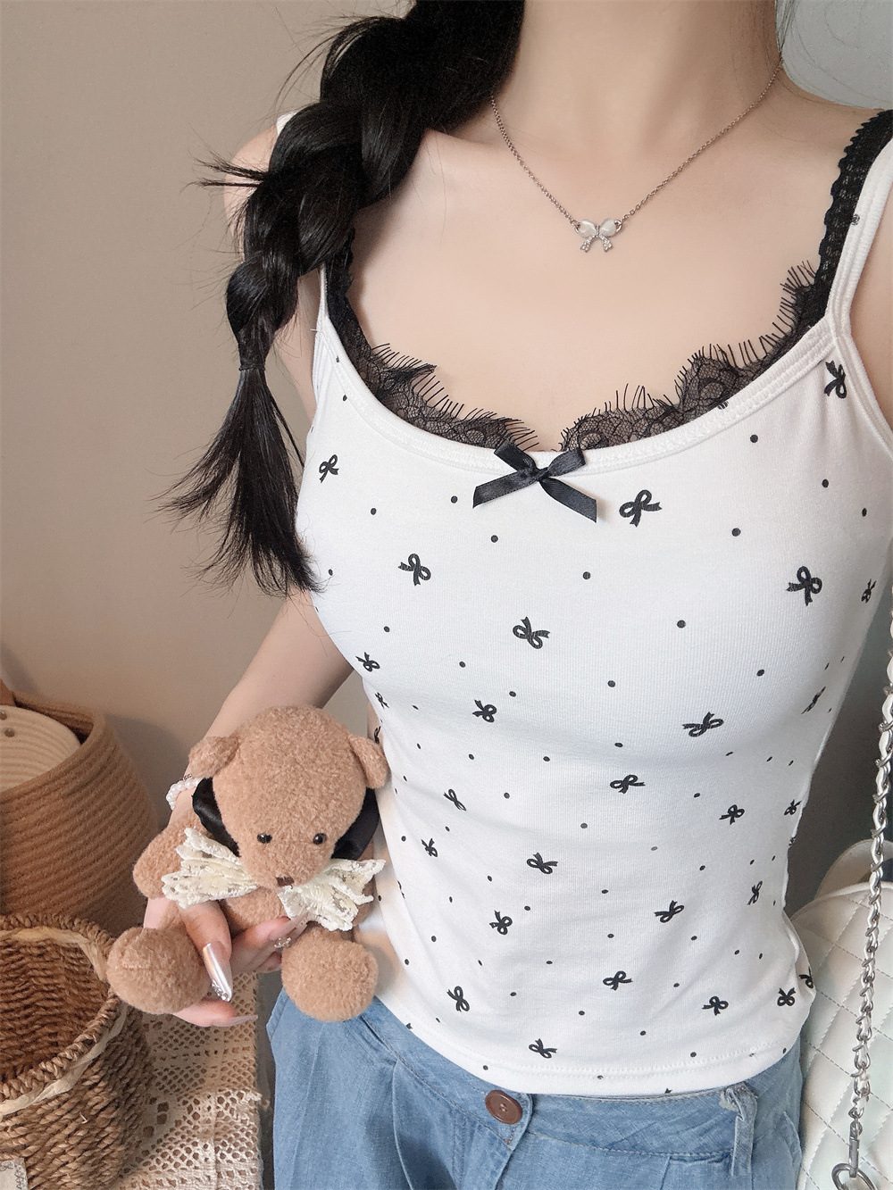 6116 # 여성용 한국식 달콤한 레이스 보우 캐미솔 여름 슬림핏 짧은 아름다운 백 탑(가슴 패드 포함)